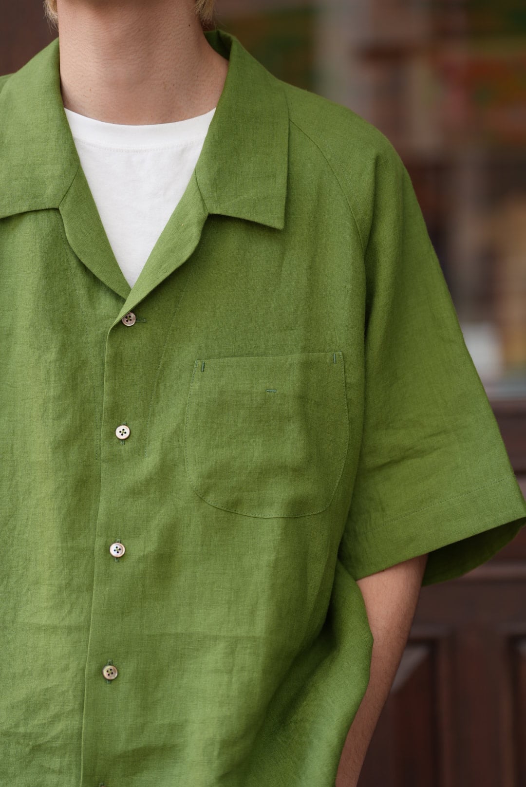 Gorsch the merry coachman(ゴーシュザメリーコーチマン) 26SS "European Linen Open Collar Raglan Short Sleeve Shirt" -Olive Green-