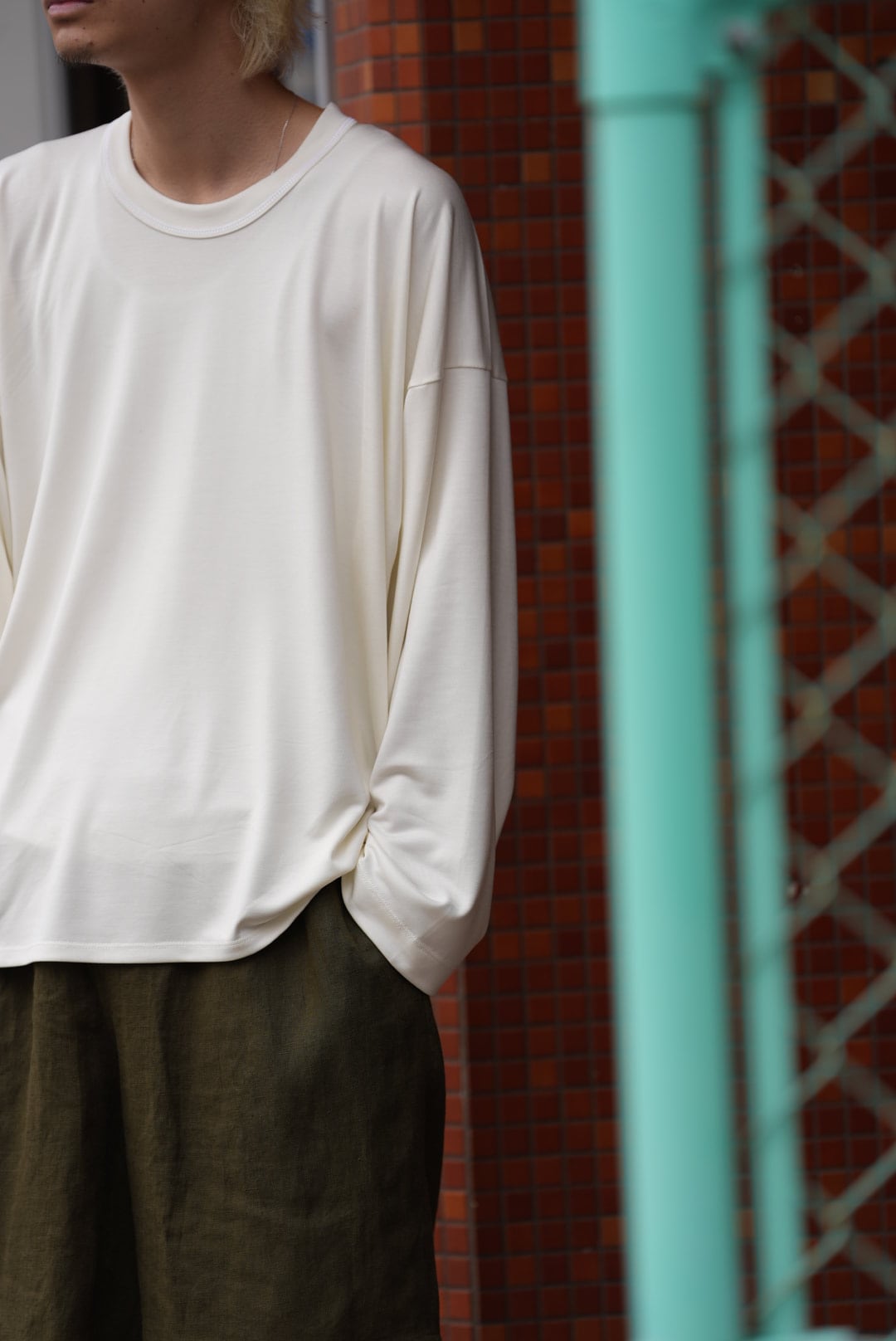 単に着心地がいいだけでなく、前後差のある着丈で後ろがラウンドしており、袖や裾にリブはなくストンと落ちながら野暮ったくならないような綺麗なシルエットと、デザインも洗練されています。生地感やデザイン的に1枚で着用できながら、程よくゆとりのあるサイズ感なのでジャケットやブルゾンのインナーとしても着用できます。こちらであればインナーとして羽織るアイテムの着心地の良さを損なうことなく極上の肌触りで快適に着用でき、合わせる羽織りによっては裾の見え方がいいアクセントになってくれそうです。