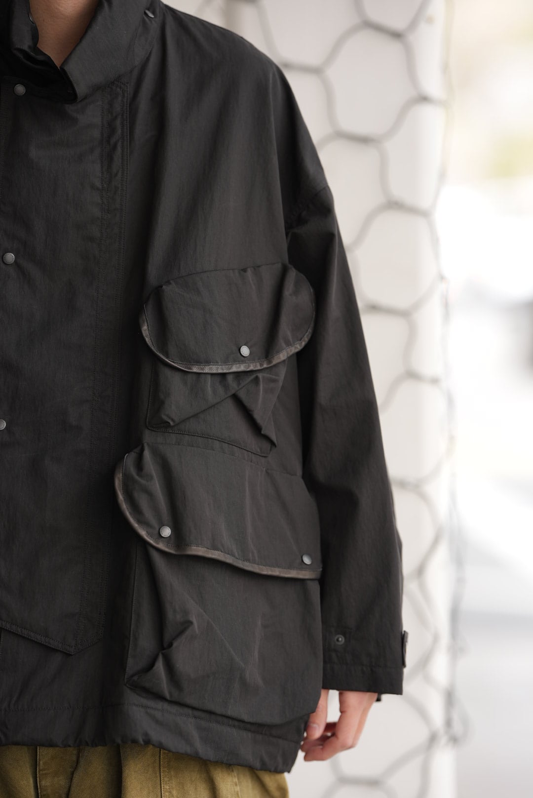 SH04と同じ開きのラグランタイプの半そでシャツです。衿から繋がるラペル部分が特徴的なカーブになっていますが、これは縫製ミスから生まれた形です。自分で縫っているからこそ、起きる面白いエラーに気づけます。そのエラーの形を型紙に写し取り、完成させました。