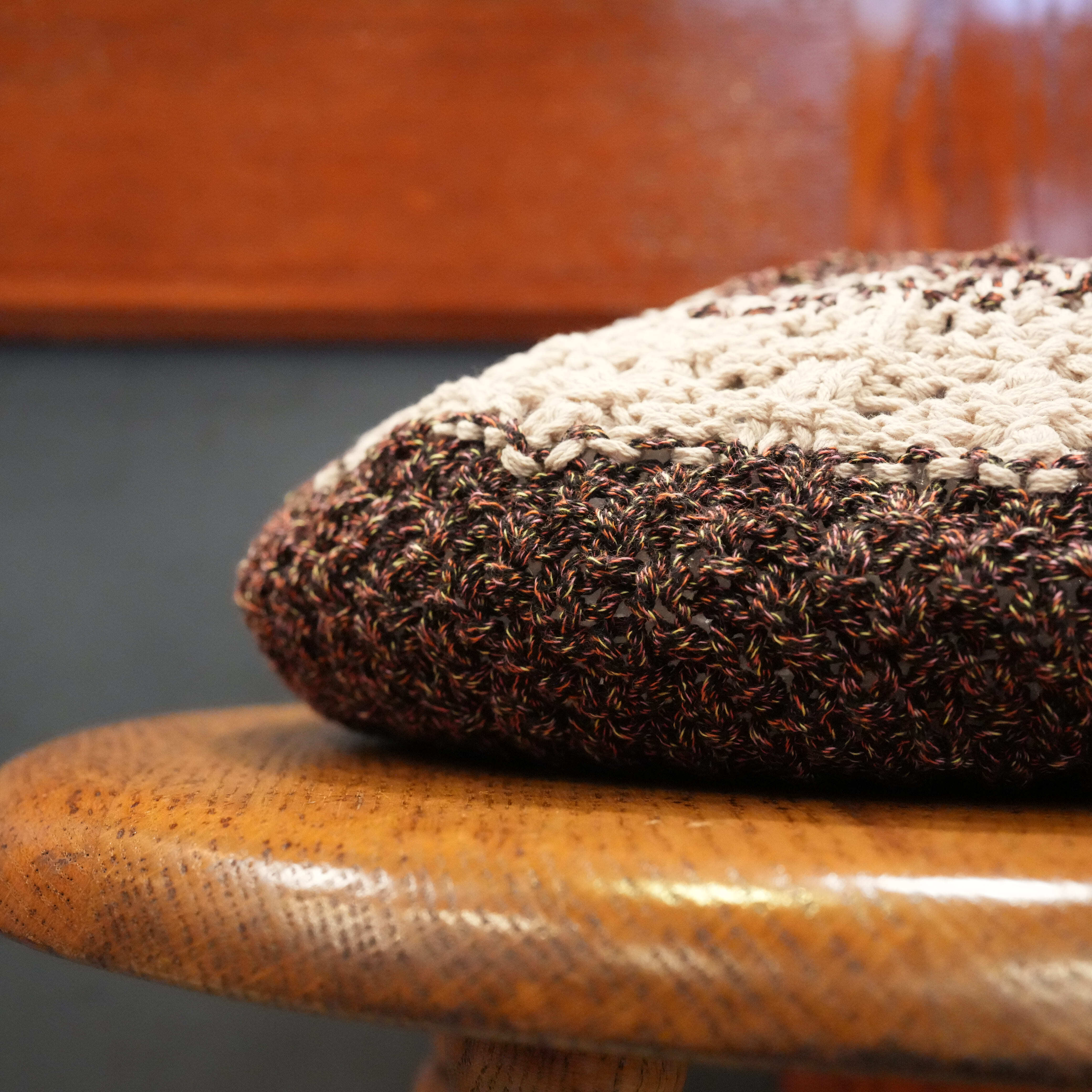 麻のようなドライタッチで清涼感のある撚杢糸を使用したニットタムベレー。ざっくりと編み立て程よいボリュームを持たせ、被り口部分を2重にすることでフィット性を高め、形付けができるように仕上げています。パターンの切り替えによる編み柄もポイントです。