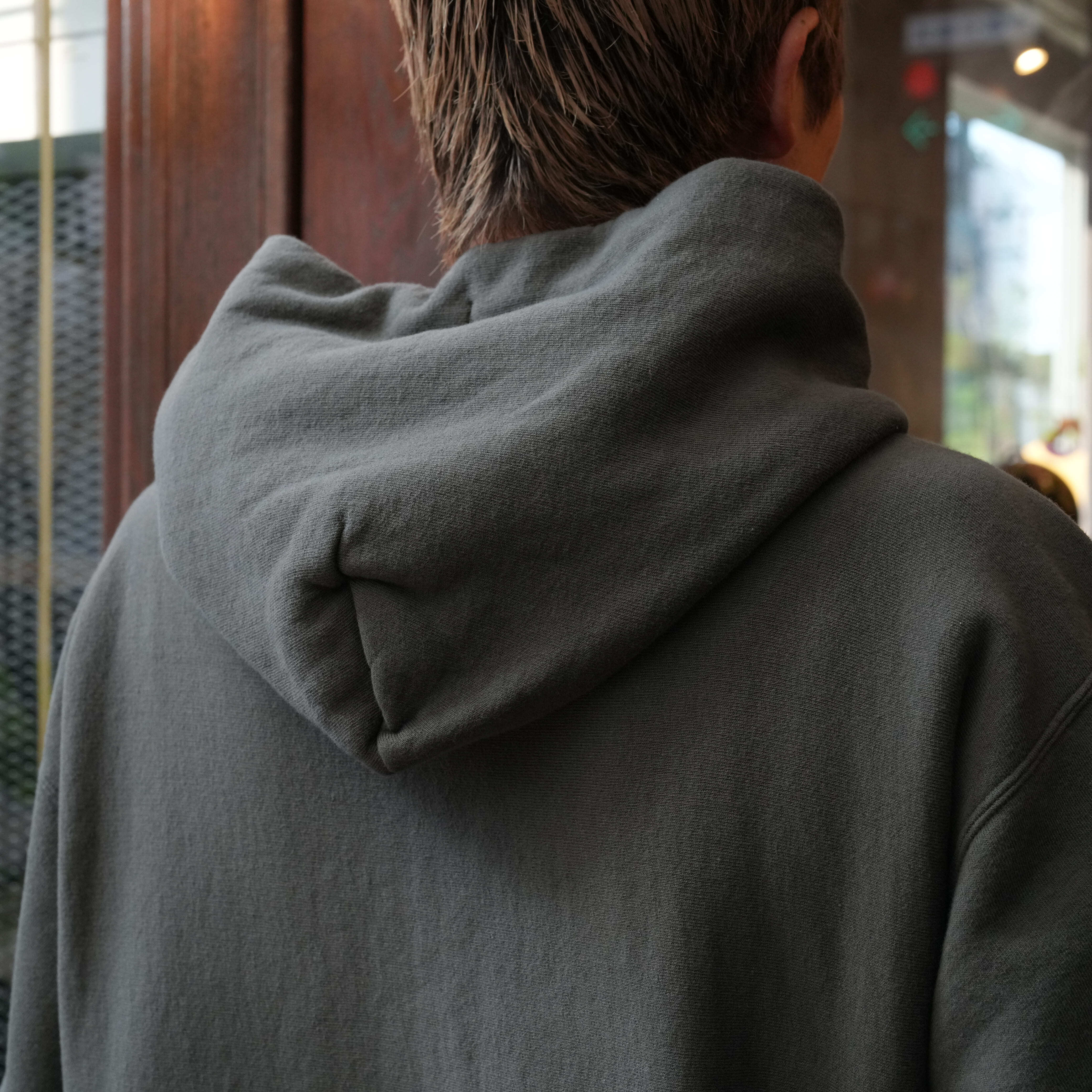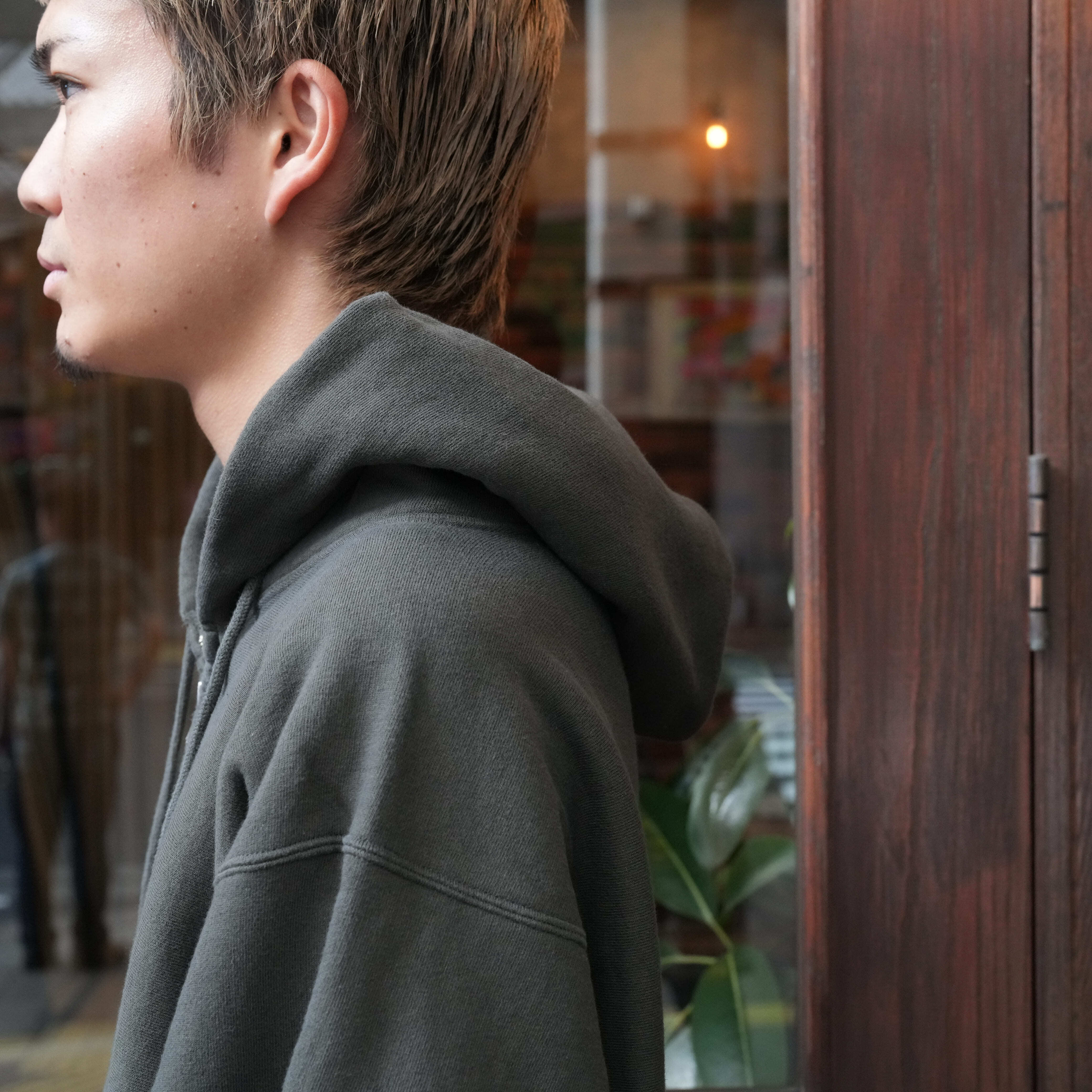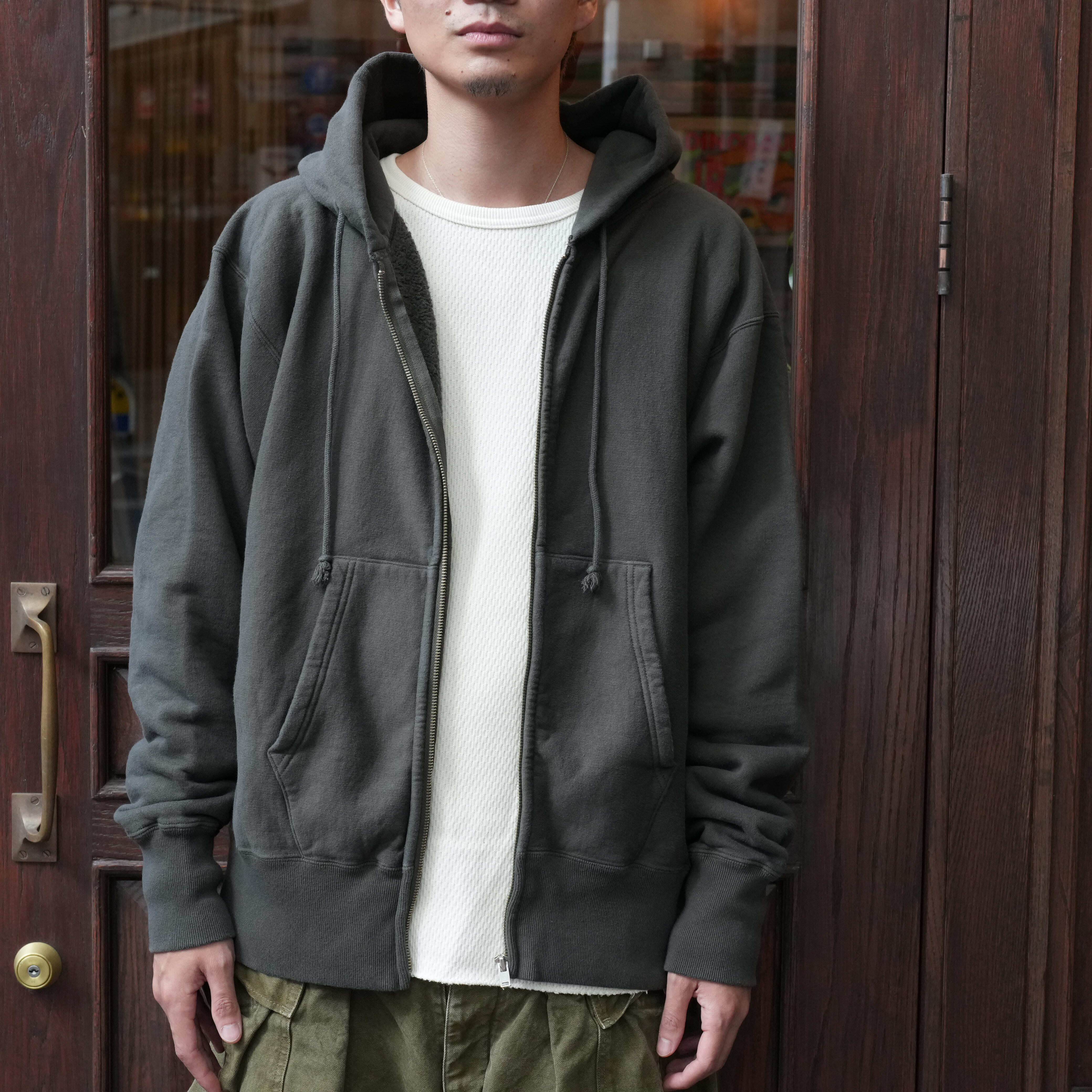 一見するとシンプルですがしっかり拘りが詰まっています。まず使い勝手の良さがありながら絶妙な存在感のある、この色味が非常にいい。ヴィンテージのような雰囲気もありながらゆとりのあるサイズ感で、着るだけでさり気なくいいオーラを放ってくれます。吊り裏毛に裏起毛を施したことによる抜群の着心地の良さも忘れてはいけません。