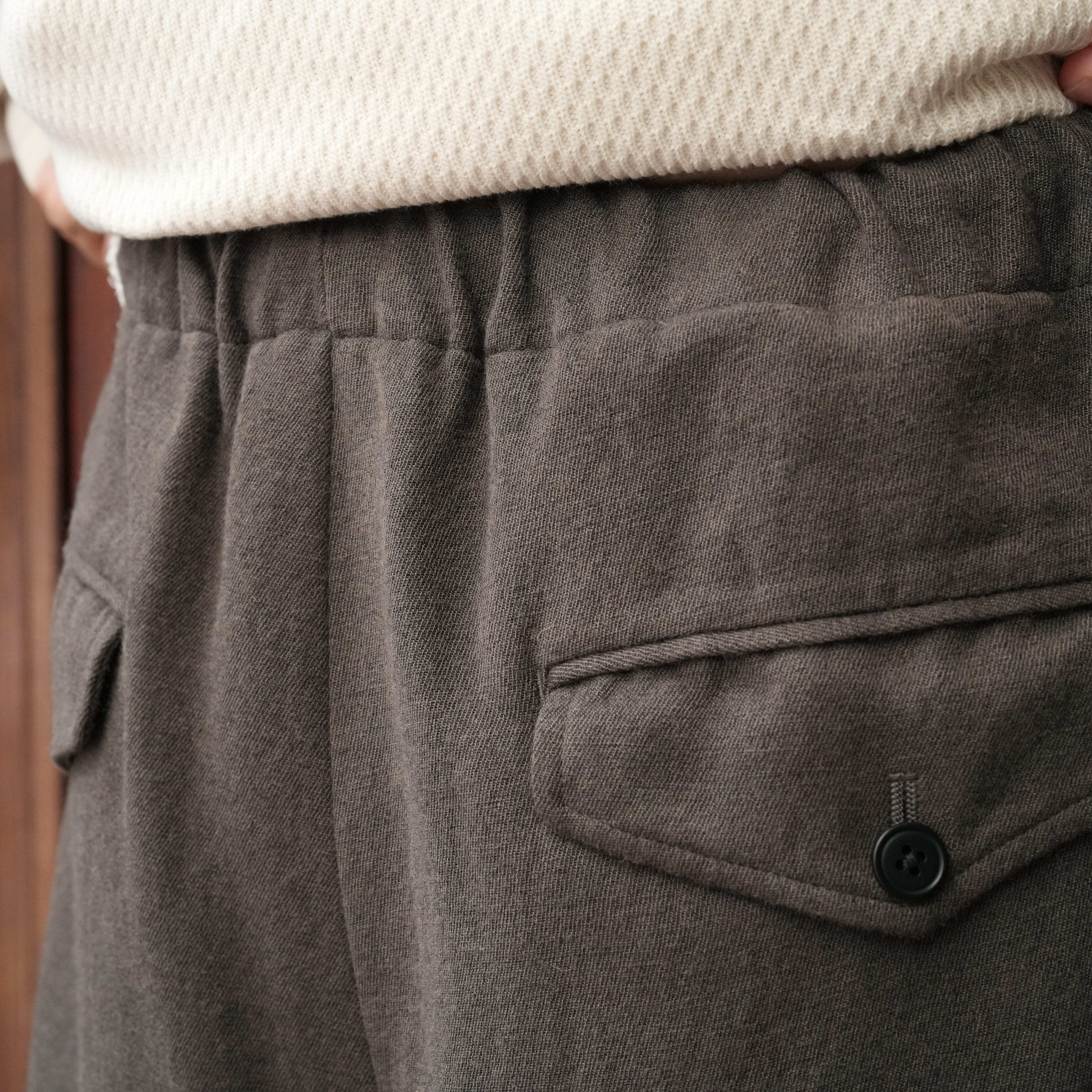 ドレスパンツを日常使いするイメージで再構築したイージートラウザー。ゆとりのある股上と中太ストレートのシルエット、両サイドにさり気なく入った深めのアウトタックが特徴で、ゴムとドローコード仕様のウエストは心地良い着用感を感じられます。