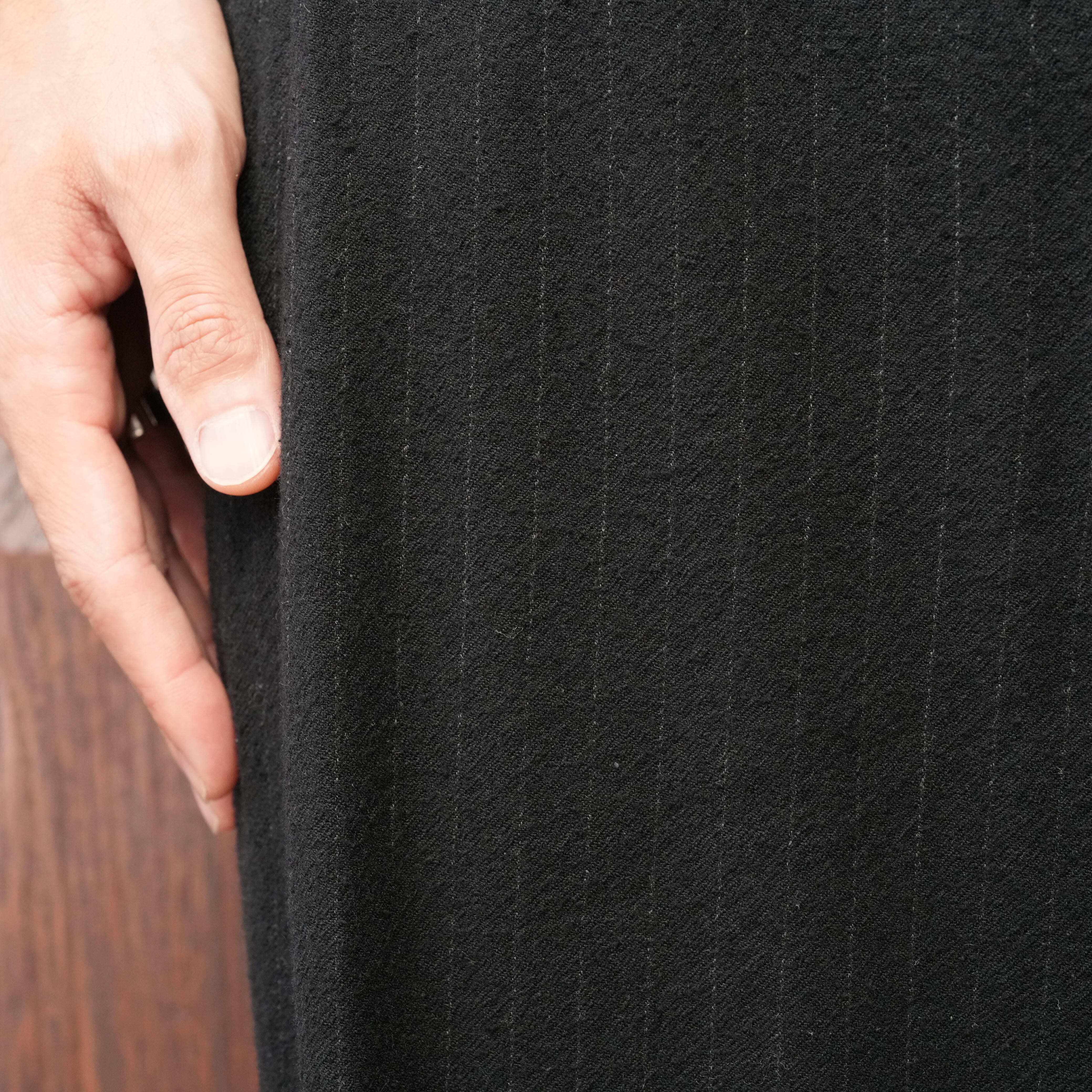 経糸にウール、緯糸にシルクの先染め糸でシャンブレー調で織り上げたワッシャーストライプツイル。ワッシャー加工による洗い込みによって、ウールとシルクネップが絡み合い、奥行きのある独特な表情と、柔らかく肌あたりの良い風合いを引き出しています。