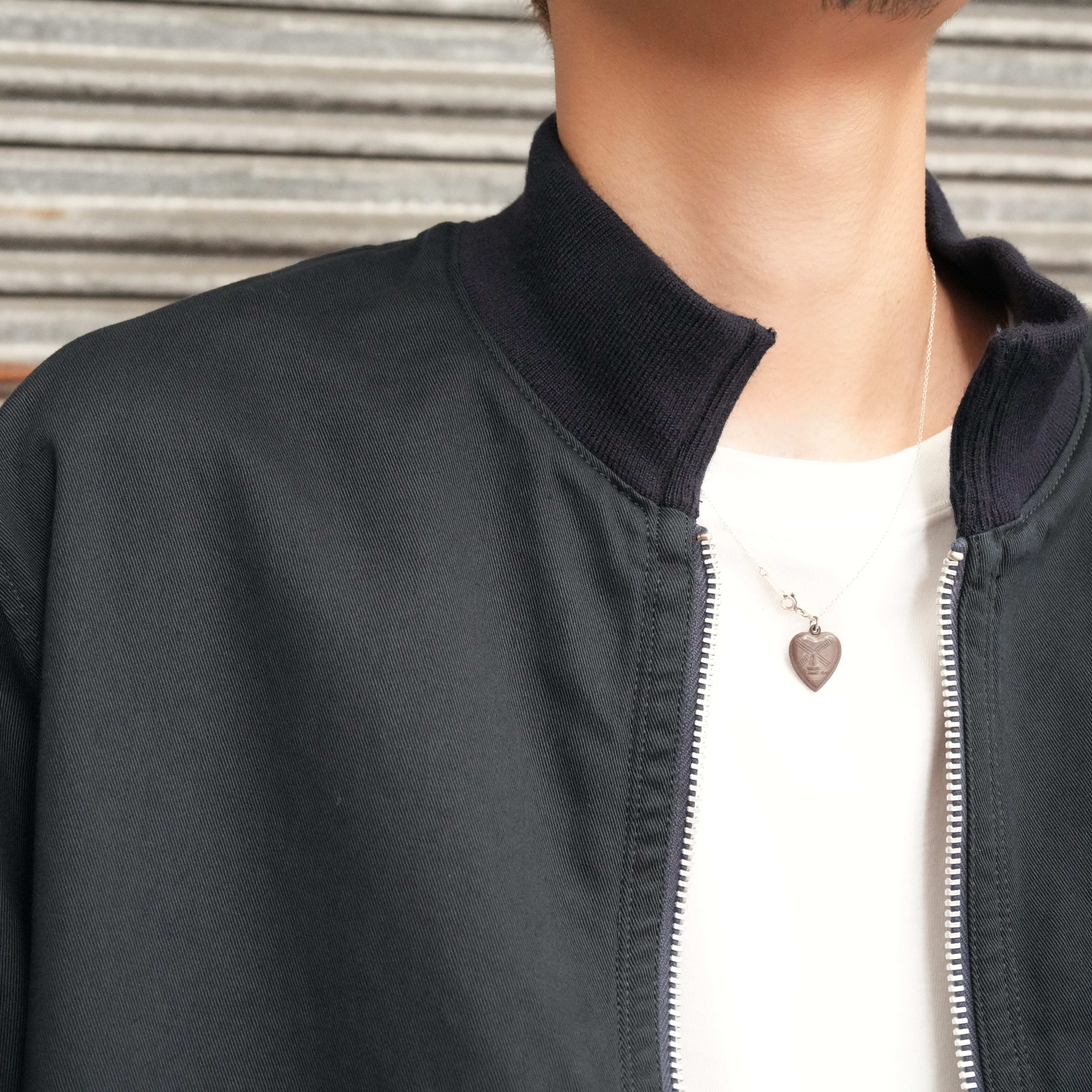 1940年代のUS.NAVYのデッキジャケットをリファレンスにした1着です。ファスナータイプで、着丈が極端に縮んでしまった個体を見つけ、そのフォルムに惹かれたのが着眼点。ミリタリーでありながらも、どこかワークジャケットのような雰囲気も感じたのです。〈FOUNDOUR〉でもそうした経年変化を表現し、着丈は短めに設定。あえてボディの分量を多めに取って、後ろ見頃がたるんだようなフォルムを再現しています。そのため、やや前下がりのシルエットになっているのもポイントです。生地は本来であれば硬くてゴツいものを採用するところですが、それだと着にくい。なので、あえて中厚のコットンツイルをセレクトし、無双仕立てにすることで、タフな印象と着やすさを共存させました。袖を通したときに感じられる絶妙な膨らみとハリに、安心感を覚えるひとも多いはず。シンプルながら、細部へのこだわりがたくさん詰まったアイテムです。