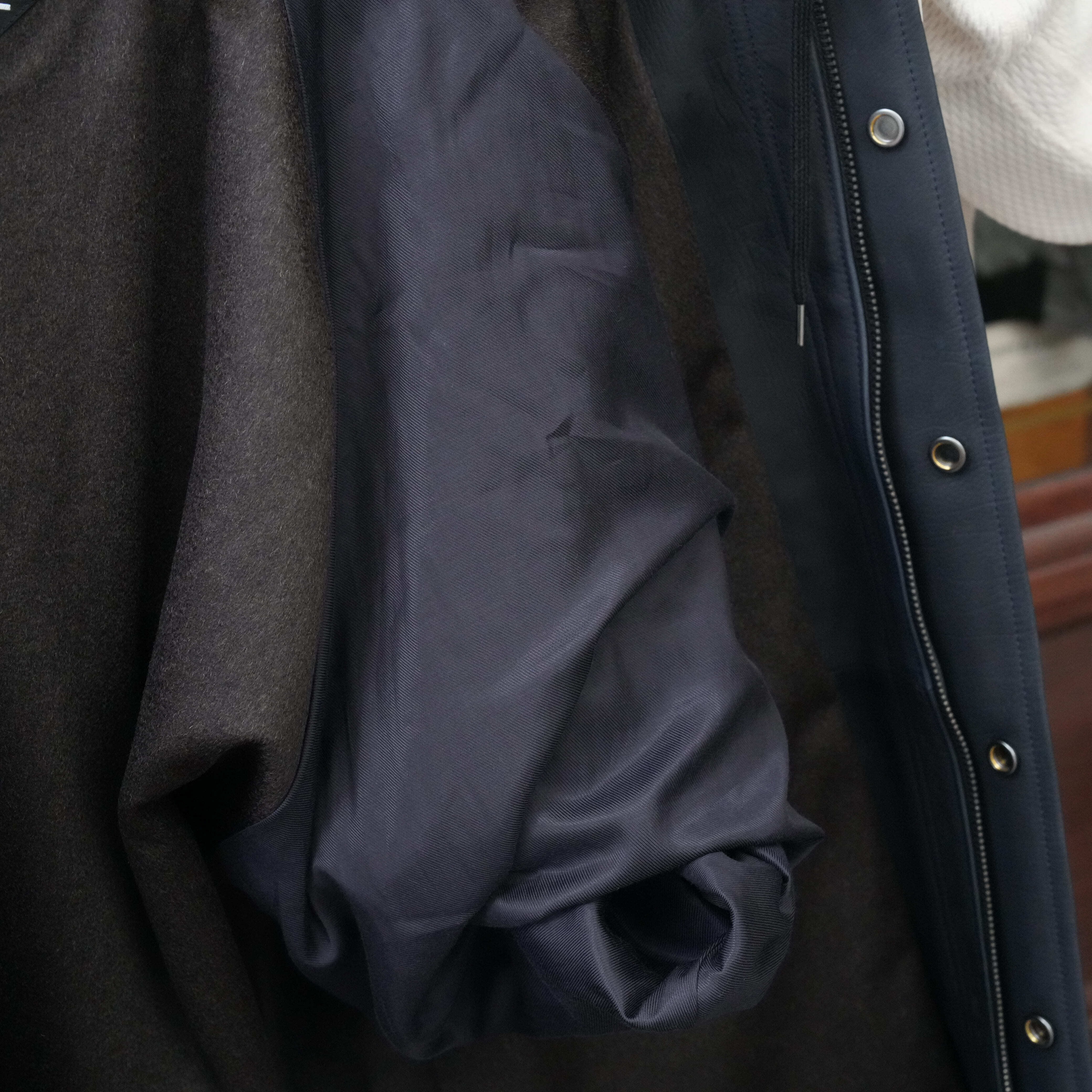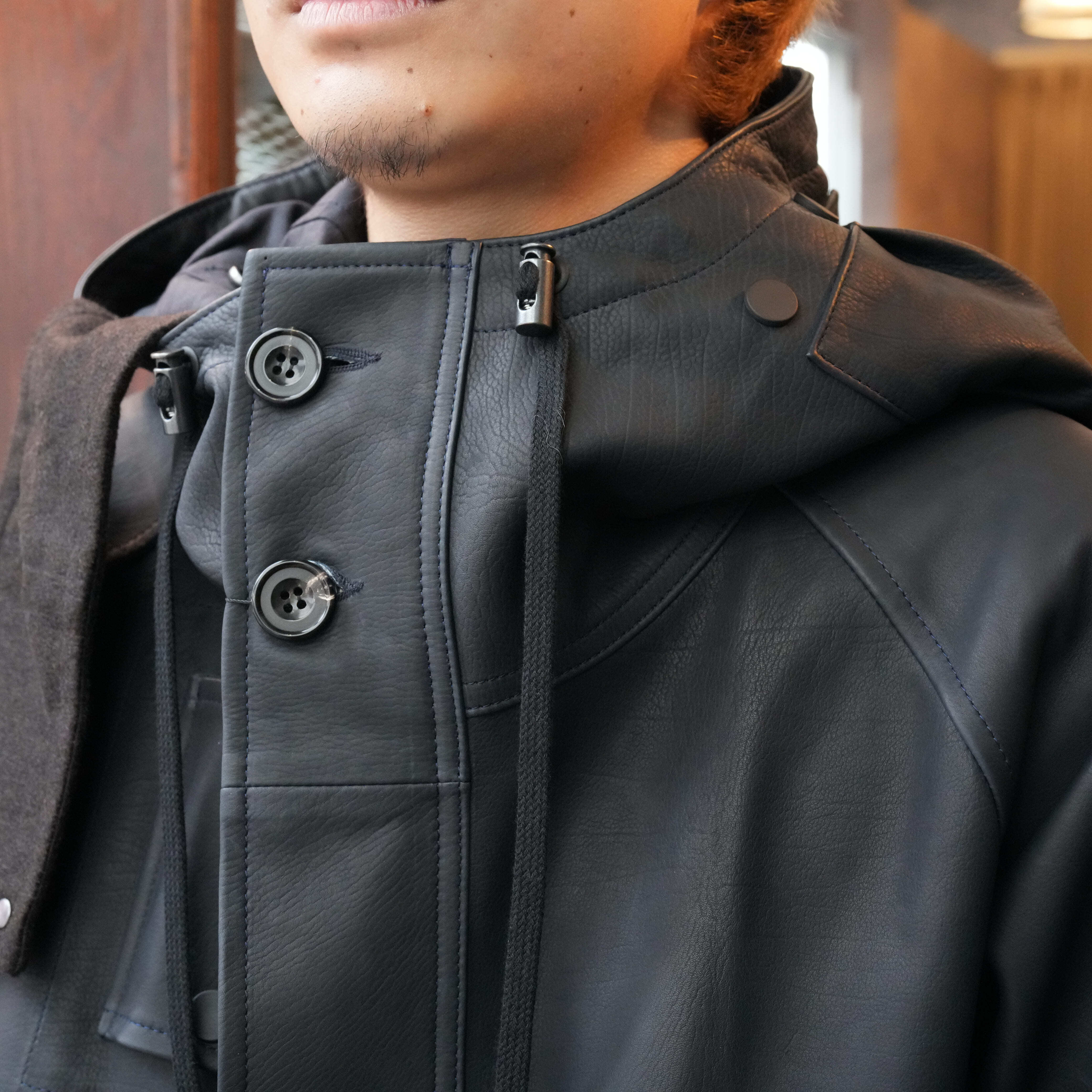 前回の展示会にて、大好評を博した北海道産のカーフレザー。今回は同様の原皮を防水+ネイビーに染め上げAUBERGE伝説のイギリス海軍のネイビーベンタイルヤッケ『DEVON』を企画いたしました。通常の撥水やクリーニング店の加工と違い、自衛隊の基準を満たす薬剤による防水染革を施している。こちらもファッション用途としては業界初である。
