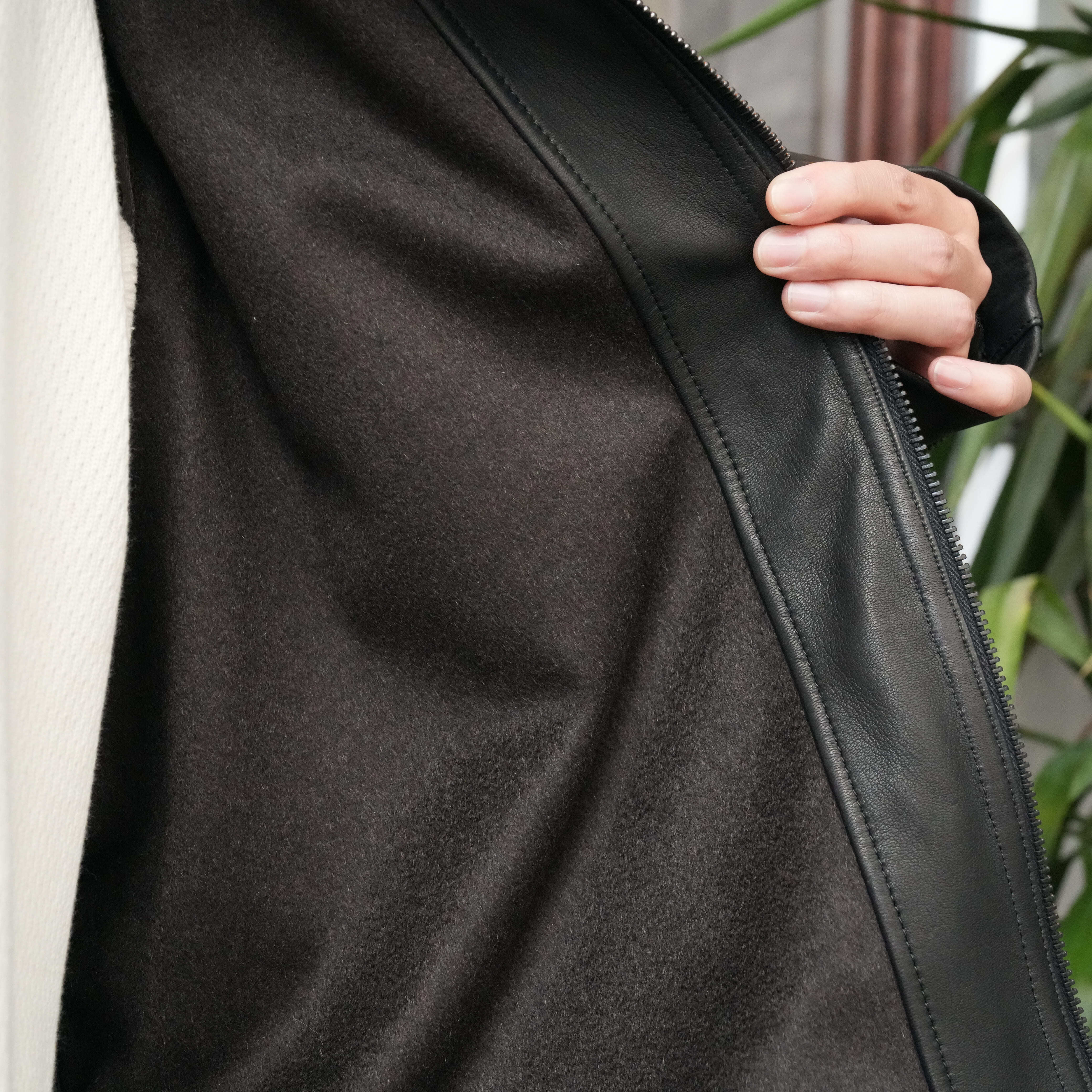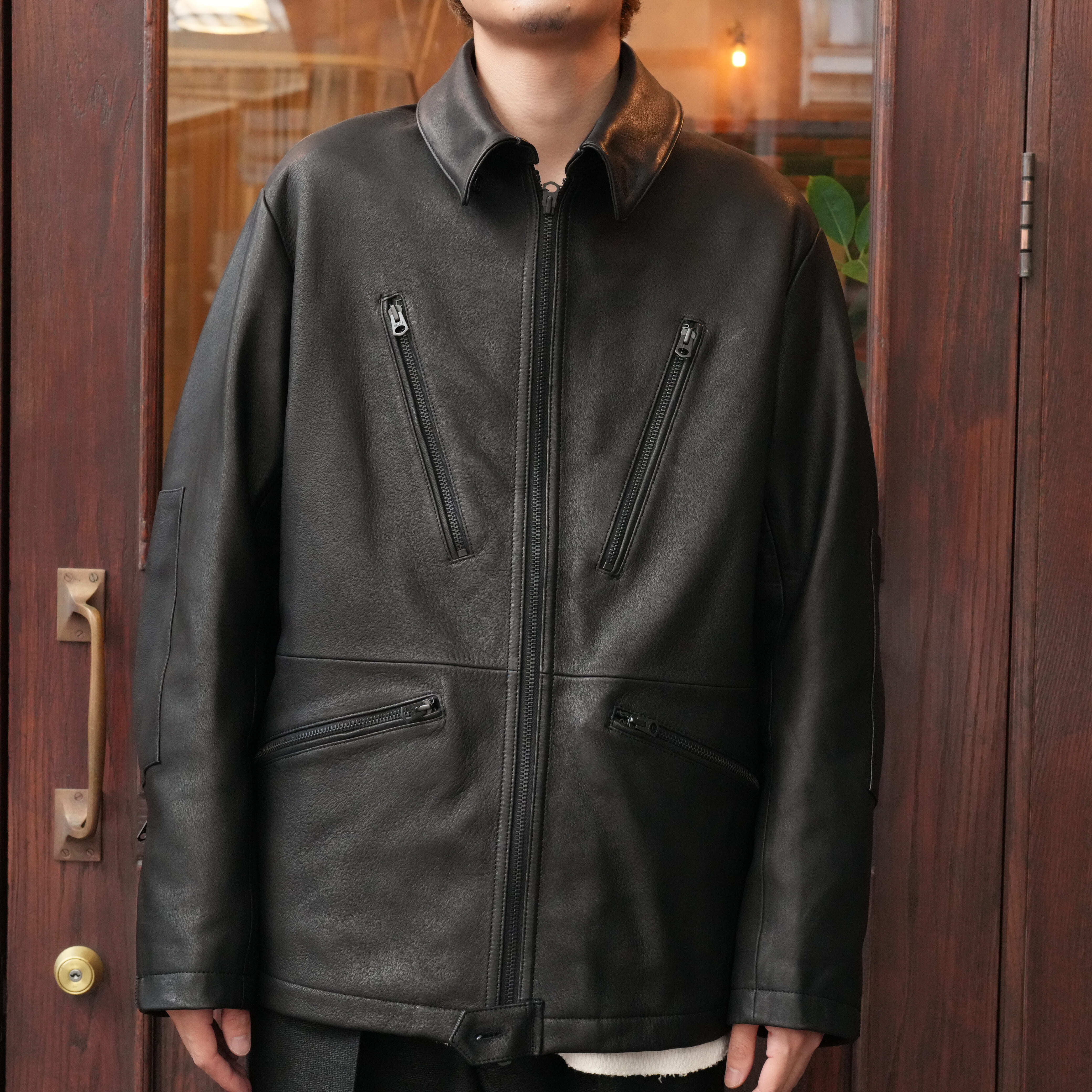 スエーデン軍のタンカースジャケットがベース。オリジナルはかつてマルジェラが元ネタとして使用したと噂されるモデルで胸元のファスナーの配置や内側に備わる戦車から兵士を引き出す際の救出用のベルトワークがミリタリー心をそそる1着だが、高すぎる袖山とファッションとは程遠い抹茶のようなグリーンのおかげで人を選ぶ1着とも言われている。今回の防水蝦夷鹿バージョンのLEOPARDはそんな型紙の着にくさ、カラー全てをクリアした男らしさとファッションを両立させた1着に仕上げた。