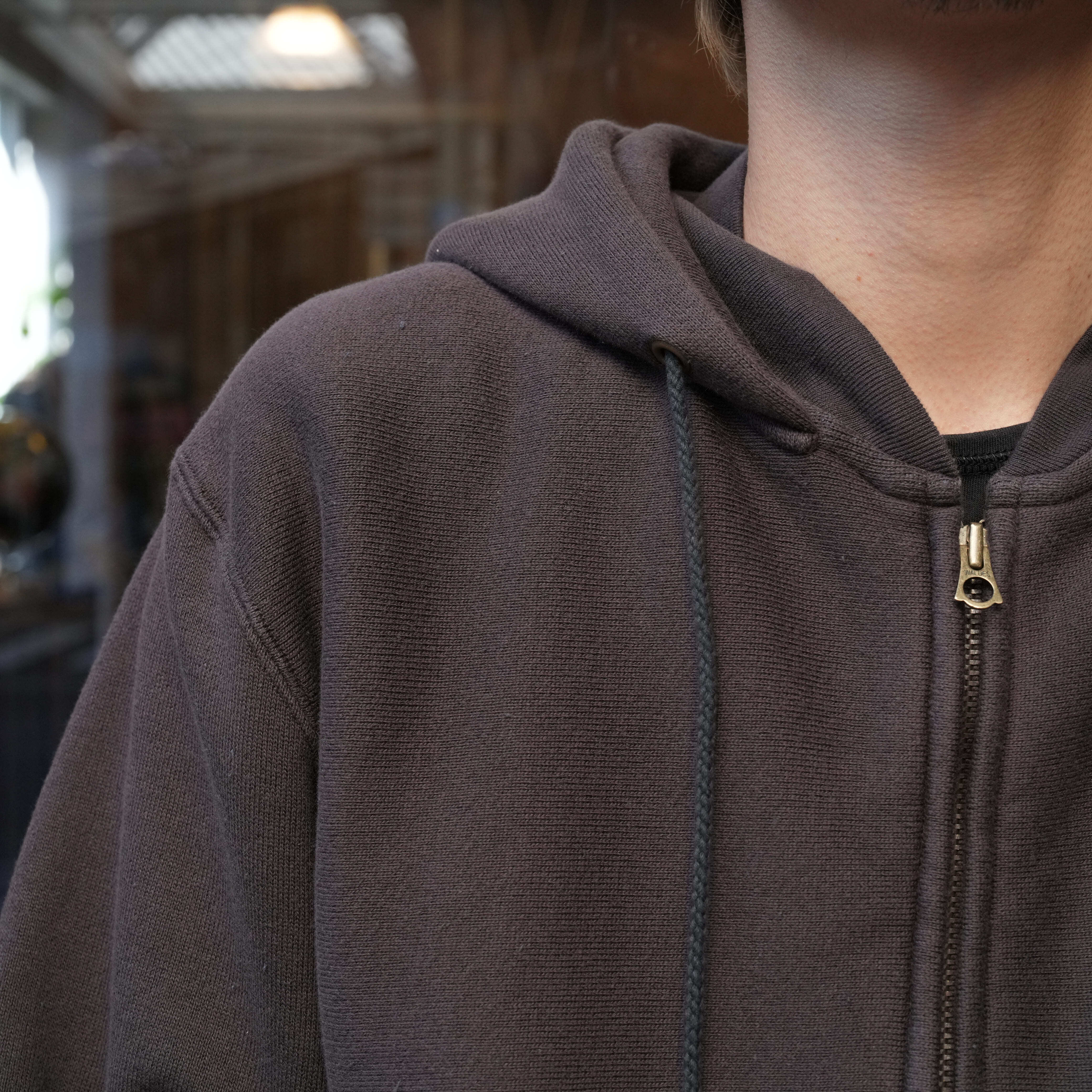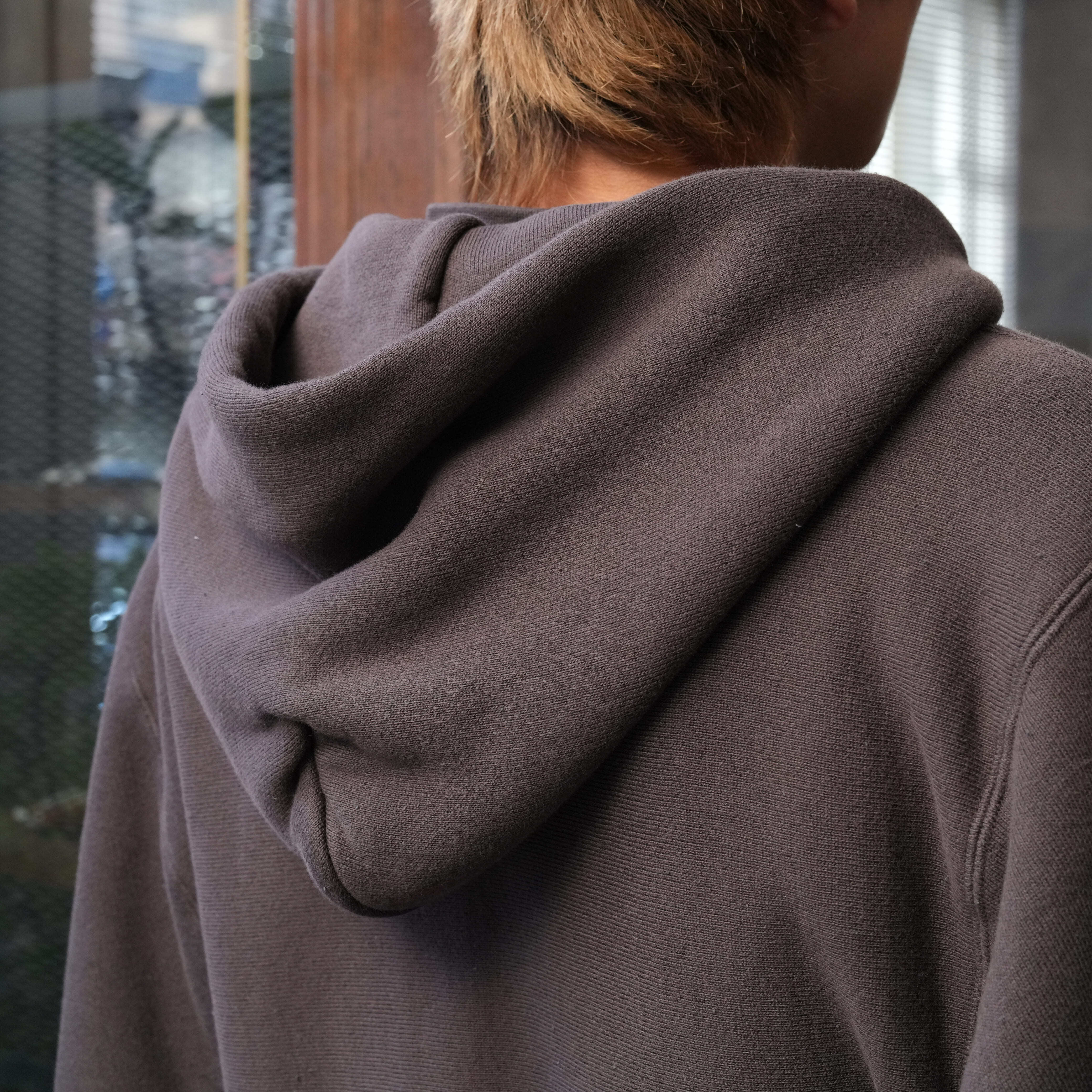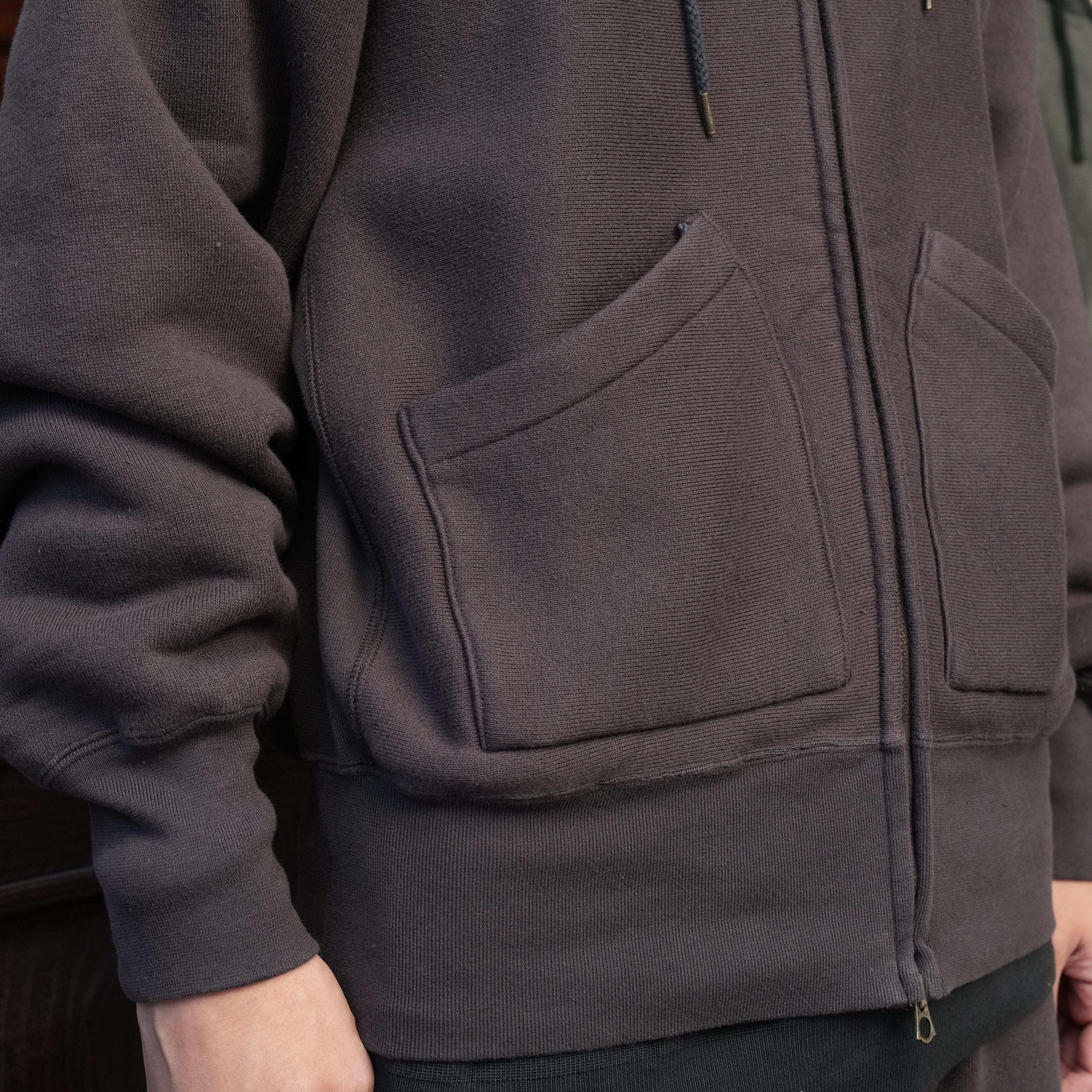 MA-1の襟リブの様な襟元の外側にフードを縫製してスポーティーになりすぎない様に工夫いたしました。袖は大きめのアームホールのドルマンスリーブ、フロントポケットは50年代~60年代で姿を消す分離ポケットを配した。ラグジュアリーな光沢を放つ裏毛生地とヴィンテージディテールの融合を狙いました。