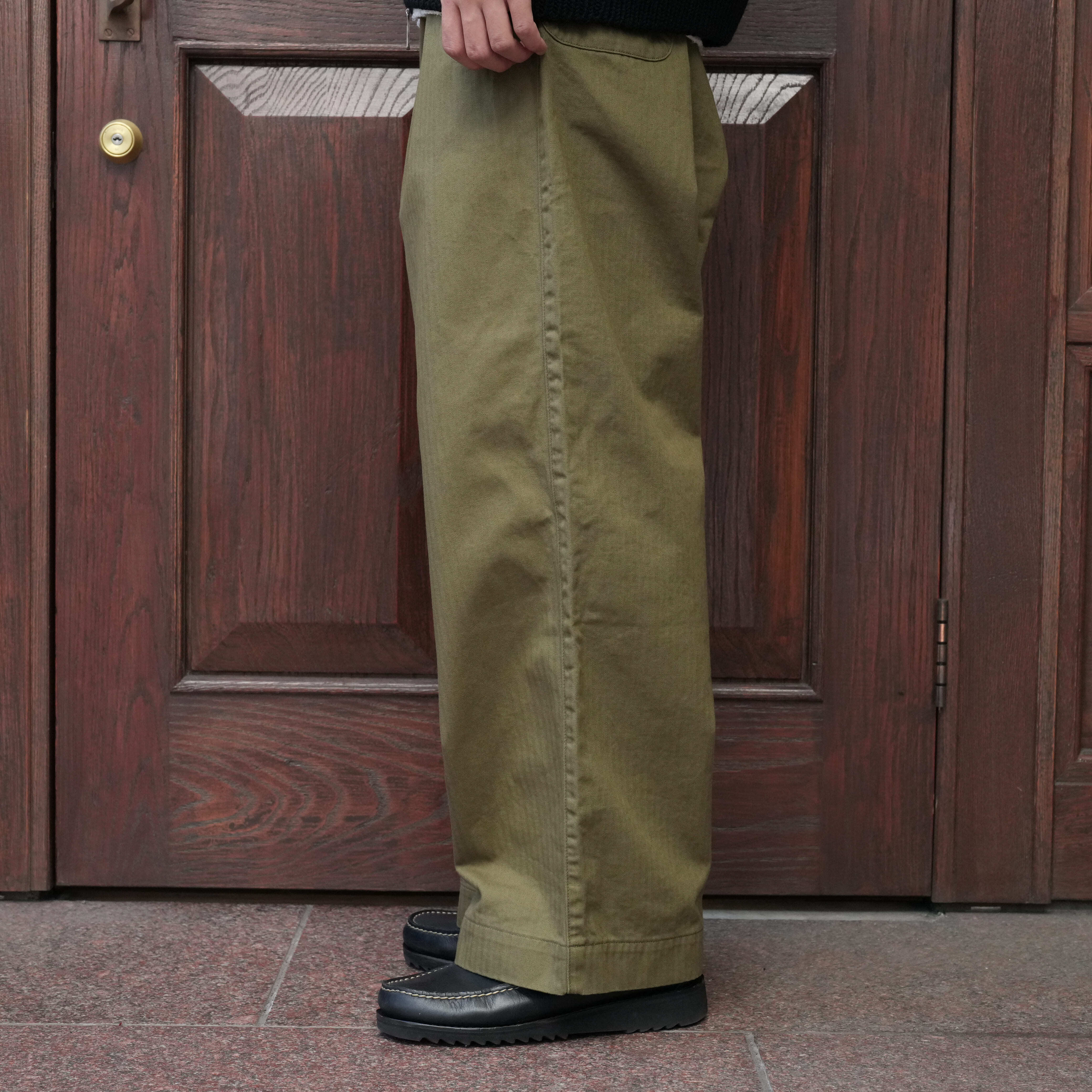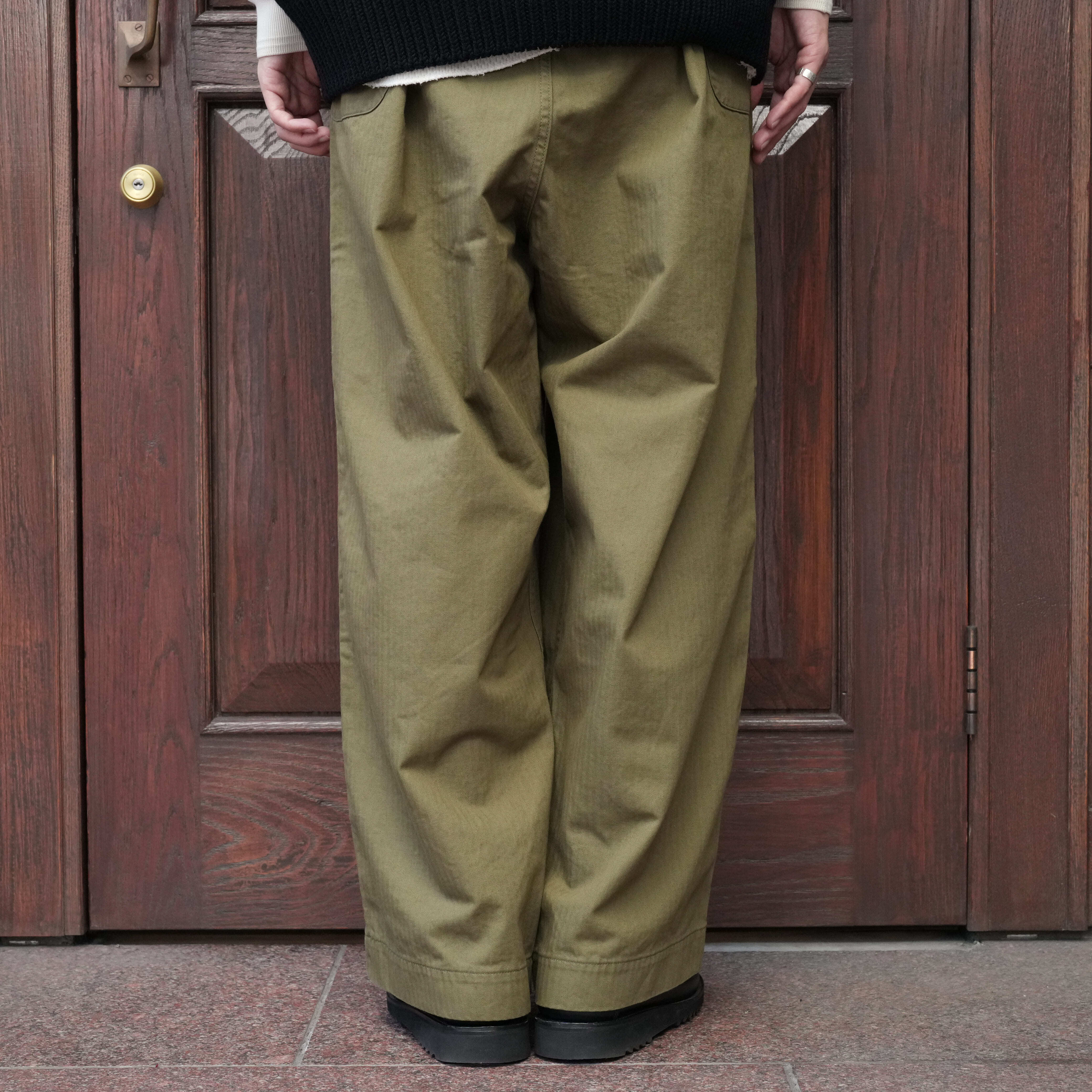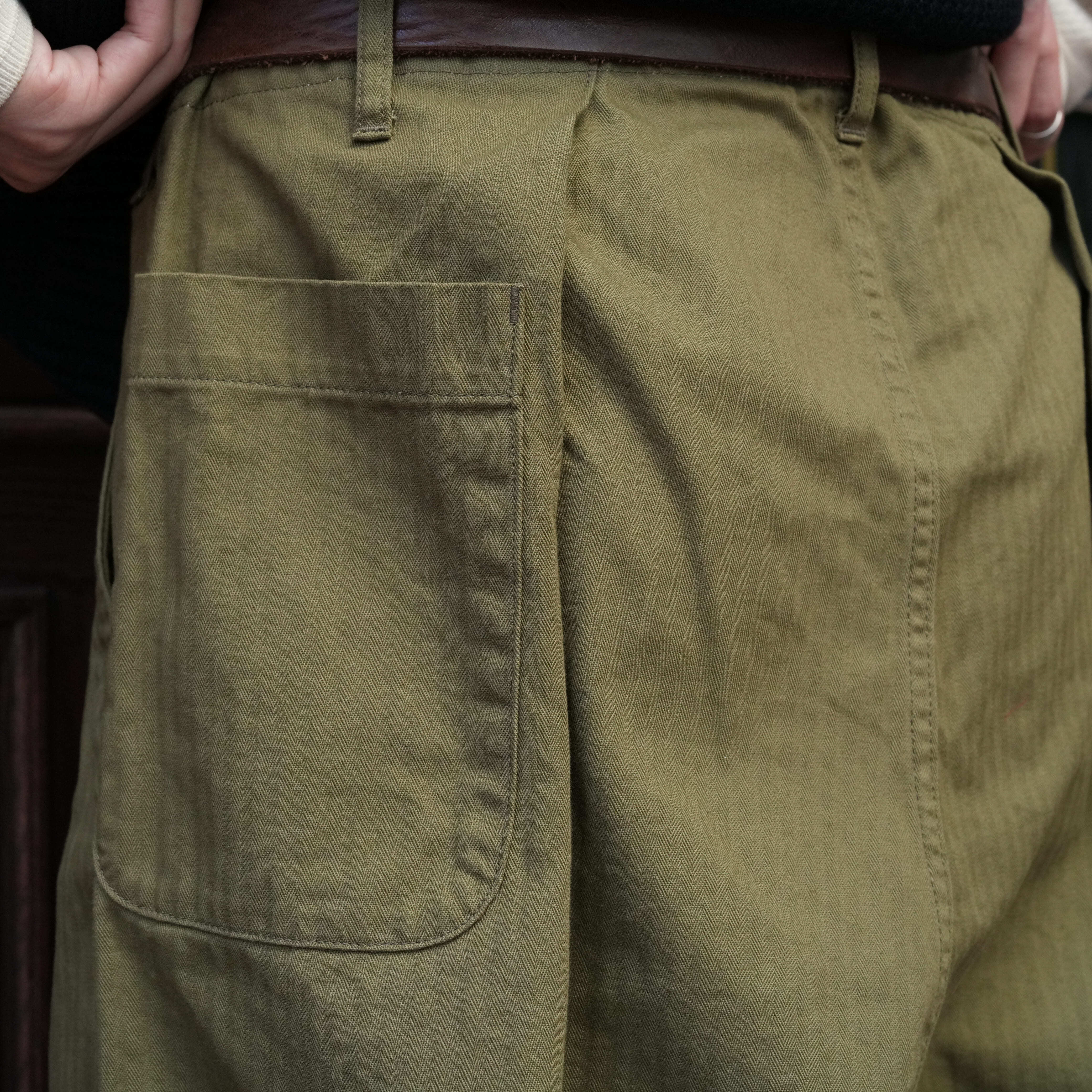 今回は50年代USarmy M47の生地をリプロしたヘリンボーン生地になります。綾立ちが低いので派手さがなく、着込んでいくとストライプの凹凸感が出ます。このグランクらしいワイドでボリュームのあるシルエット、絶妙な色味やヘリンボーンの生地がいい存在感を放ってくれます。通年穿ける生地感で気兼ねなくガシガシ穿けるので、あるとついつい穿いてしまいそうな1本です。