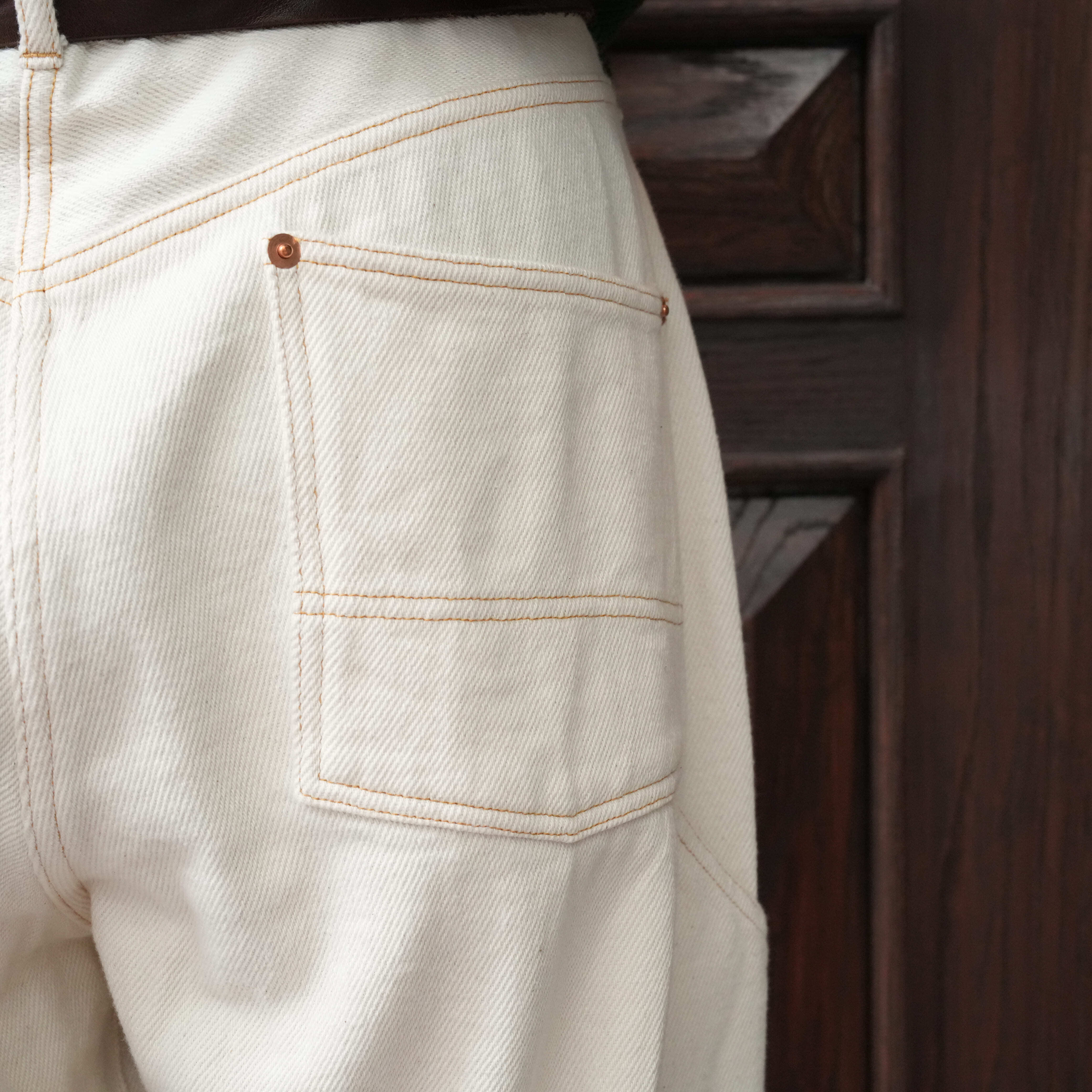 前から見ると普遍的な5ポケットのデニムですが、一方でバックスタイルは、クラシックなペインターパンツのディテールが取り入れられています。これは1850年代に誕生したワークブランド〈BOSS OF THE ROAD〉のパンツをリファレンスにした1本。1946年に大手によって買収されてしまうのですが、ヴィンテージ好きのあいだでも人気のブランド。前後のディテールに二面性があるのは、おそらくそれが時代の過渡期に生まれたアイテムだからです。ぼくはそこに惹かれ、このディテールの強さに負けない生地で、改めて世に送り出したいと思いました。〈FOUNDOUR〉で使っているのは、太番手の甘撚りの糸を、さらに甘く織ったデニム生地。見た目のインパクトに加え、穿いたときのドレープも独特で、いい意味でヘリテージ感が抜けたファッショナブルなパンツに仕上がりました。これも穿き込んだときにどんな表情が生まれるか、楽しみですね。