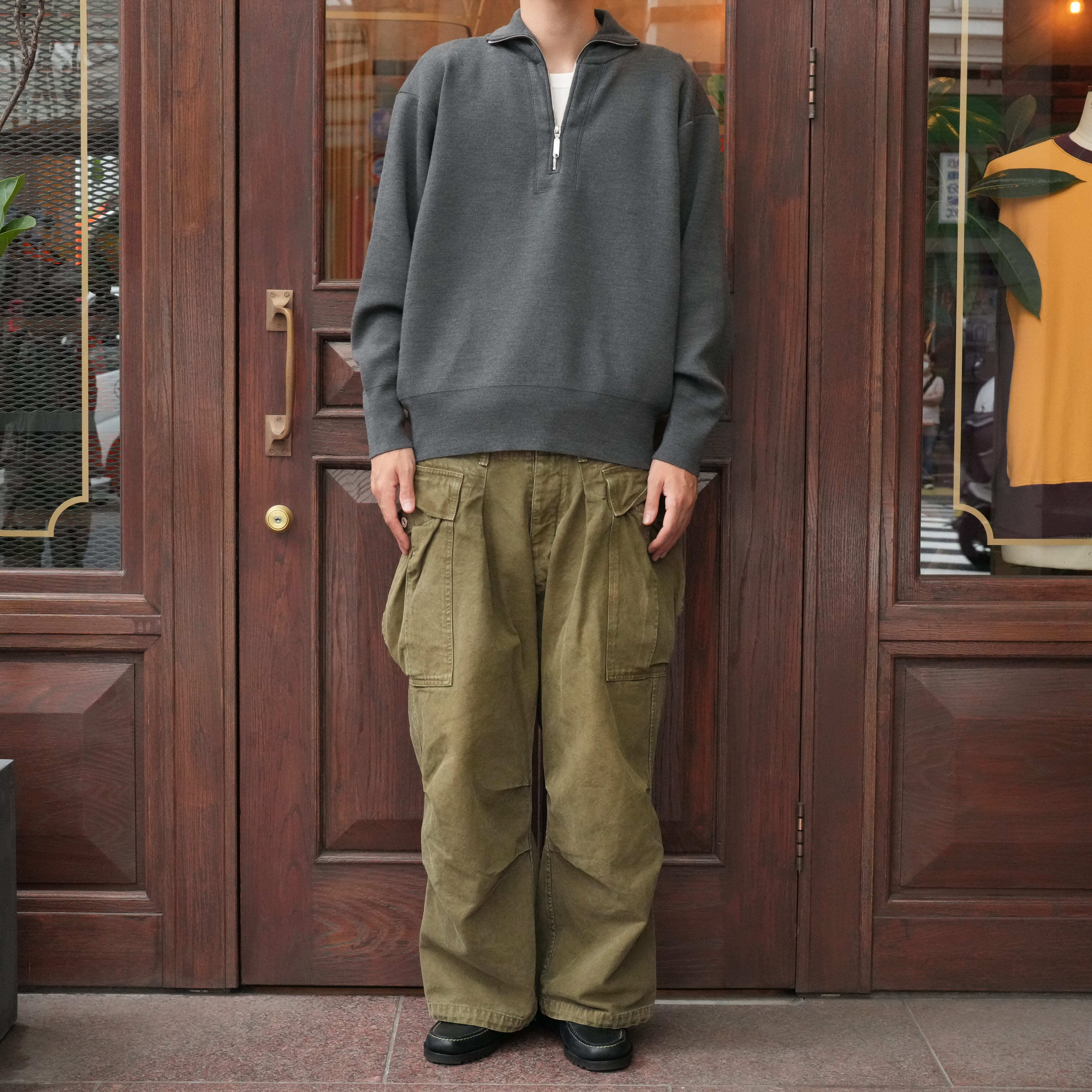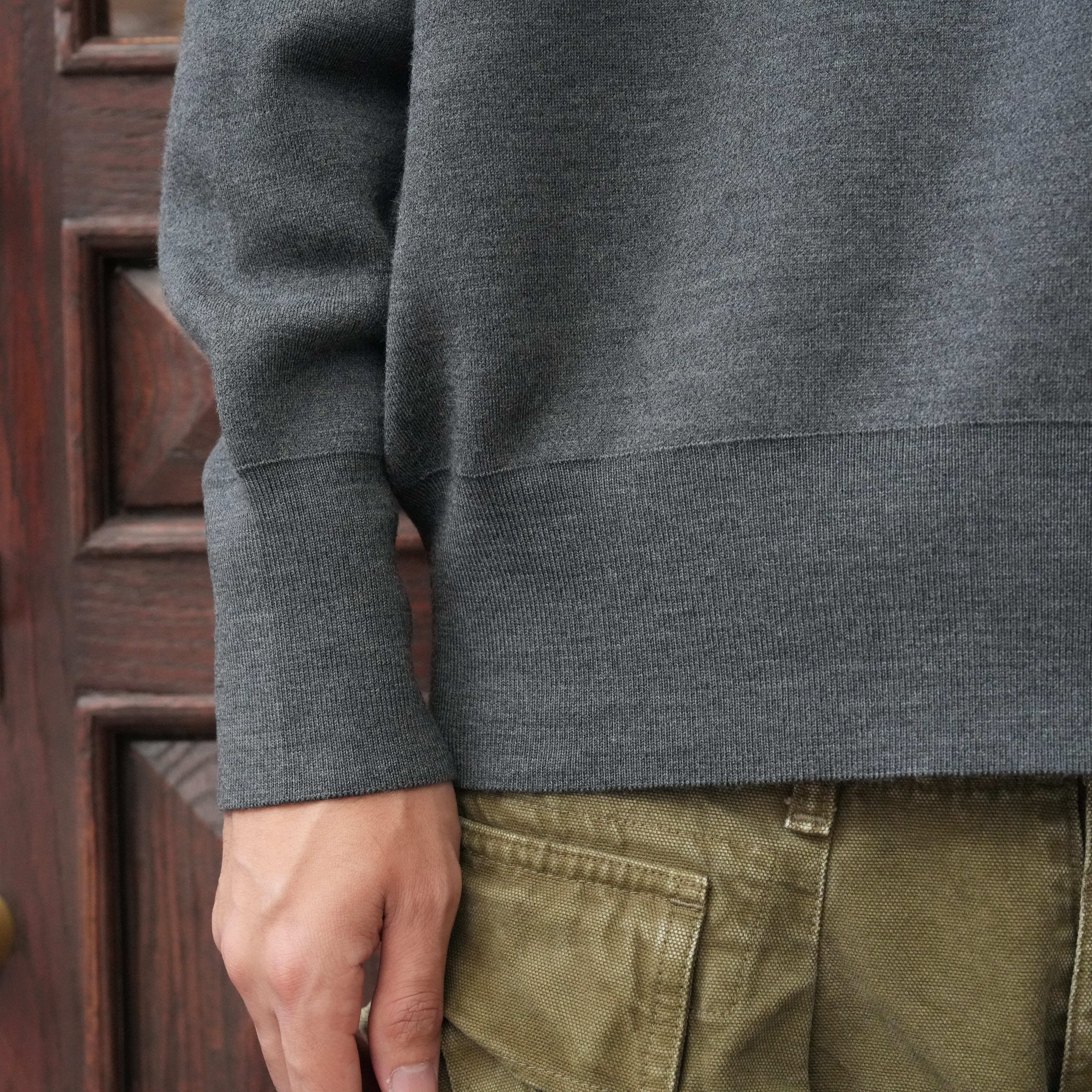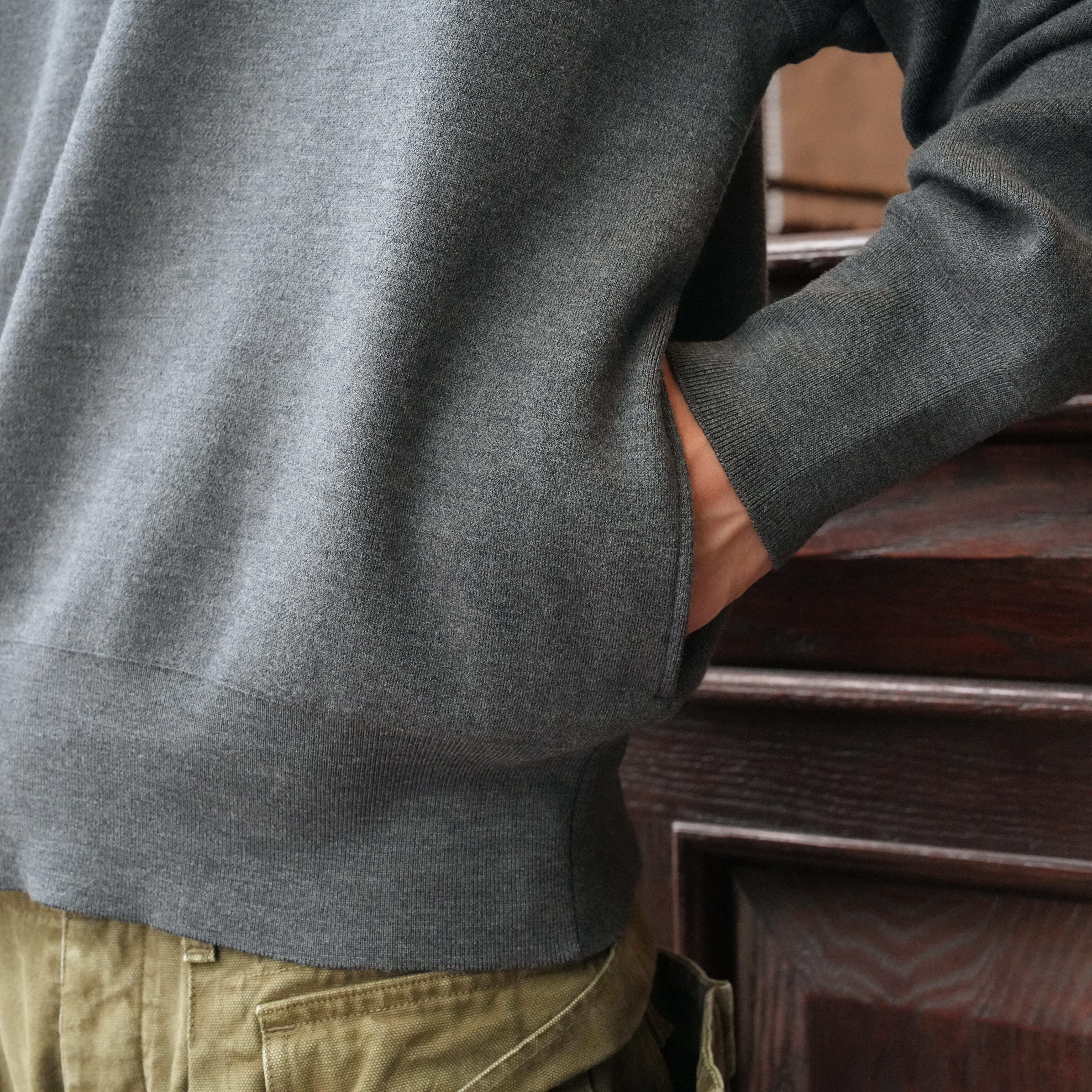 ウール100ですが勿論チクチク感もない、抜群の肌あたりの良さでとにかく着心地がよく、着るとしっかりニットとして、そしてドーターとしての良さを感じられます。スウェットとはまた違った品の良さやシンプルながらも洗練されていて、抜け感も感じられるハーフジップに仕上がっています。ジップの滑りもよく、サイドにポケットがついていたりと細部まで抜かりはありません。