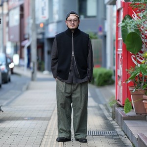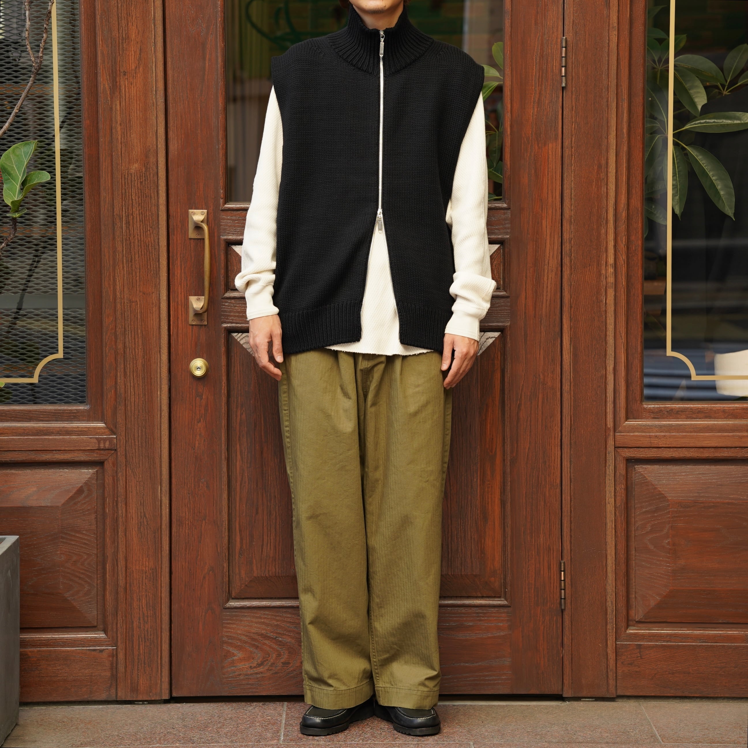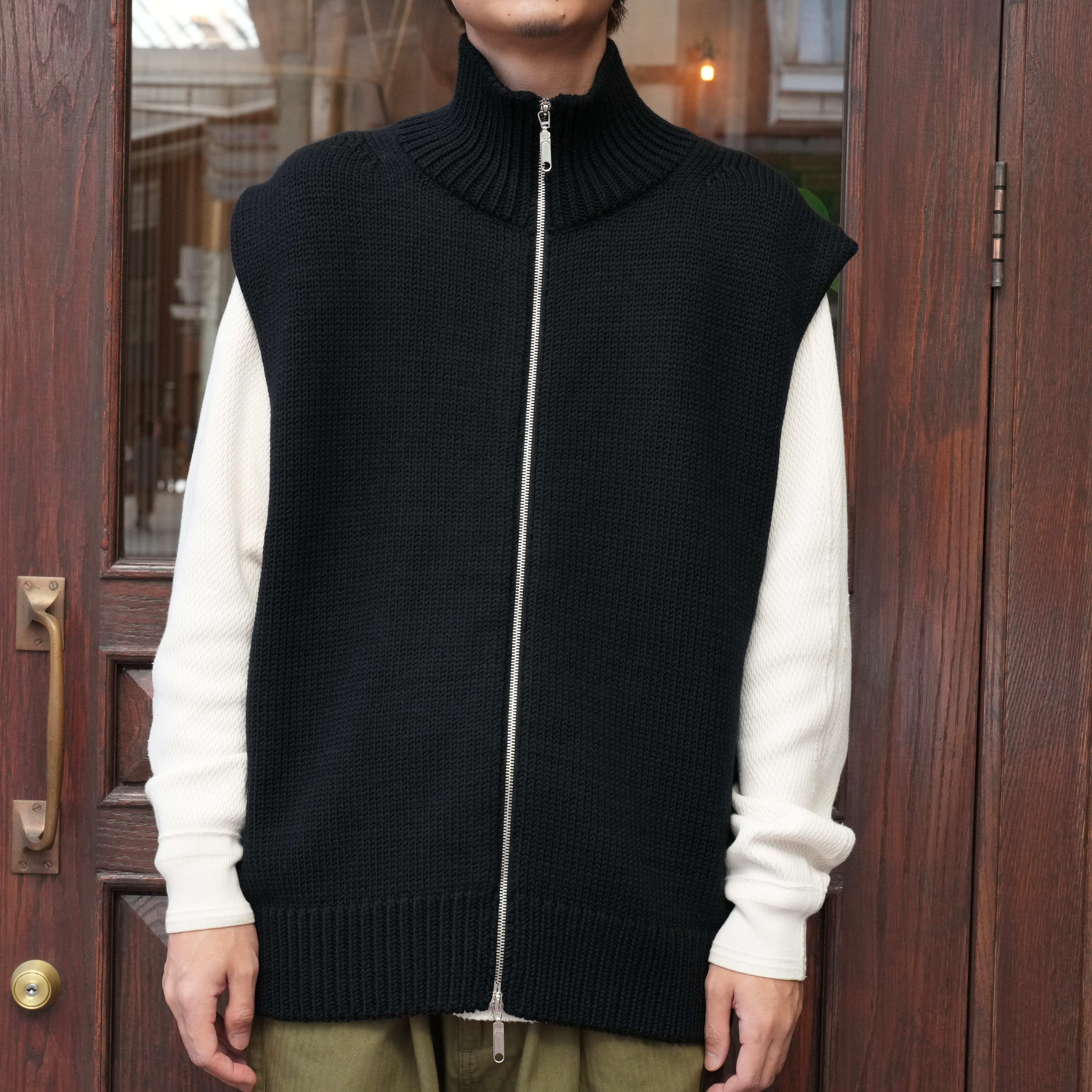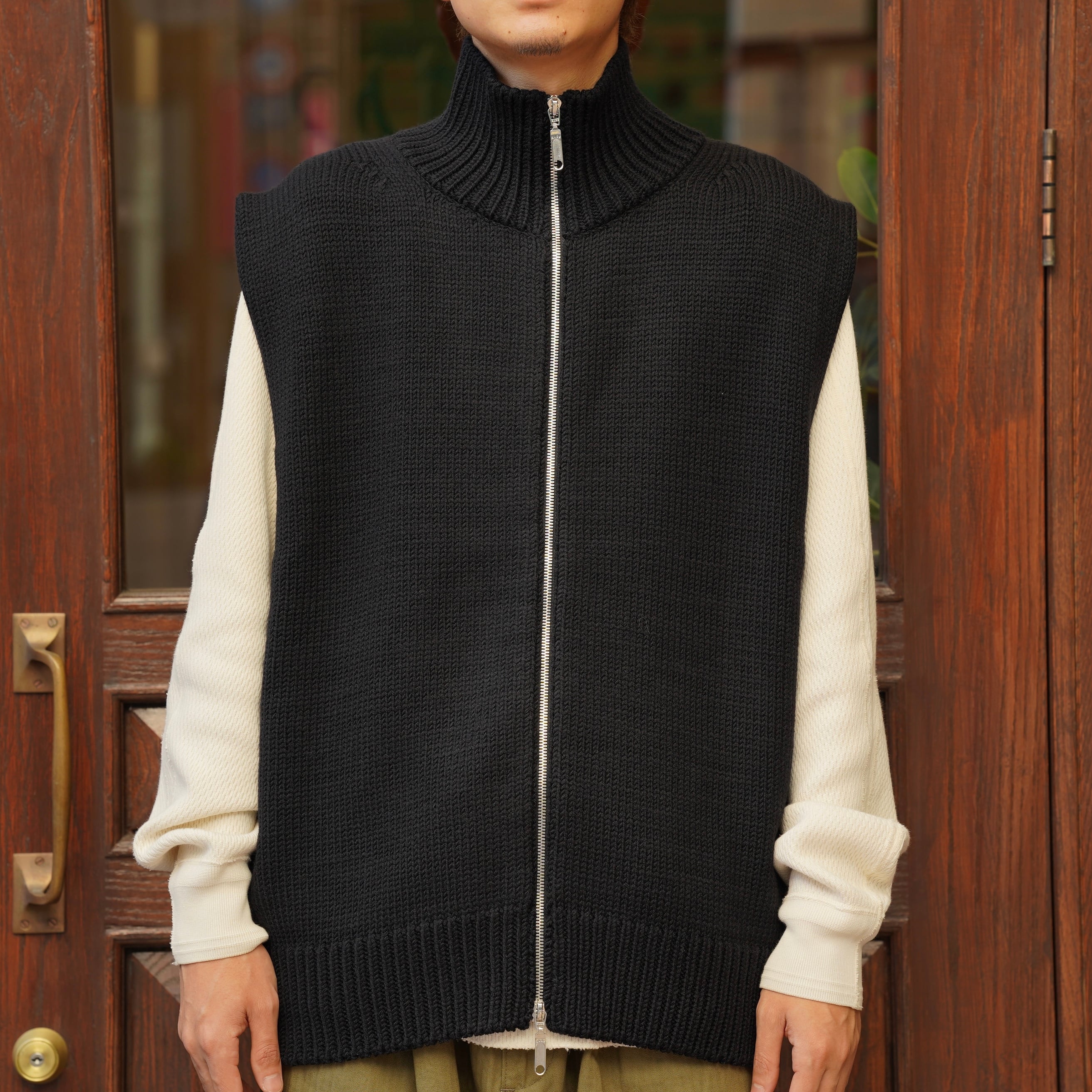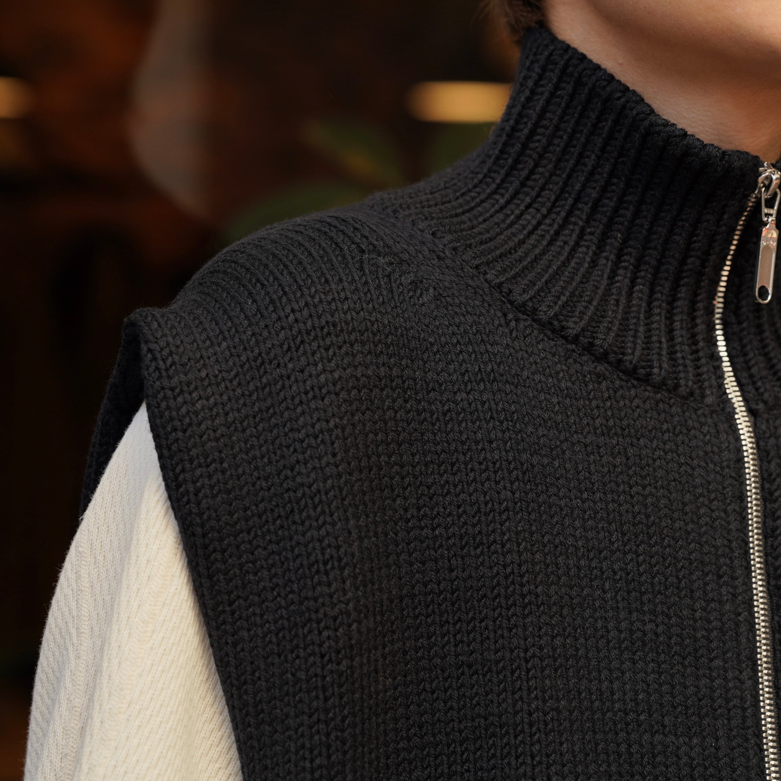 ニットベストの汎用性の高さは言うまでもなく、アームホールのサイズ感も大きめなのでシャツ、カットソー、スウェット、ニット、ジャケットとインナーは何でもハマる、まさに1着あると重宝するアイテムです。インナーとしてちらっと覗かせた時の表情も非常によく、ダブルジップ仕様でネックも高めなのでレイヤードを楽しめます。スタイリングの幅が広がるベストは持っておくことをオススメします。