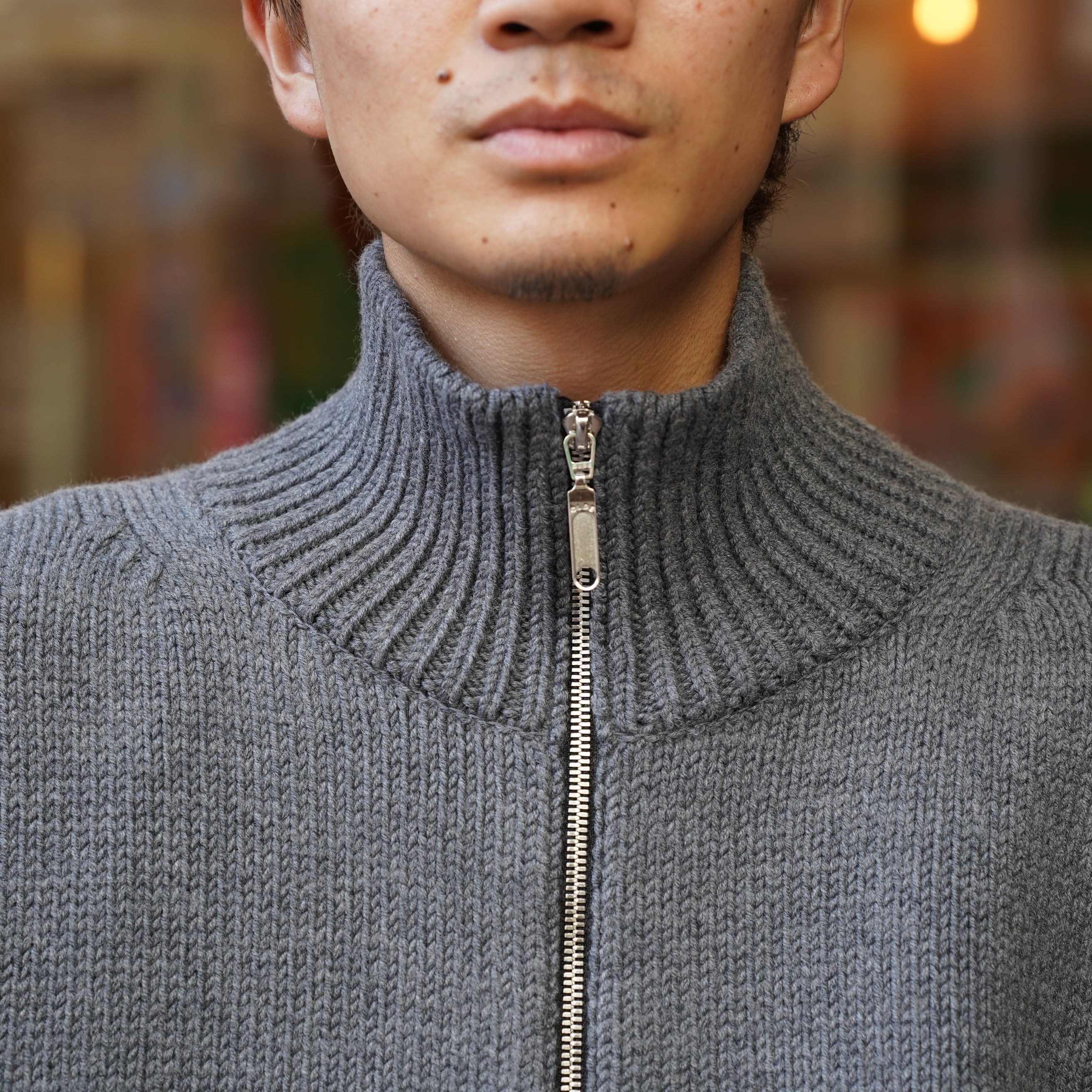 どこか品の良さがあり、肩の落ち感やネックの作りからもドーターらしい抜け感を感じられる1着です。シンプルなデザインながらもローゲージ編みの生地やフロントのジップがいい存在感を放ってくれます。こちらもウール100%ですがチクチク感は一切なく、着心地が抜群に良いのでジップを全て閉めても首元に不快感はありません。