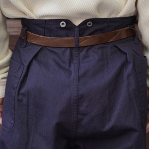 今回は50年代 M47の生地をリプロしたヘリンボーン生地になります。綾立ちが低いので派手さがなく、着込んでいくとストライプの凹凸感が出ます。肉感的にも着用期間が長く、このグランクらしいボリュームのなるシルエット、赤みがかったナス紺の色味や生地がいい存在感を放ってくれます。気兼ねなくガシガシ穿けるので、あるとついつい穿いてしまいそうな1本です。
