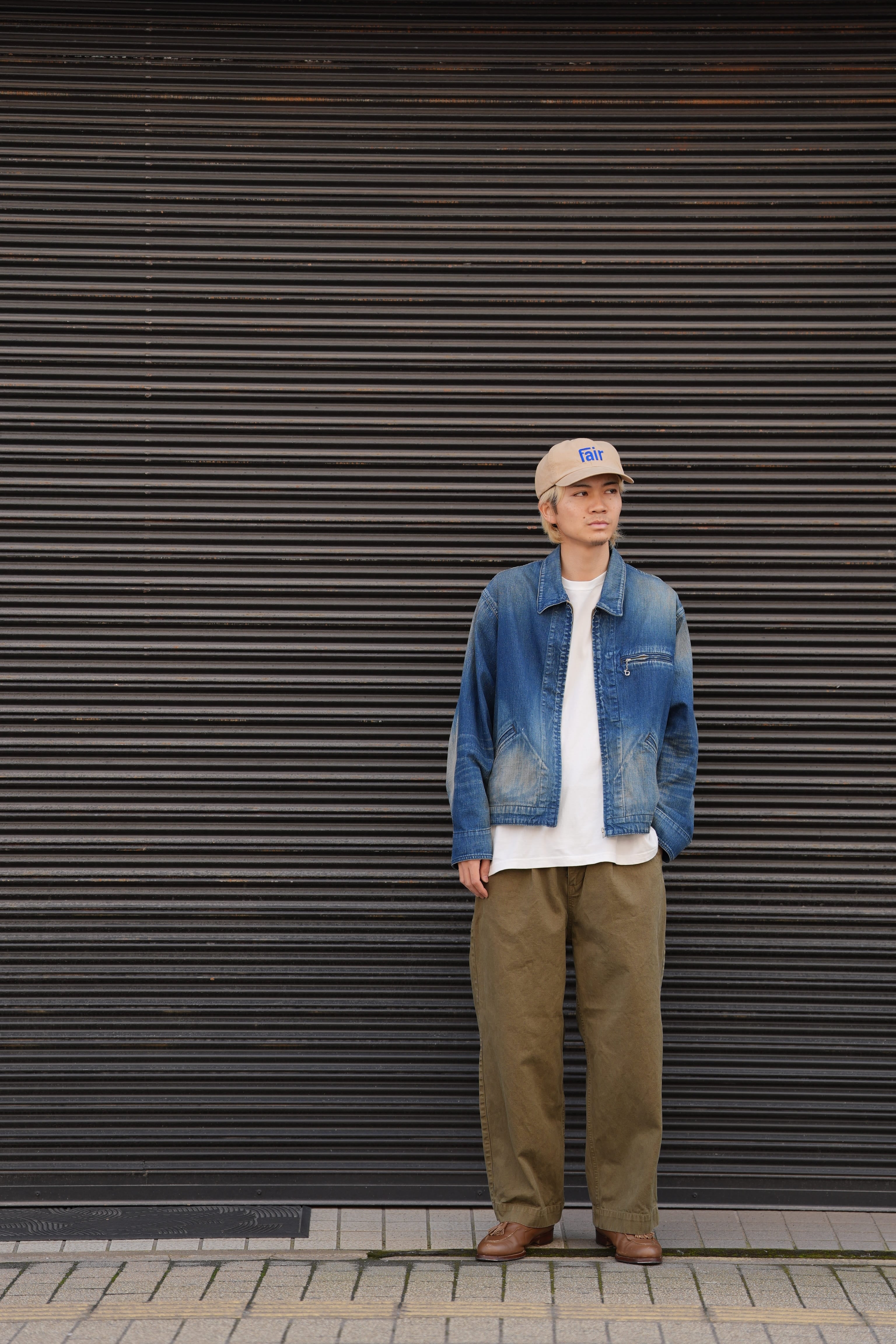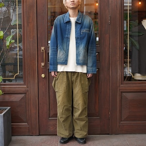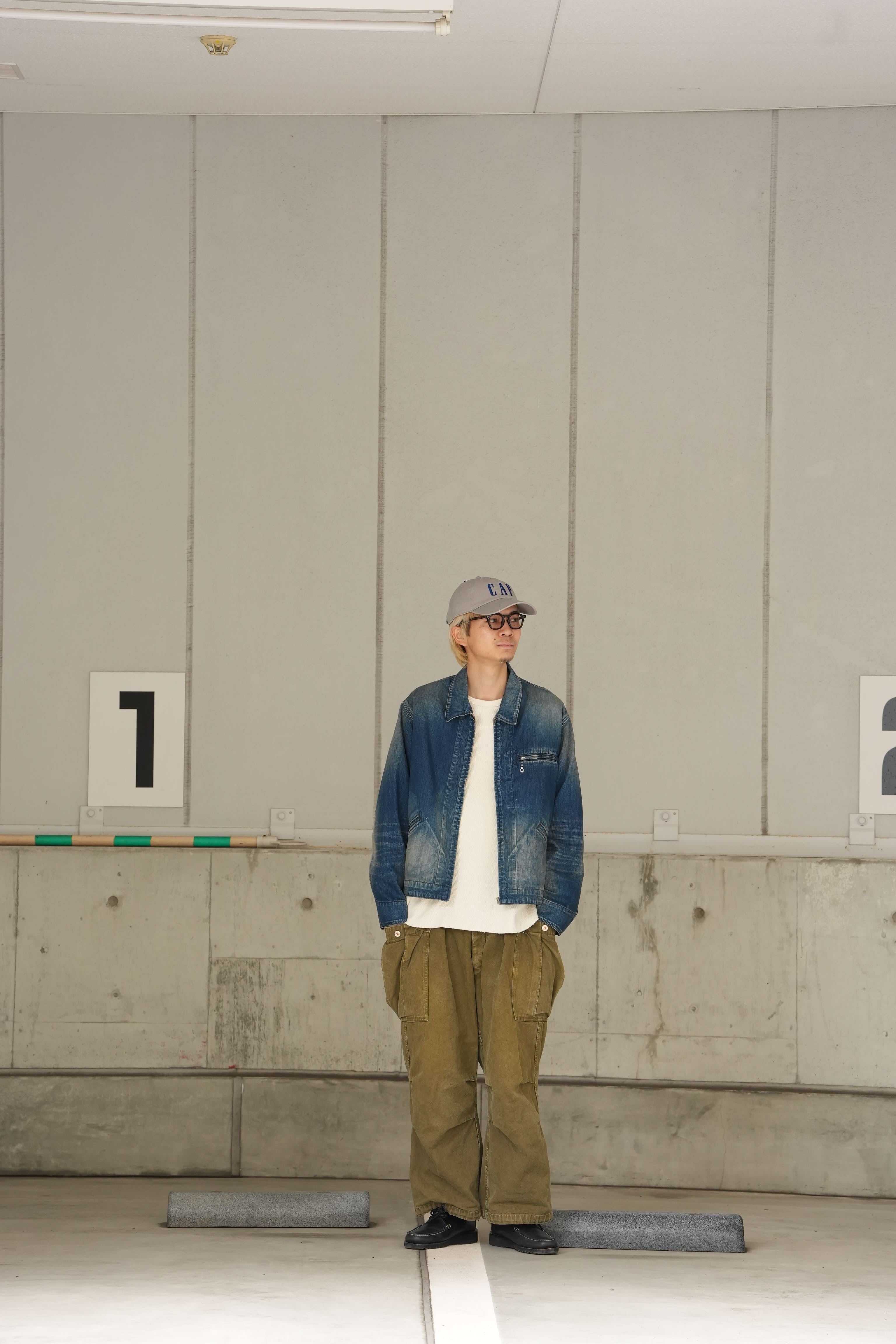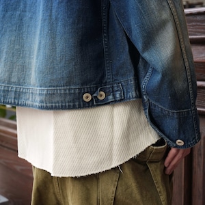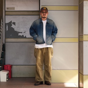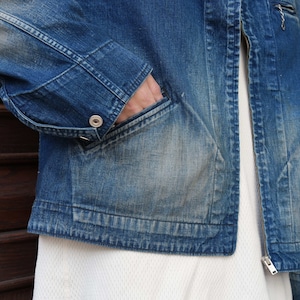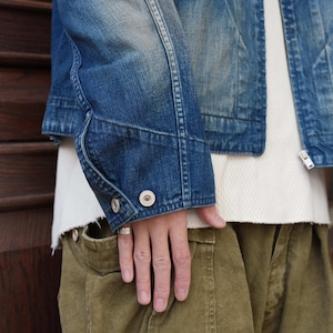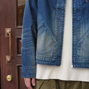 程よく色が残っていながら、色落ちやアタリなど加工の雰囲気が非常によく、胸ポケットのジップがさり気なくいいアクセントになっています。ネップのあるデニム生地で生地の風合いもよく、オンスも軽くてゆとりのあるサイズ感なので、インナー調整によって着用期間も長いことも魅力的です。