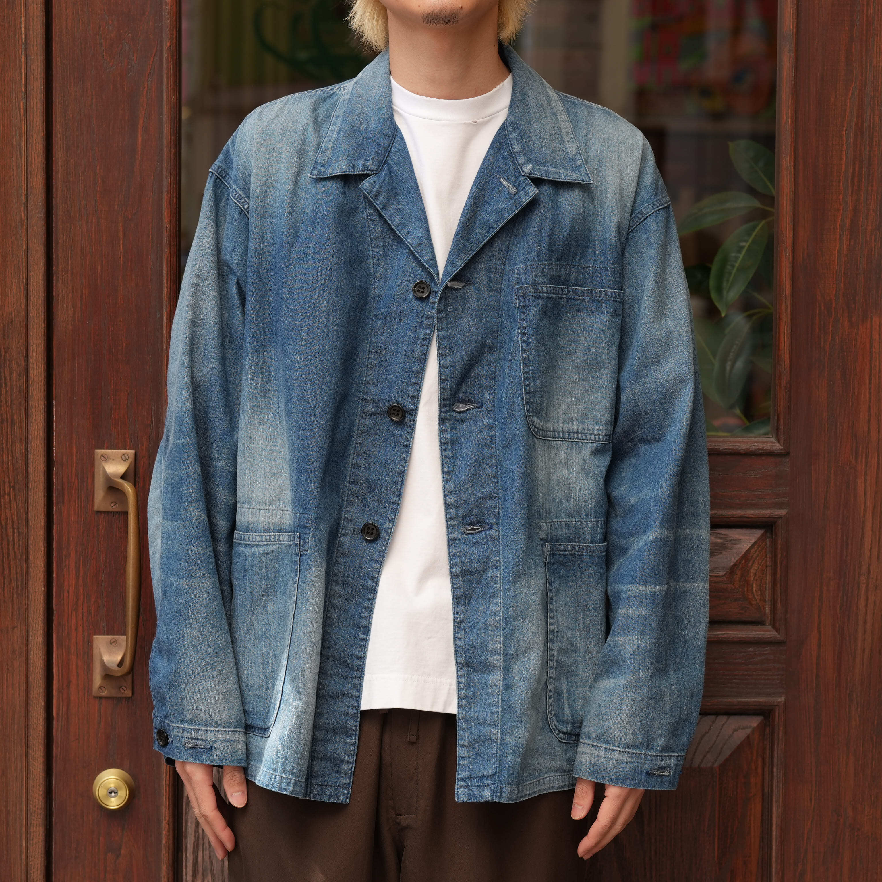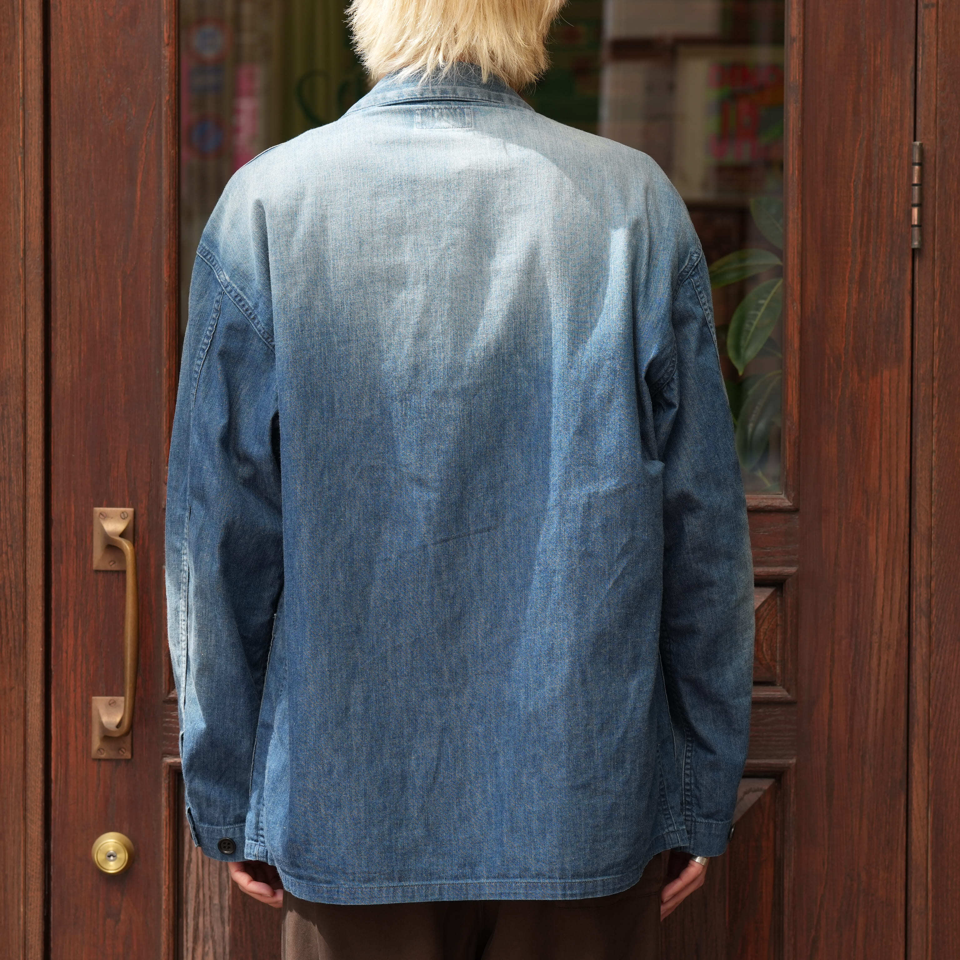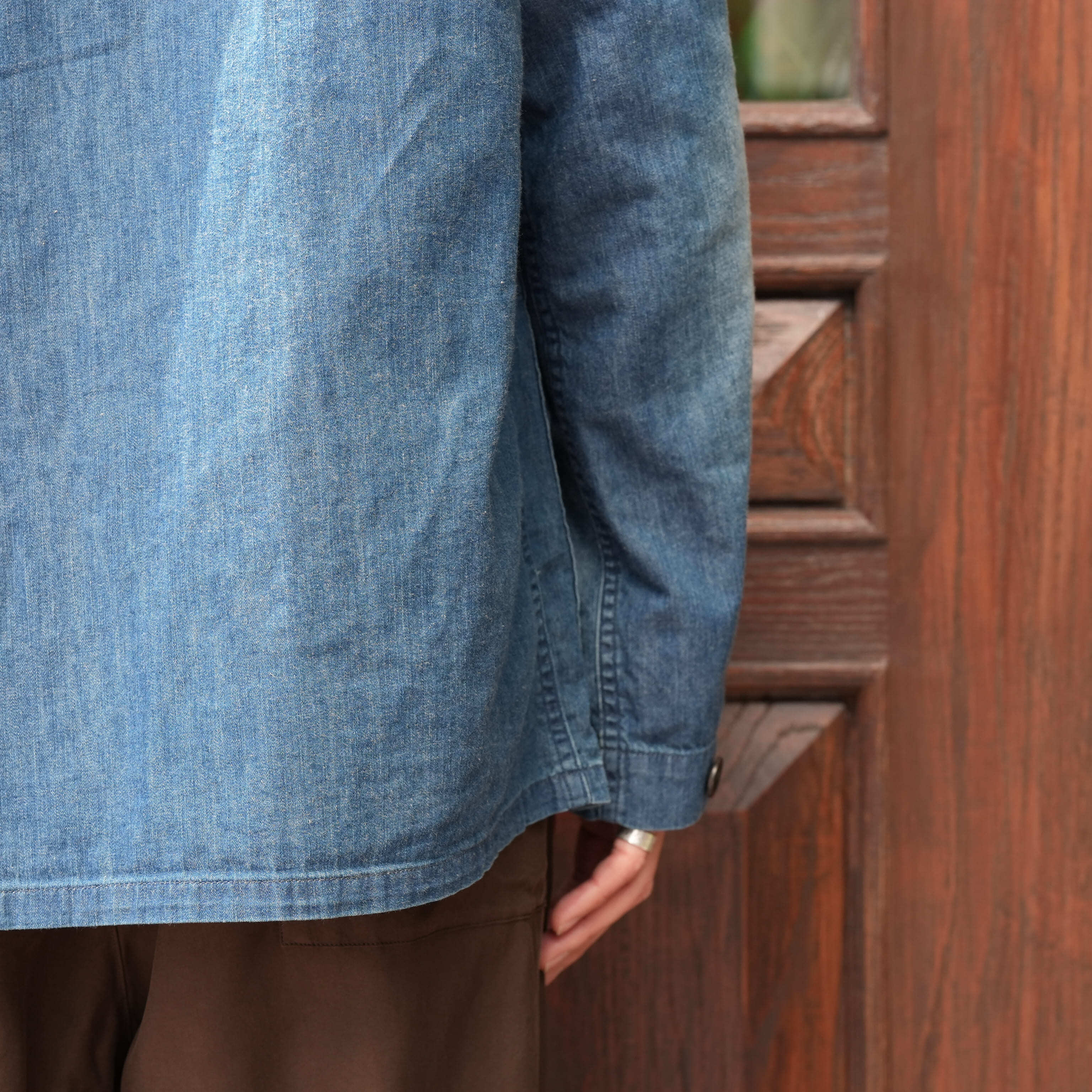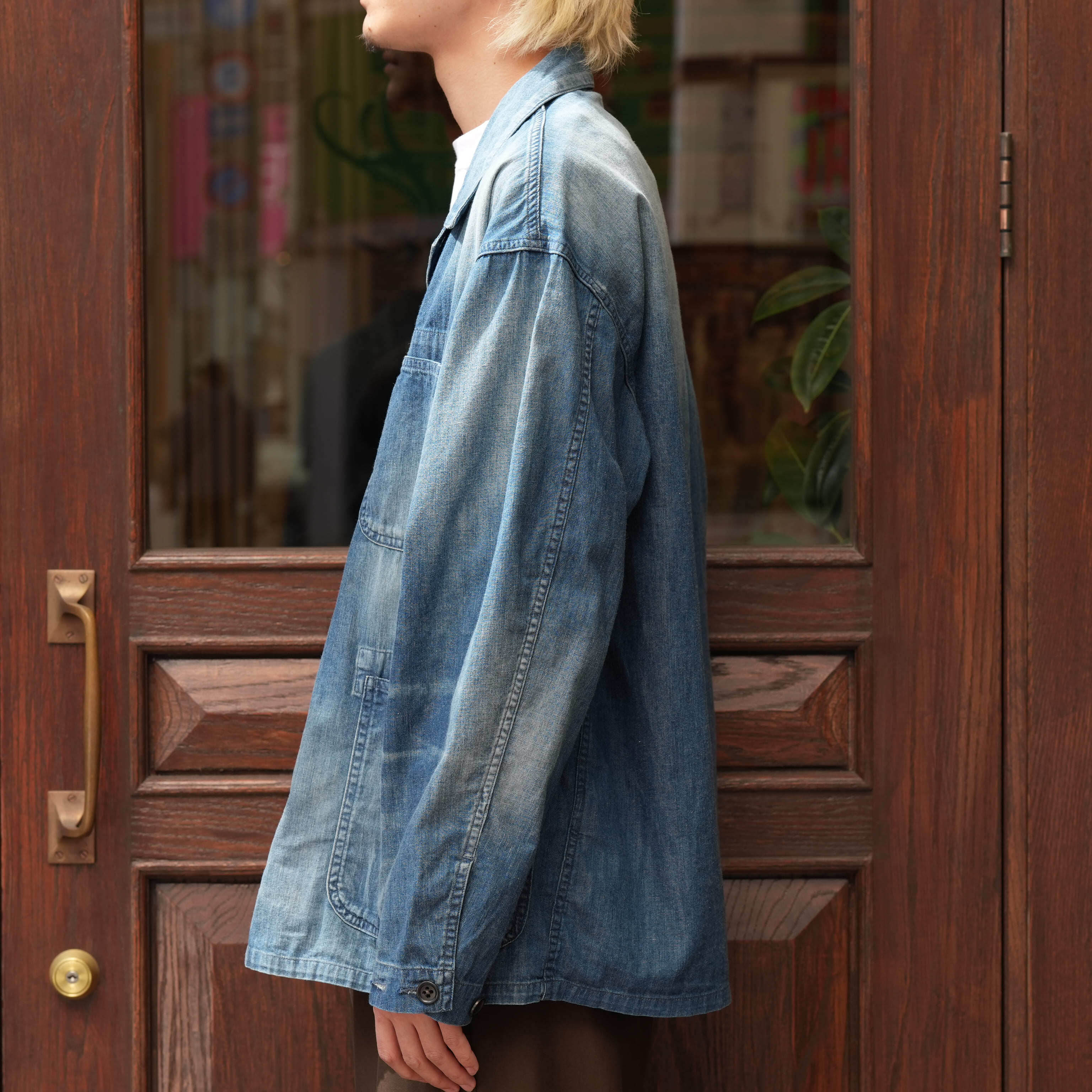特筆すべきは生地の厚み。見た目はデニムのカバーオール、ただ触れると生地はかなり薄く、軽い。着心地が良く、シャツを羽織っている感覚で着用できます。この薄さでデニムカバーオールというのは今まで無かったようなテンションで、勿論カバーオールとしての使い勝手の良さもあり、初夏くらいまで着用できる厚みで、カットソーの上にとりあえず羽織ったり、雑に袖を捲って着たりと、夏にかけてのスタイリングの幅を広げてくれるのでかなり重宝するかと思います。