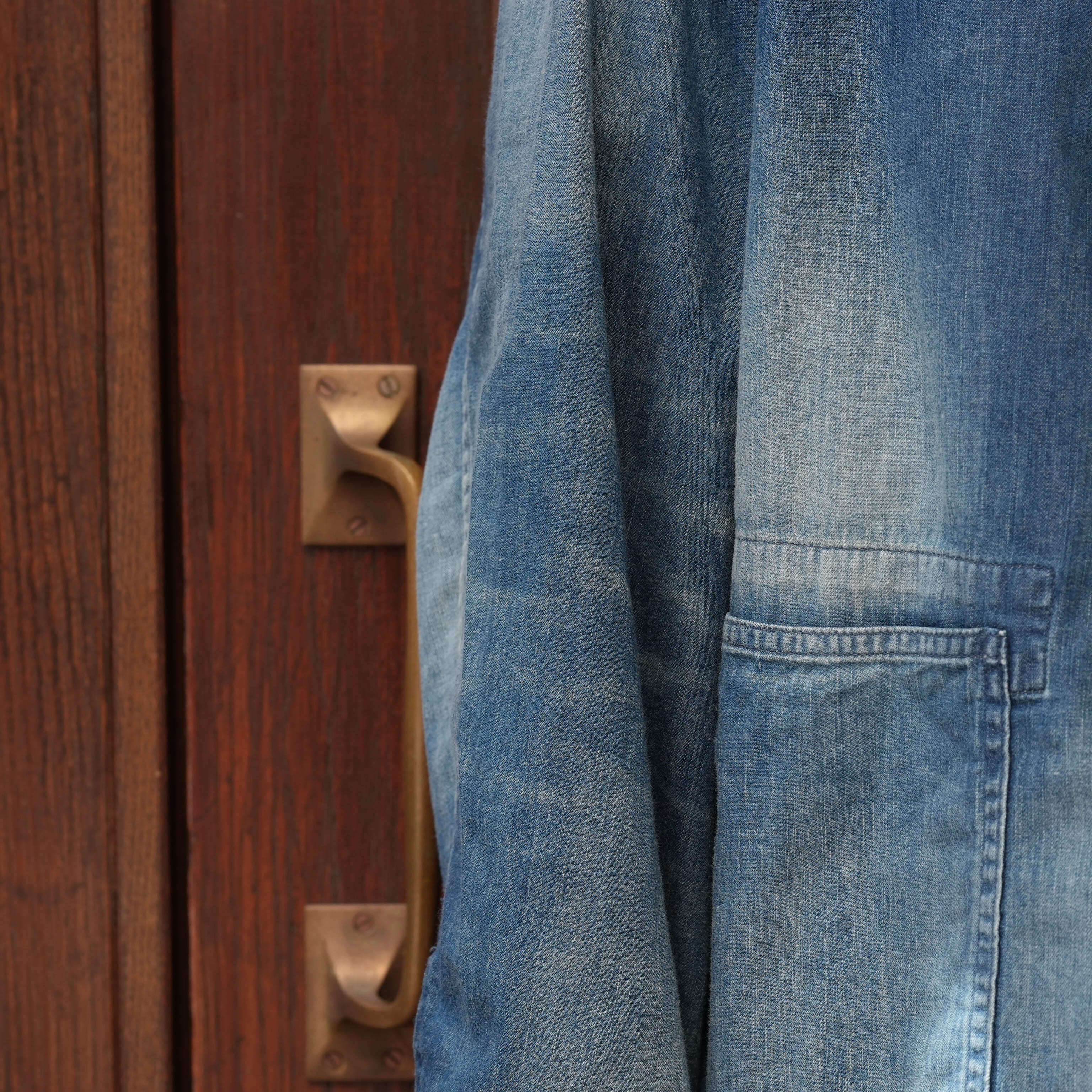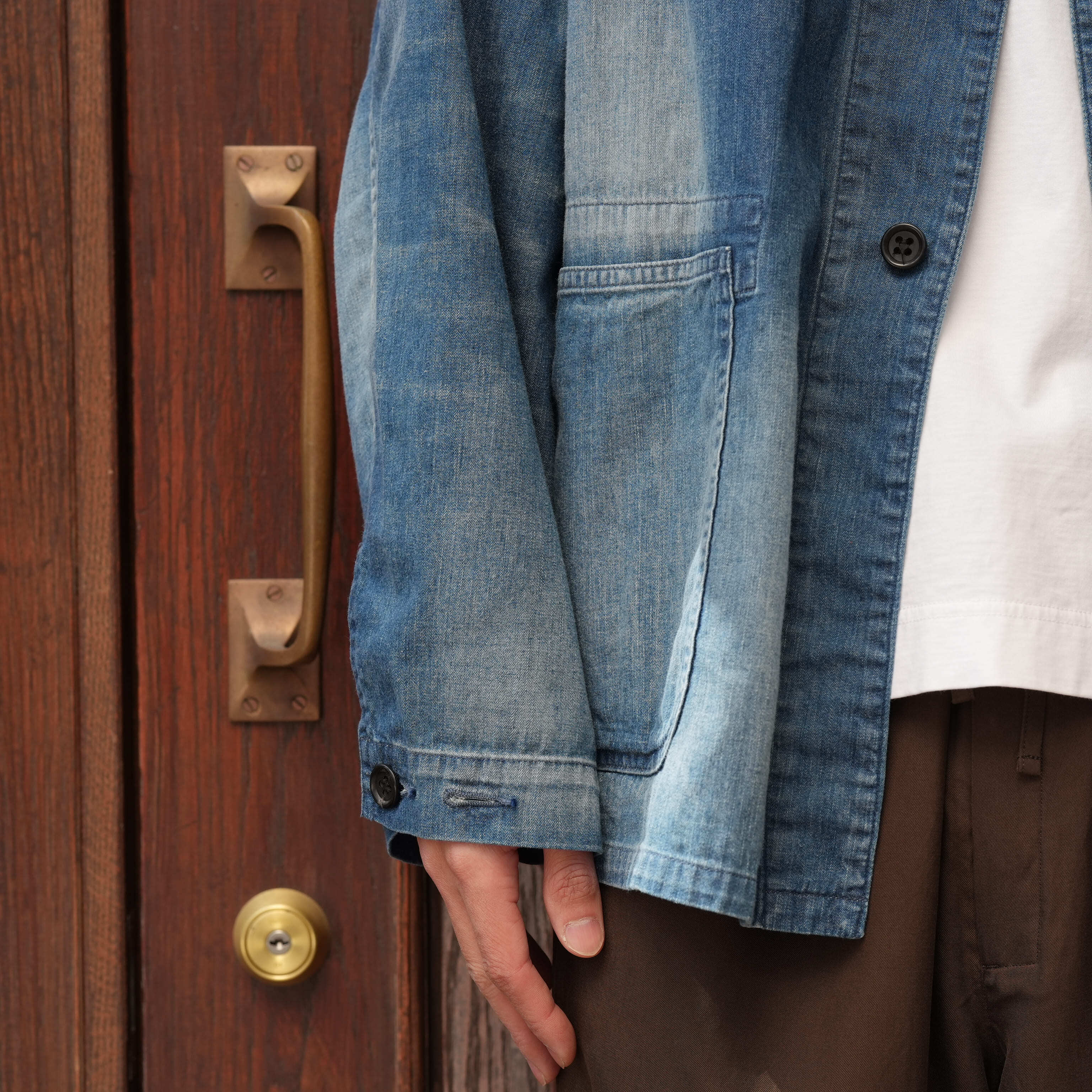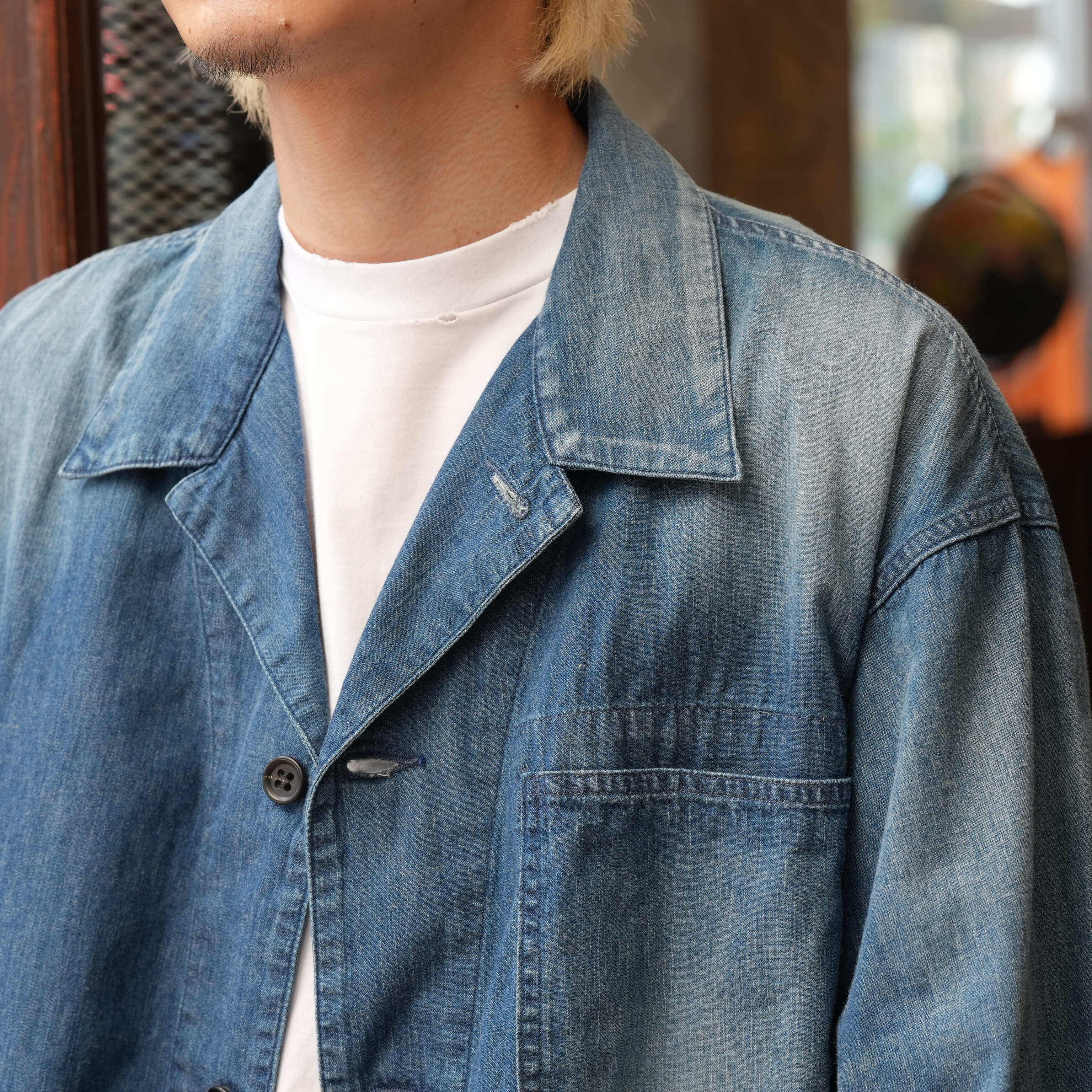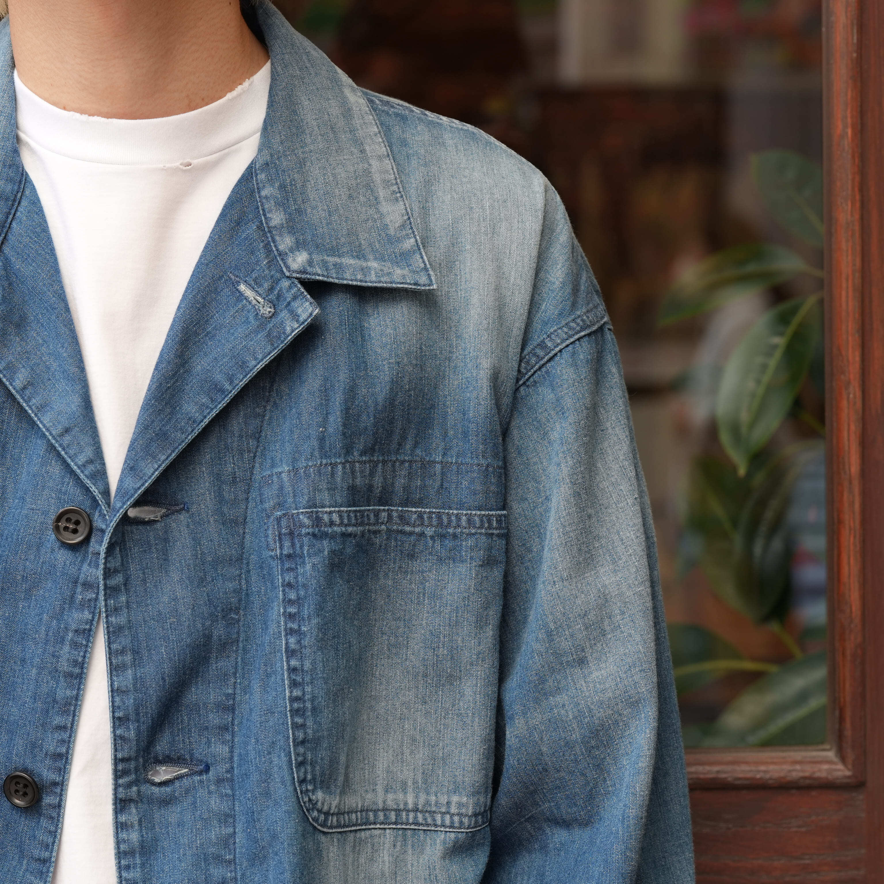 特筆すべきは生地の厚み。見た目はデニムのカバーオール、ただ触れると生地はかなり薄く、軽い。着心地が良く、シャツを羽織っている感覚で着用できます。この薄さでデニムカバーオールというのは今まで無かったようなテンションで、勿論カバーオールとしての使い勝手の良さもあり、初夏くらいまで着用できる厚みで、カットソーの上にとりあえず羽織ったり、雑に袖を捲って着たりと、夏にかけてのスタイリングの幅を広げてくれるのでかなり重宝するかと思います。