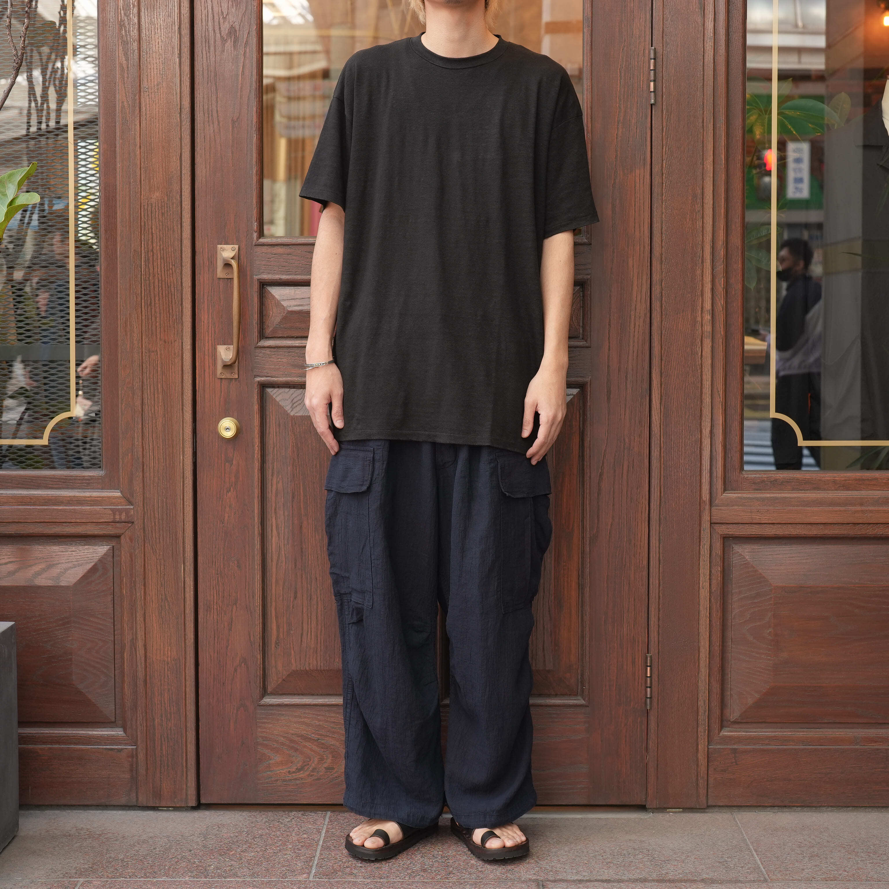 なんと言ってもこのリネンの独特な質感が素晴らしい。生地の動きが抜群に良く、型はファティーグ型でHERILLなりのボリュームのあるシルエットに。通気性が抜群によく、リネンならではの抜け感と清涼感がある。ファティーグとしての存在感がありながら、この生地の雰囲気なので野暮ったくなり過ぎず、どこか洗練された雰囲気なのも非常にいい。シャツやカットソーにとりあえず合わせておけばカッコイイ、そんなパワーのあるパンツです。