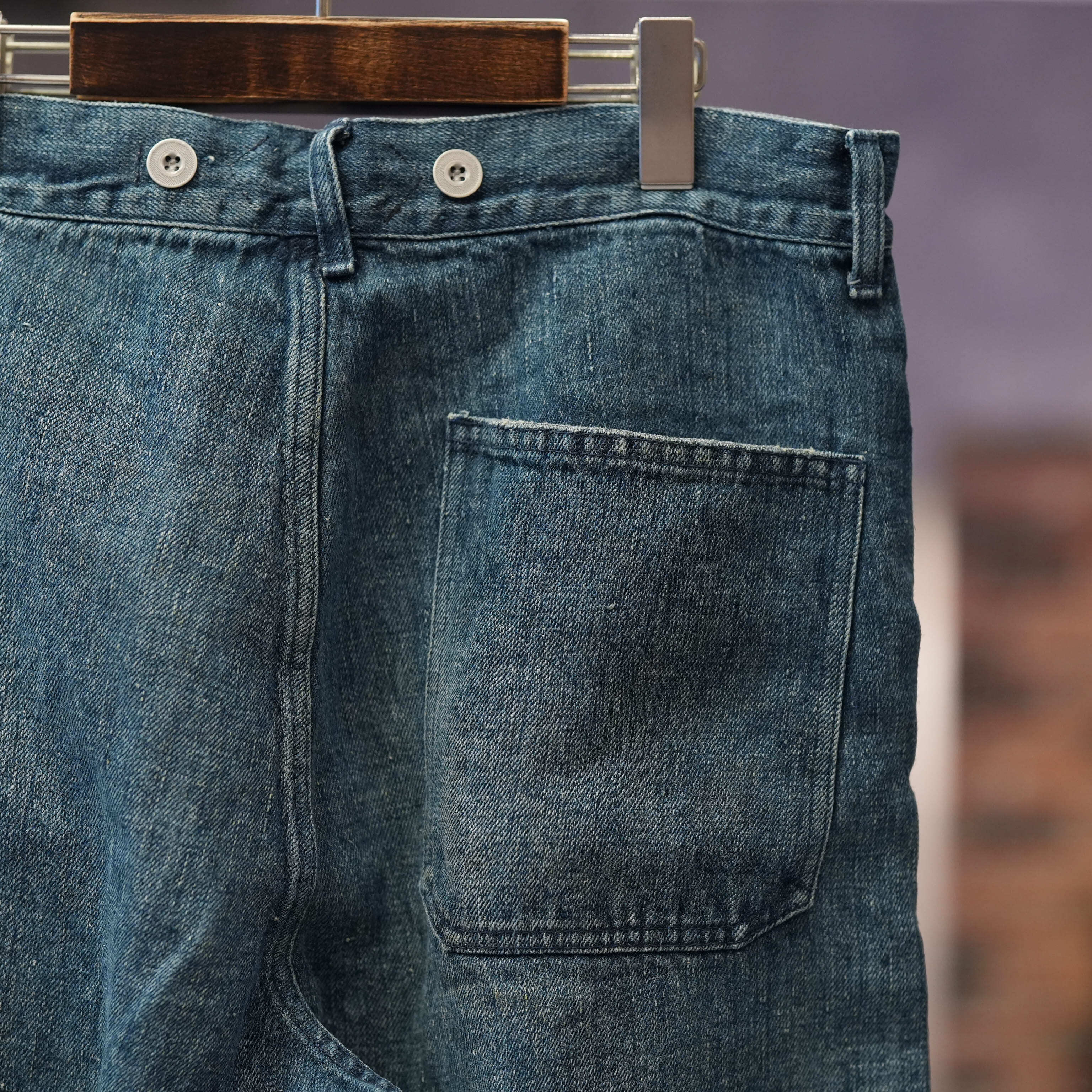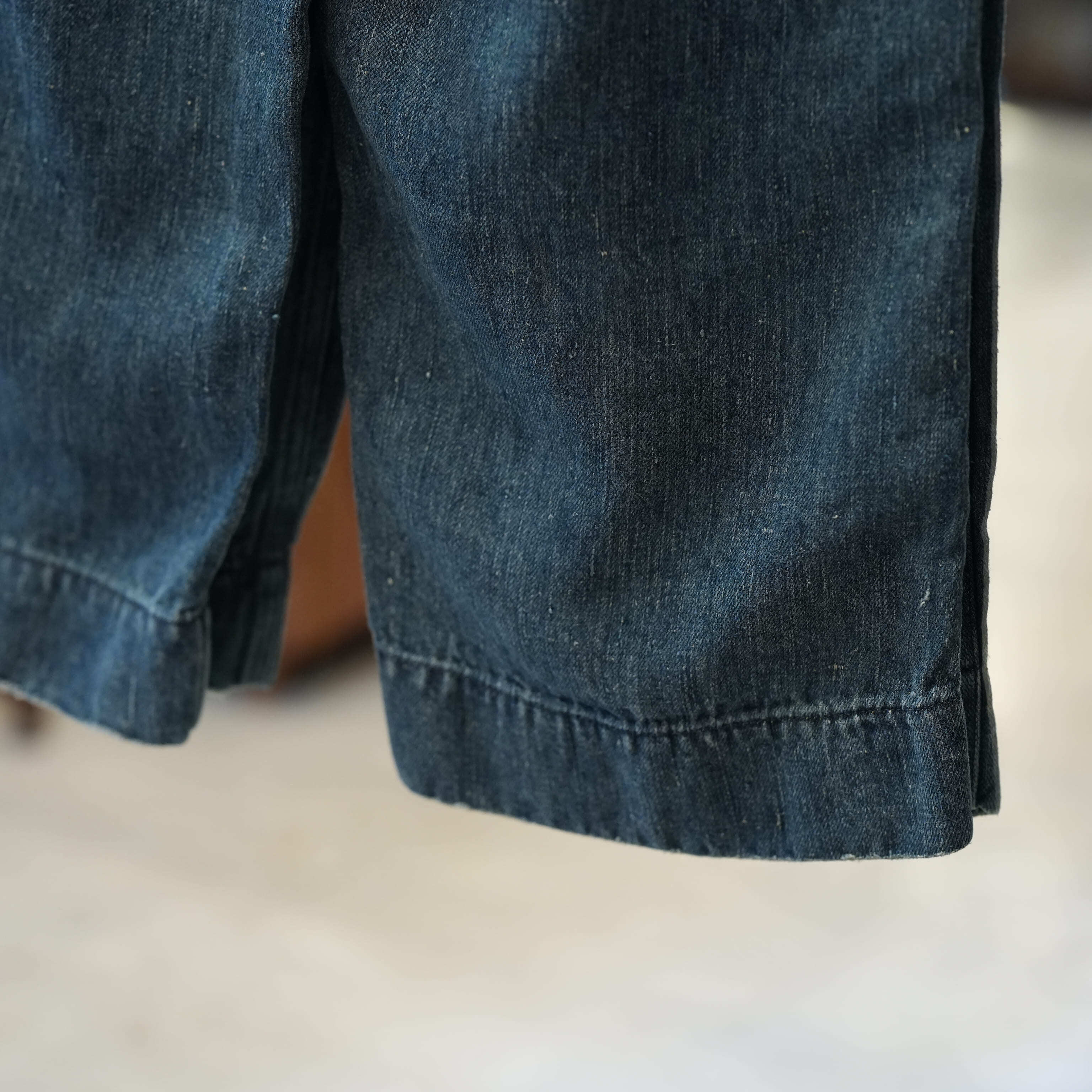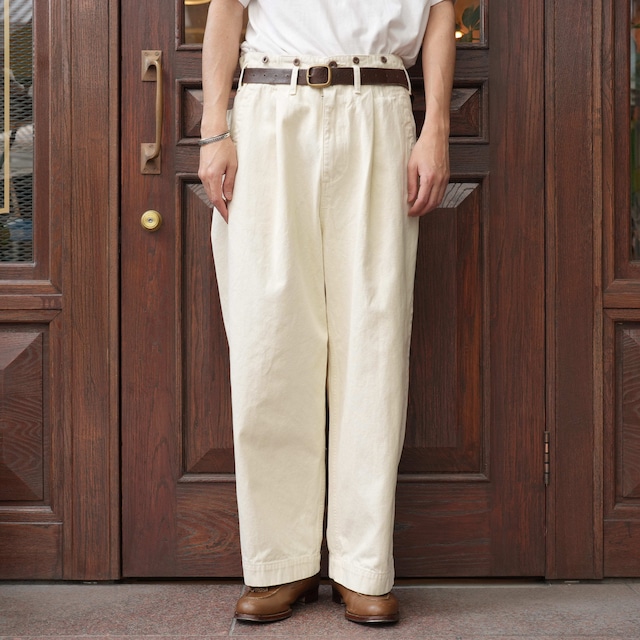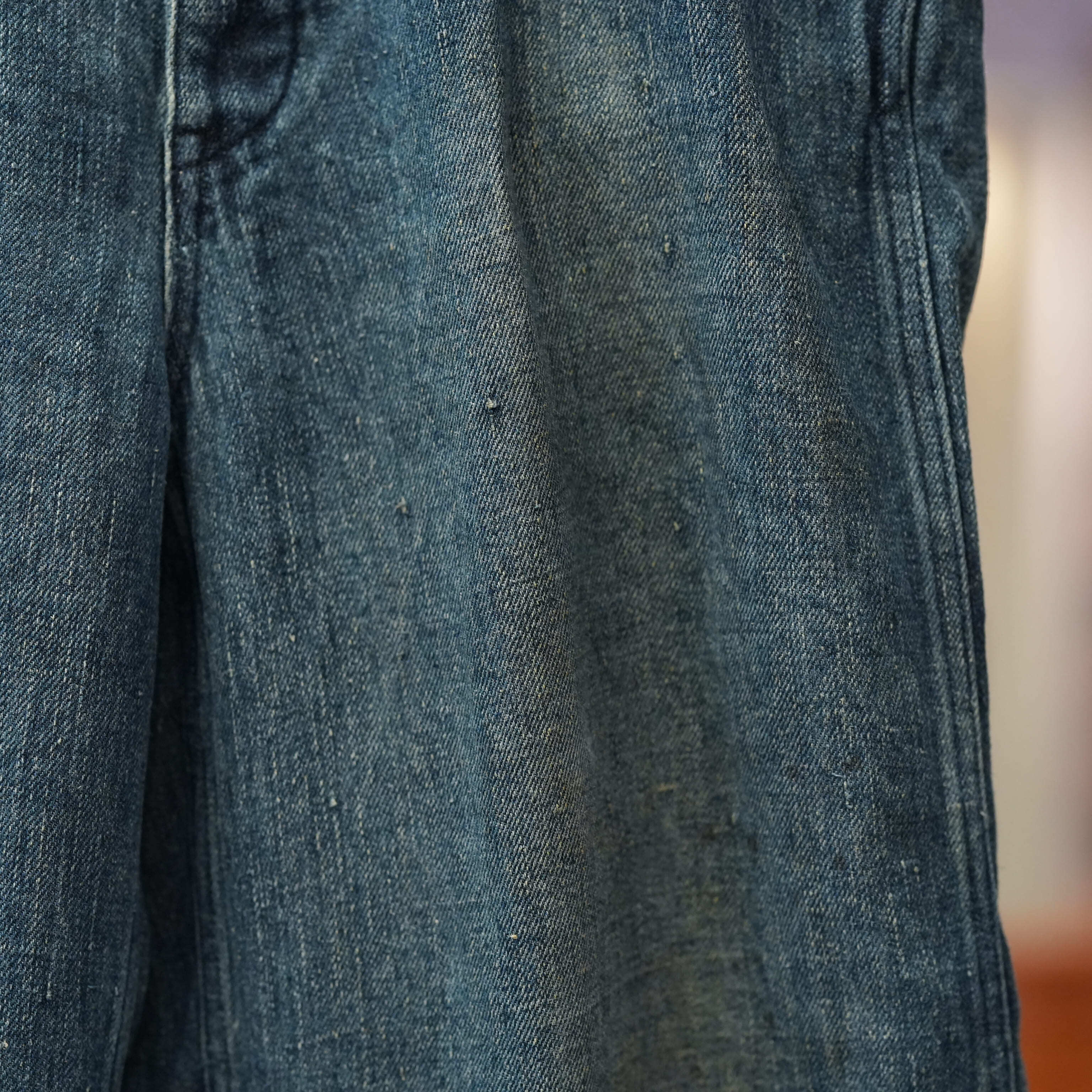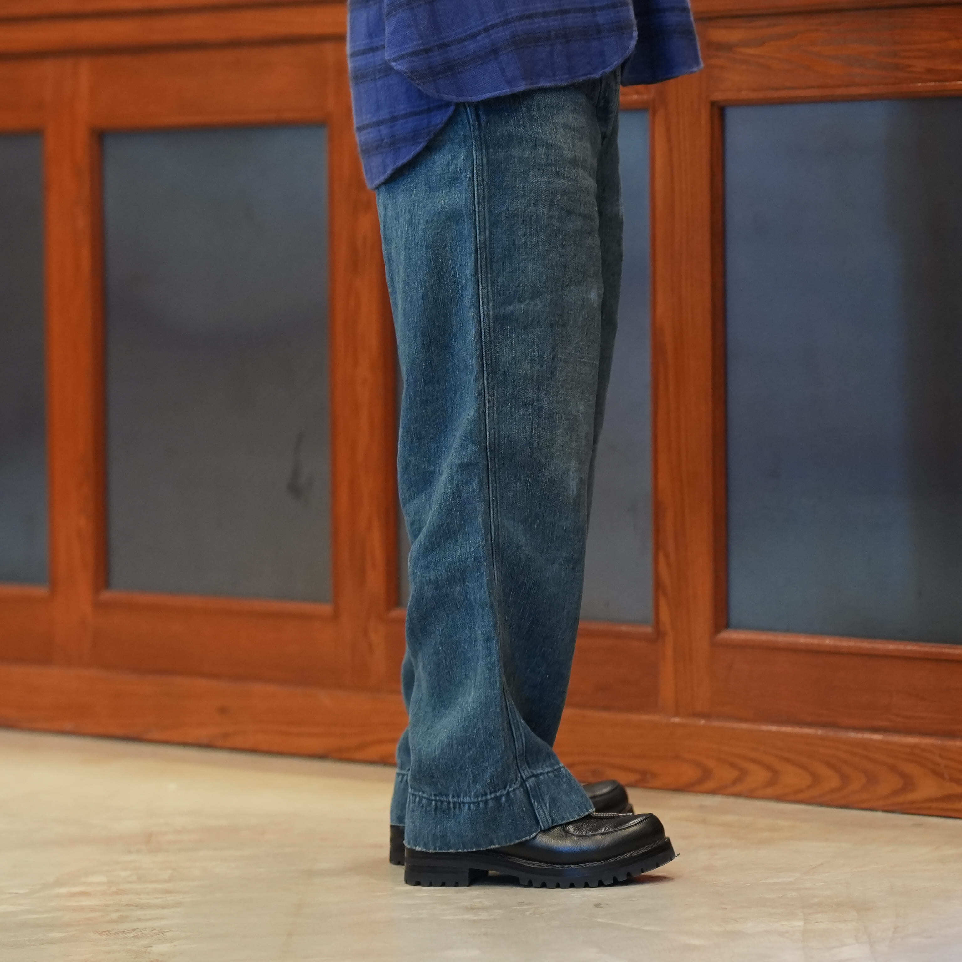 こちらもUKファブラム社のインディゴワークスラックスをデザインベースにしております。シルエットはAUBERGEの41チノに近いワイドバギータイプで素材の迫力と相まって存在感のある1本です。加工は岡山・豊和でのスーパーリアル洗い。