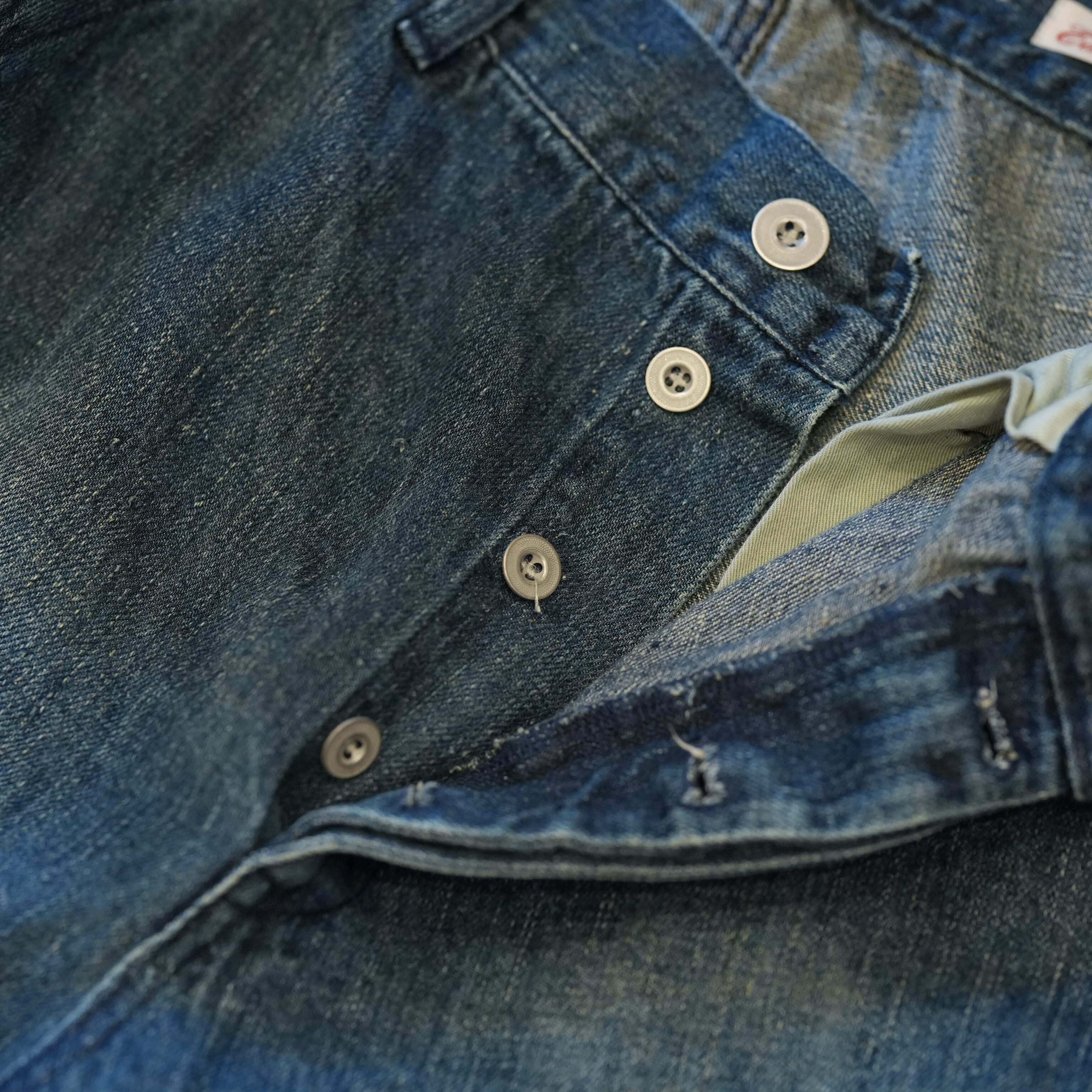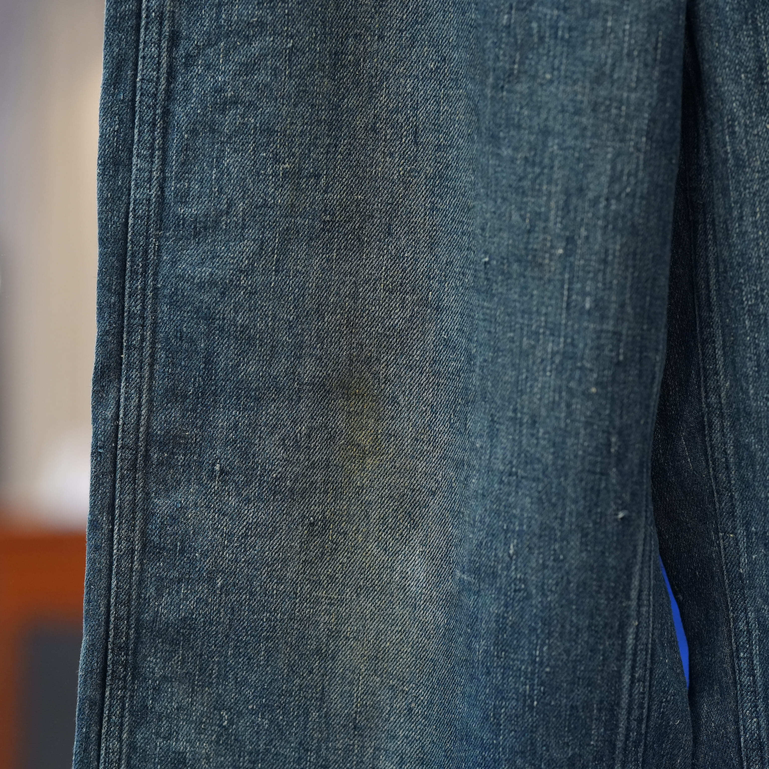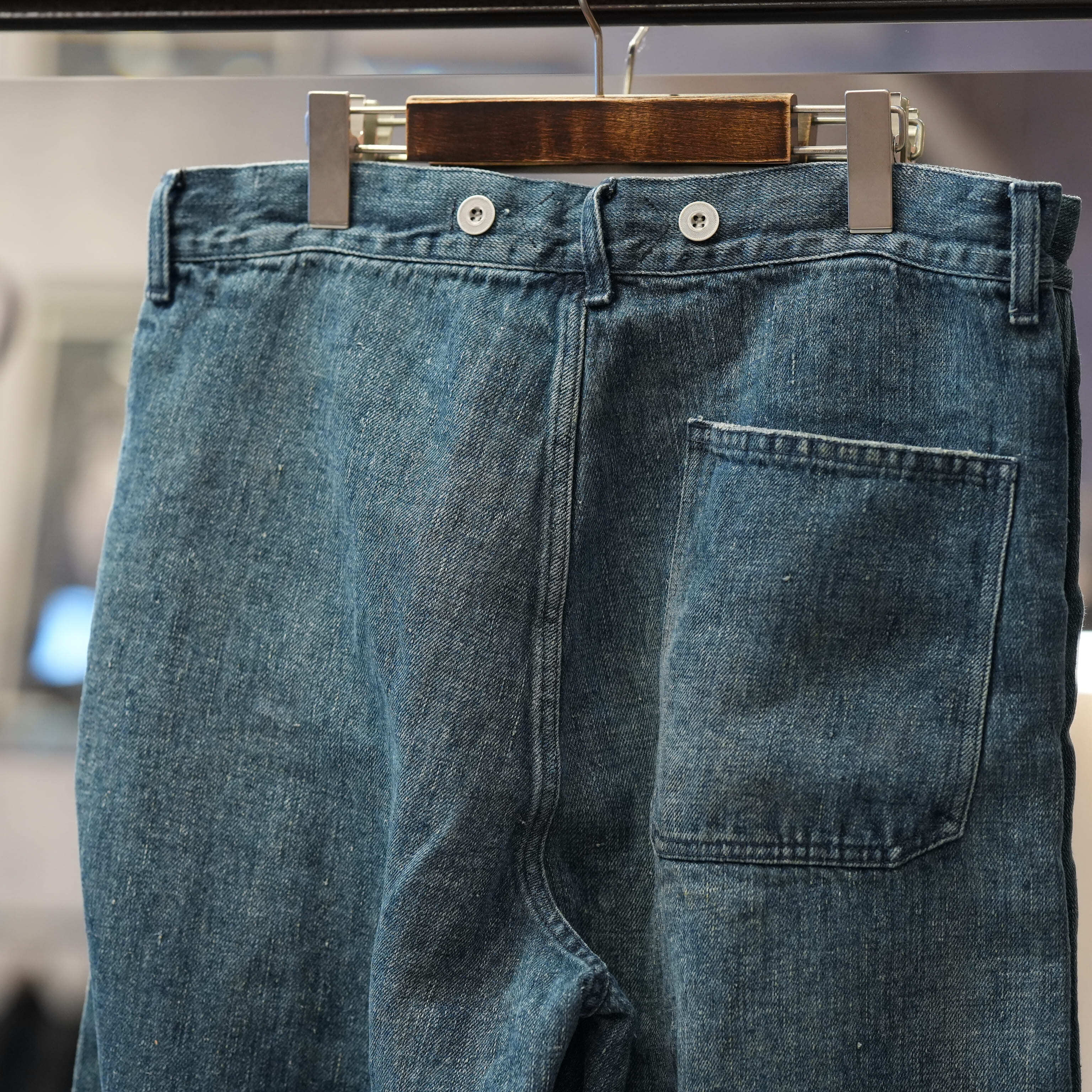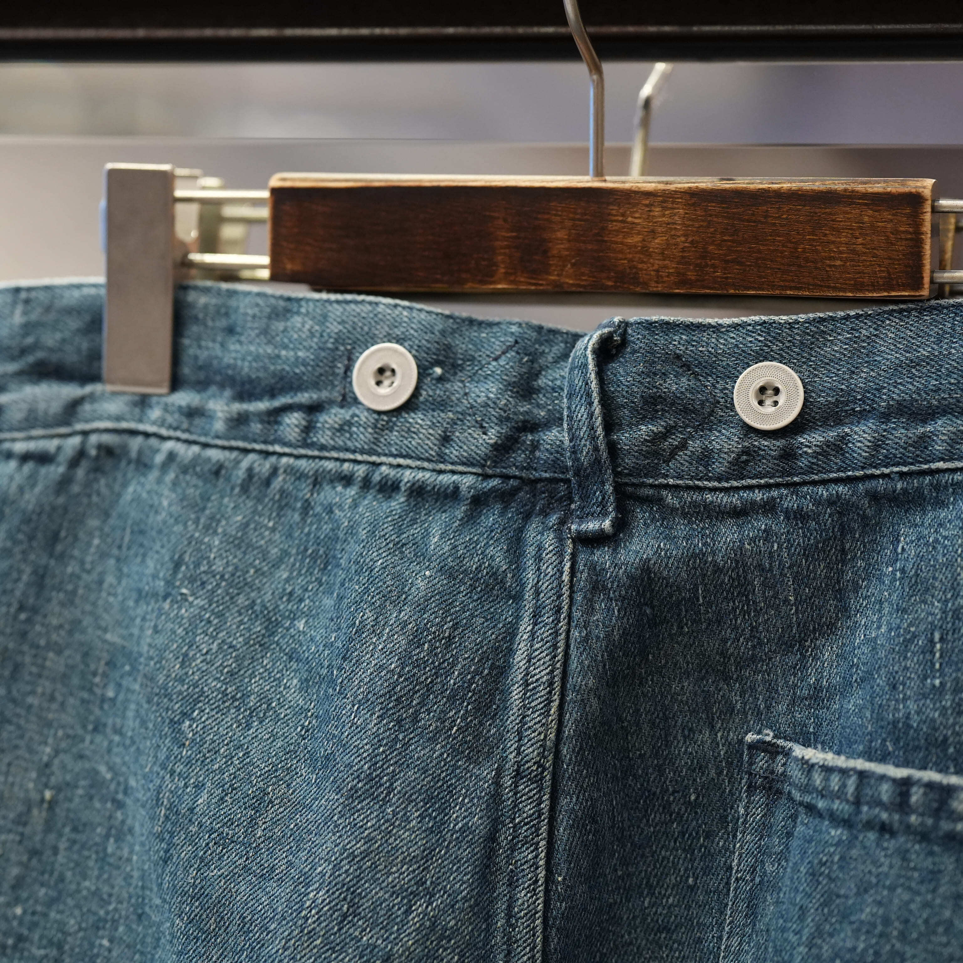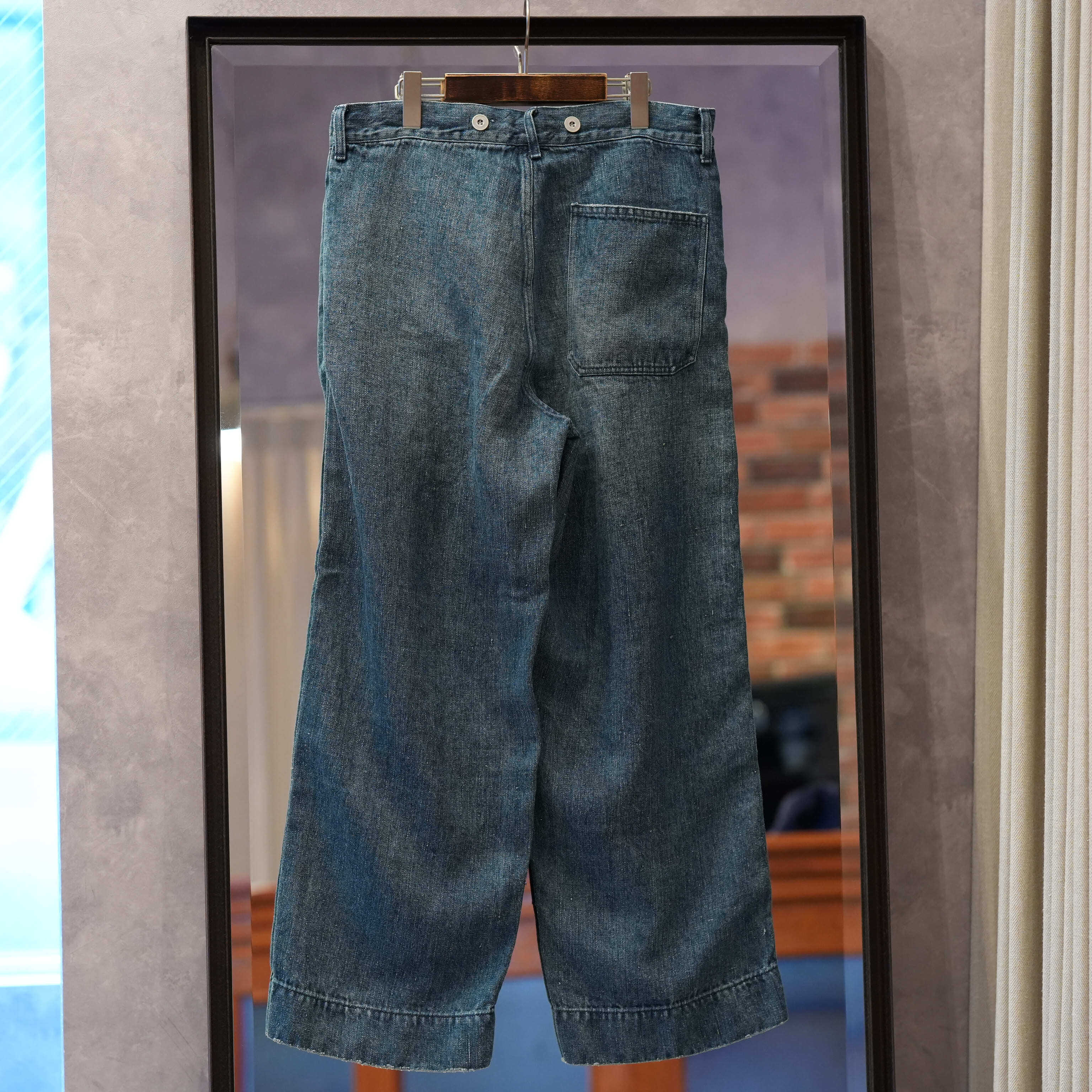 こちらもUKファブラム社のインディゴワークスラックスをデザインベースにしております。シルエットはAUBERGEの41チノに近いワイドバギータイプで素材の迫力と相まって存在感のある1本です。加工は岡山・豊和でのスーパーリアル洗い。