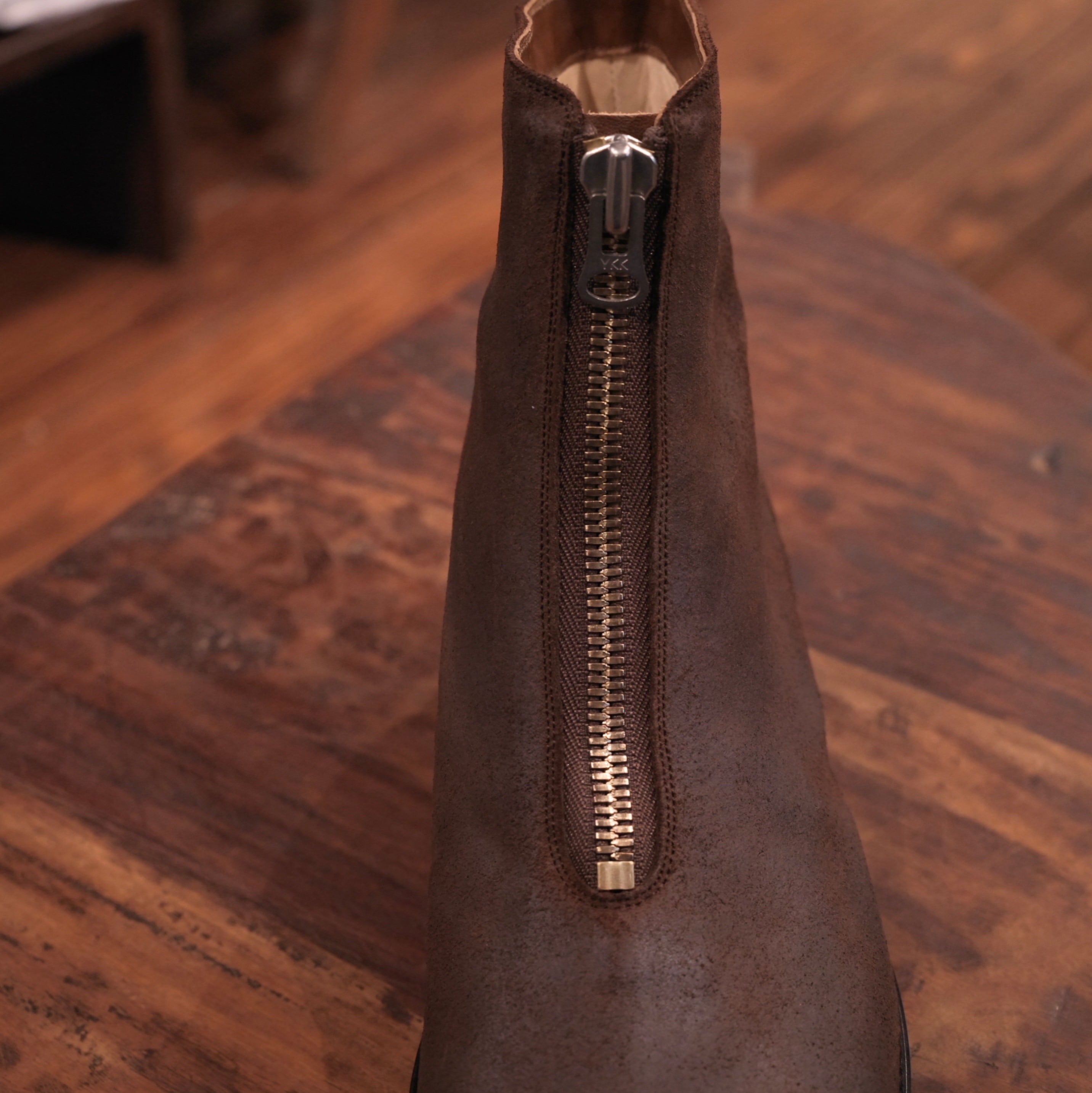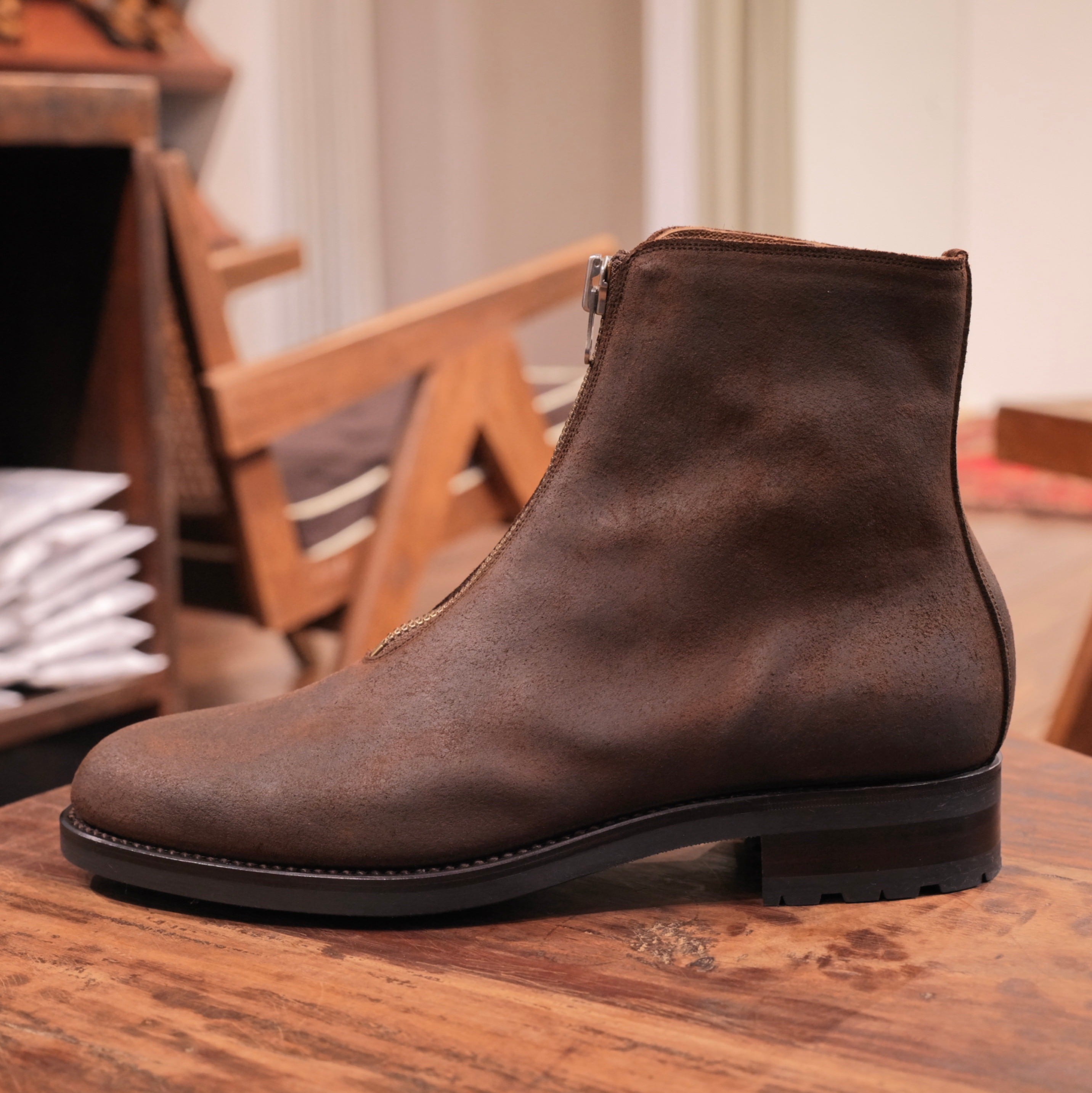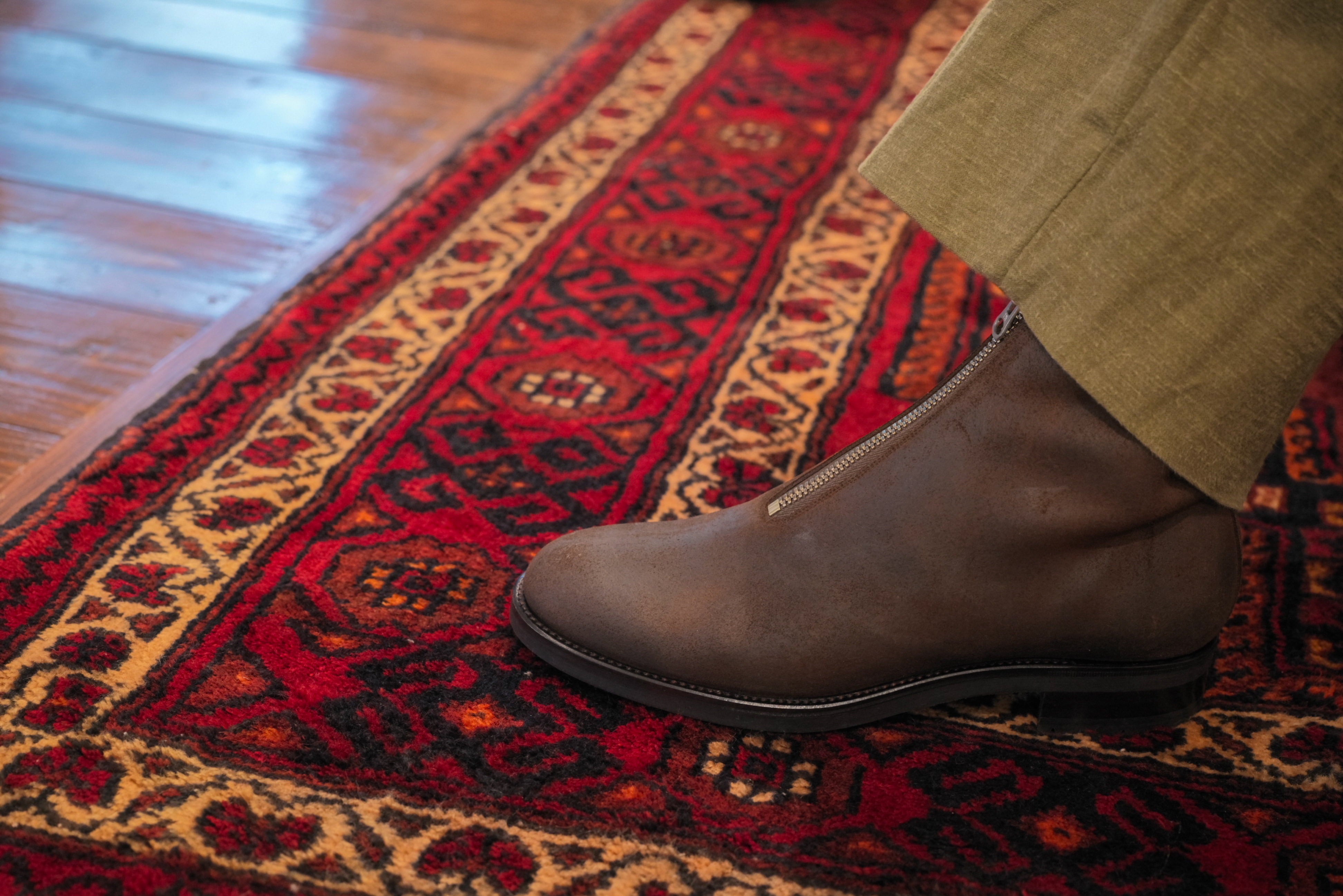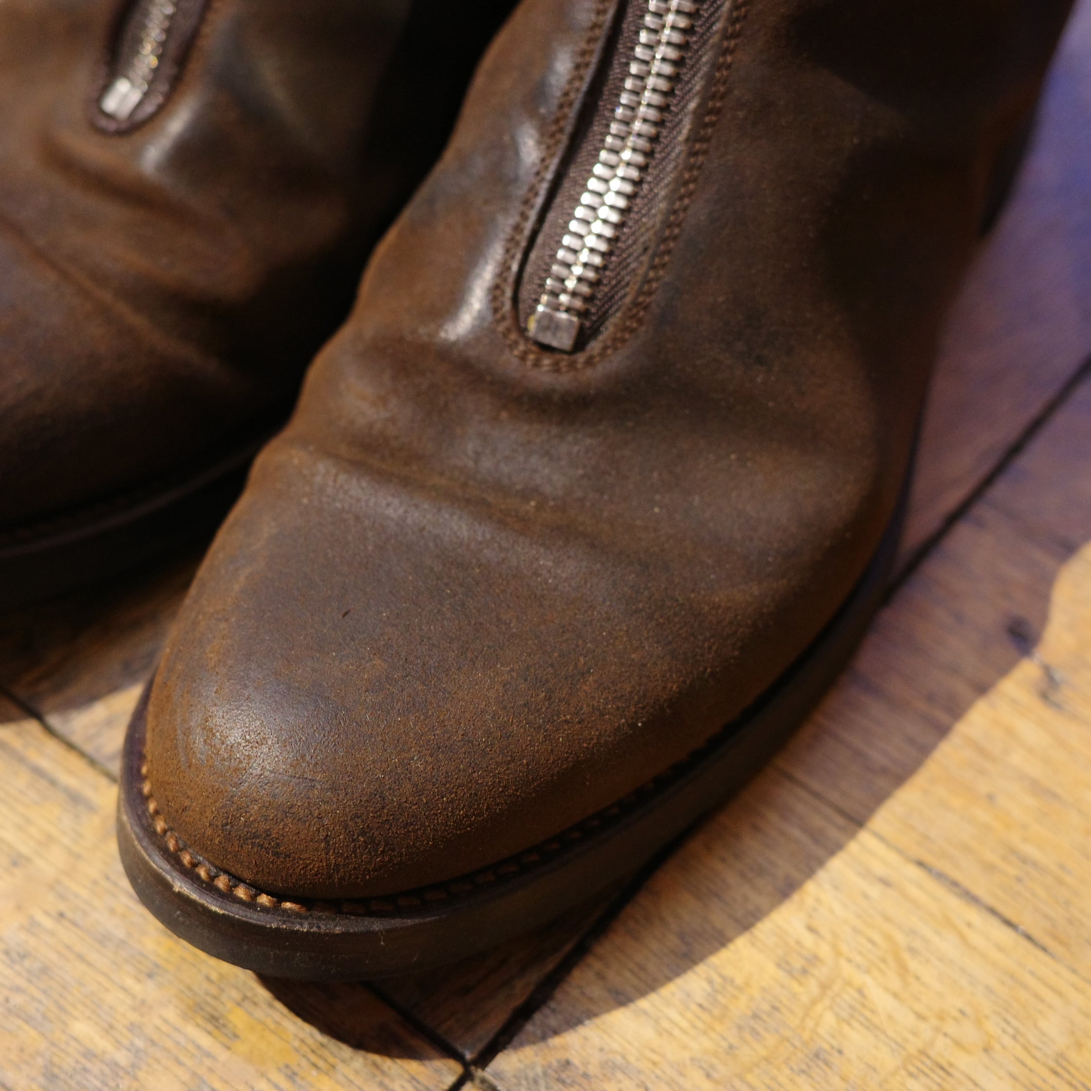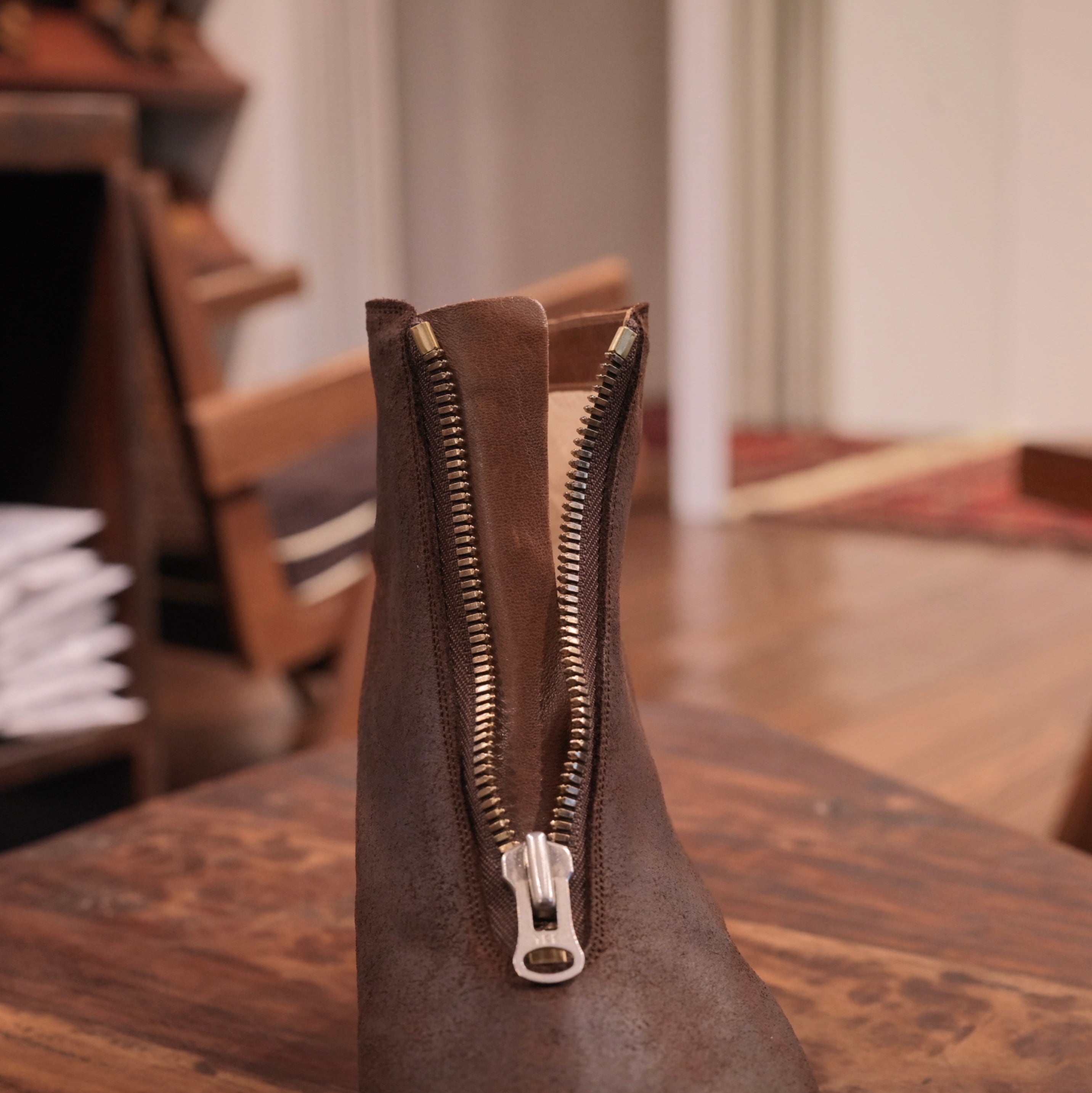 今シーズンの新品番として入荷したのは風の如く旅立っていった"molder"をベースとし、ジップをセンターに配する事でボトムのシルエット、動きに合わせてチラッと見えるアクセントだけではなく、履き口をタイトに作ることでまるでレザーのソックスを履いているような履いているような印象を与えてくれます。