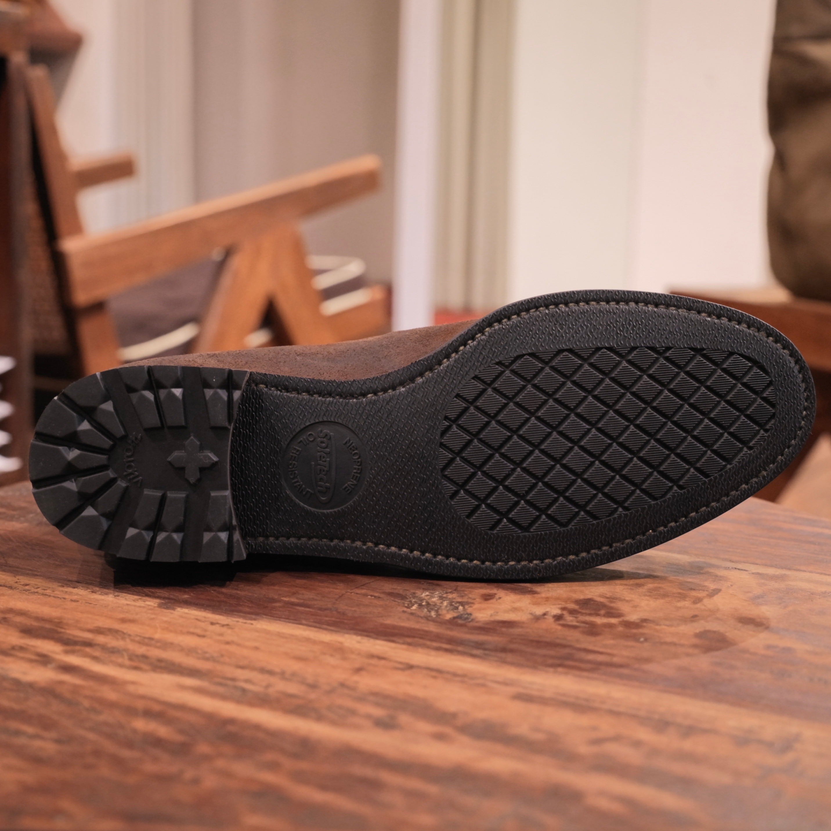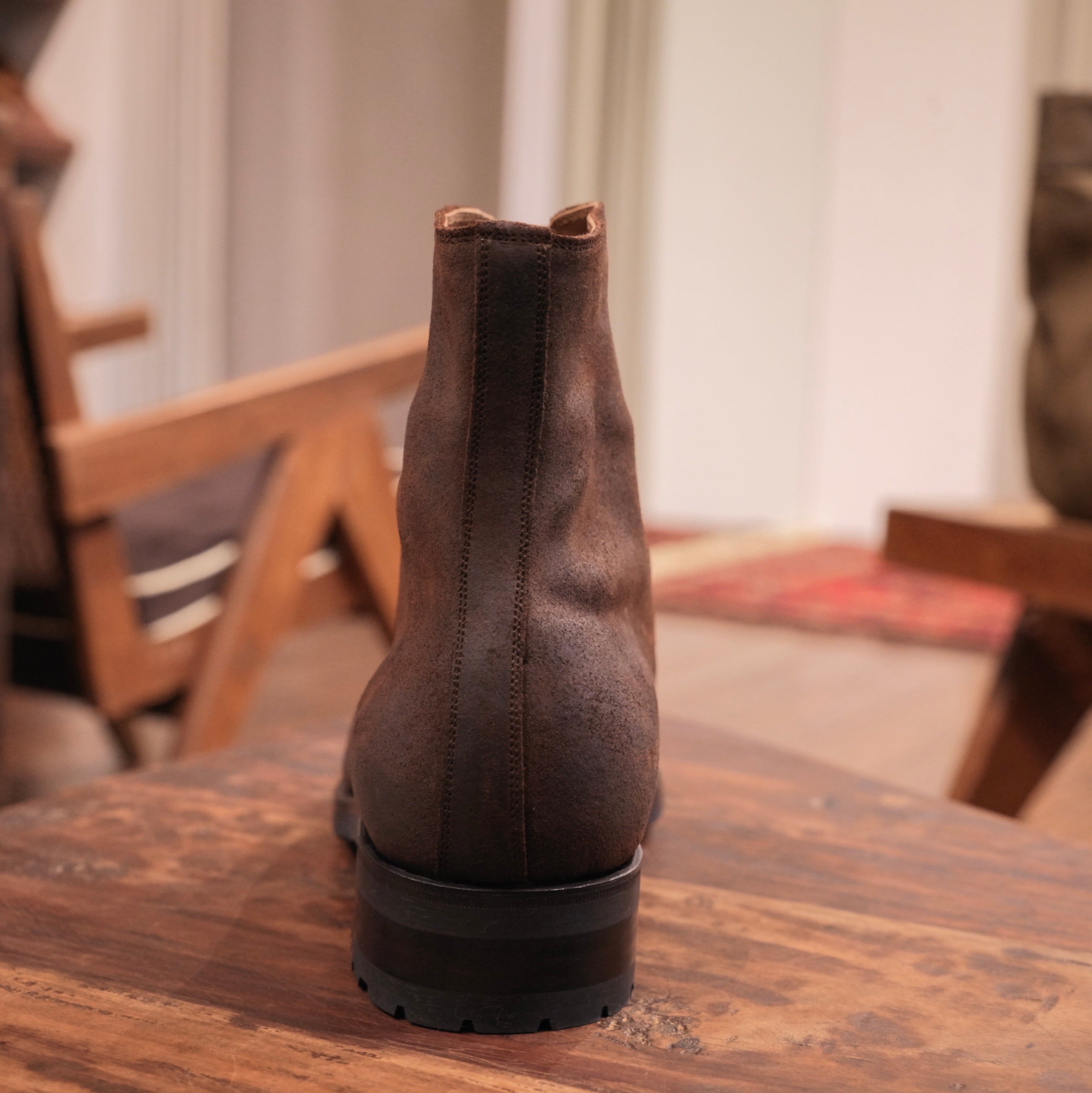 ヌバック素材を特殊なら製法で縮ませる事で繊維構造を密にし、オイルをたっぷり加える事でウォータープルーフとなっています。勿論、履きこむ事で色は濃くなり、アートの様な履き皺がより一層愛着の湧くものとなります。(画像13~15枚目は半年間履き込んだ物)