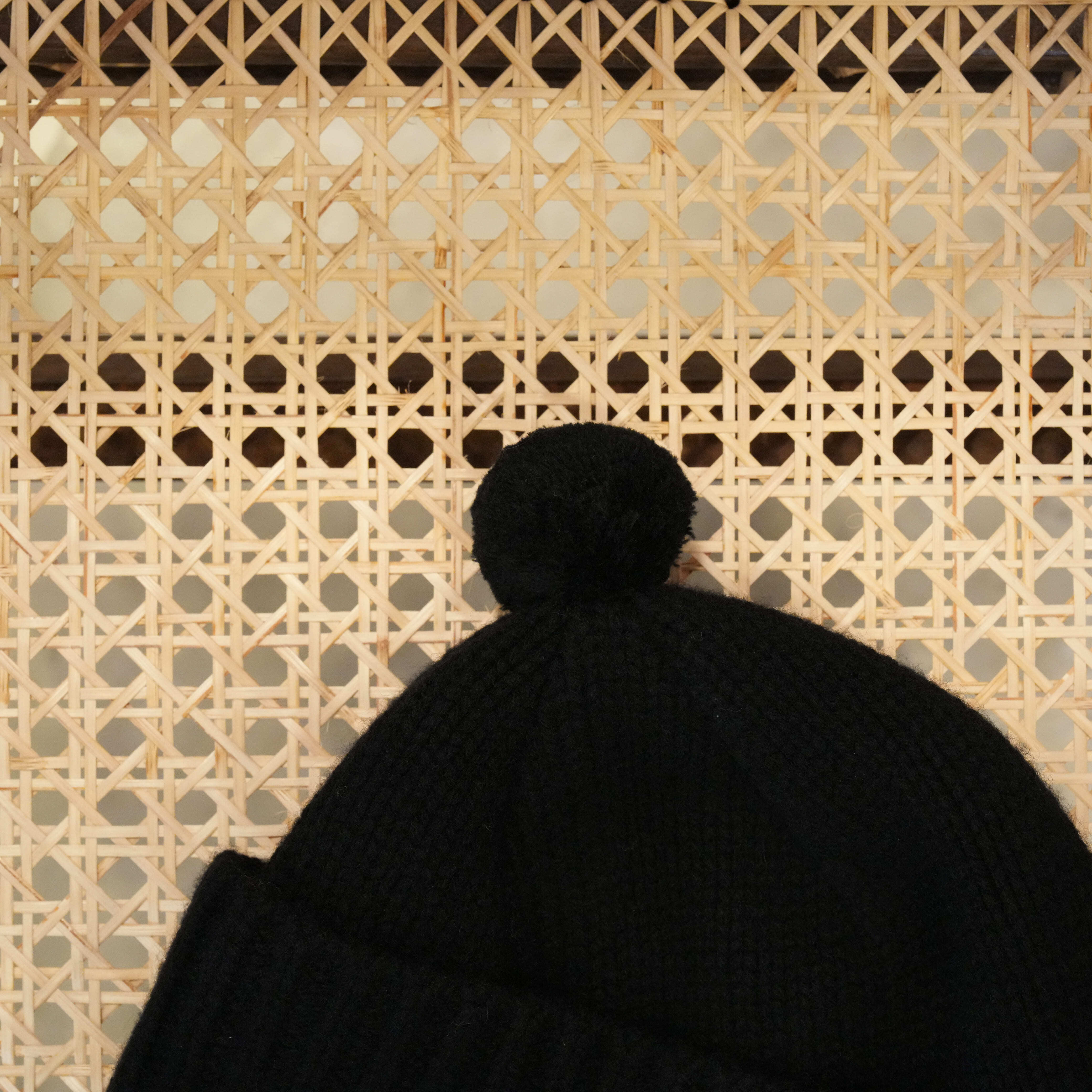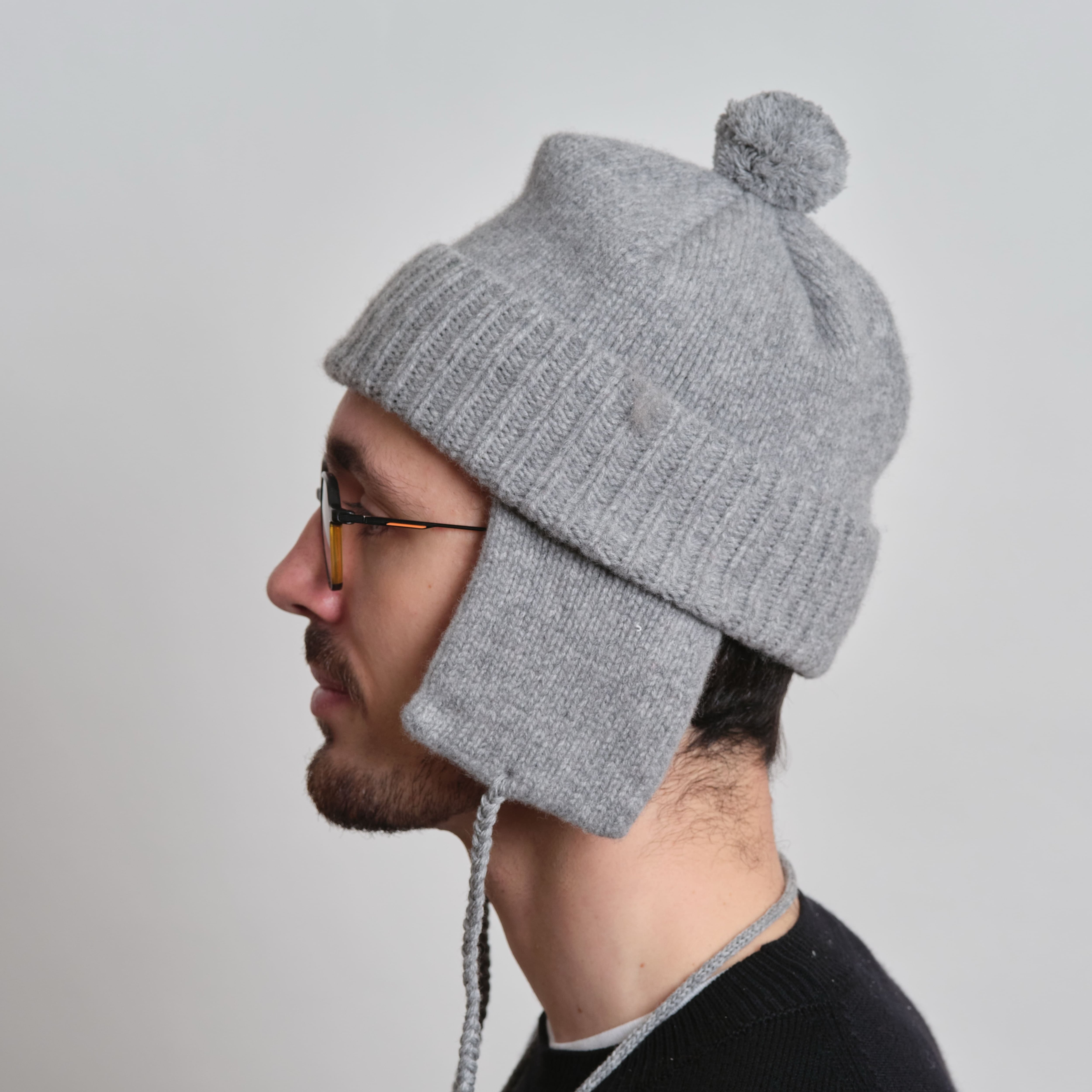 ふわっとした優しい風合いのエクストラファインラムズウールで編み立てた耳付きポンポンニット帽。三つ編みのひもを垂らしレトロな雰囲気を持ちながらも、イヤーフラップのデザイン、全体のバランスなど細かなディテールに気を配り新鮮な印象も持たせました。