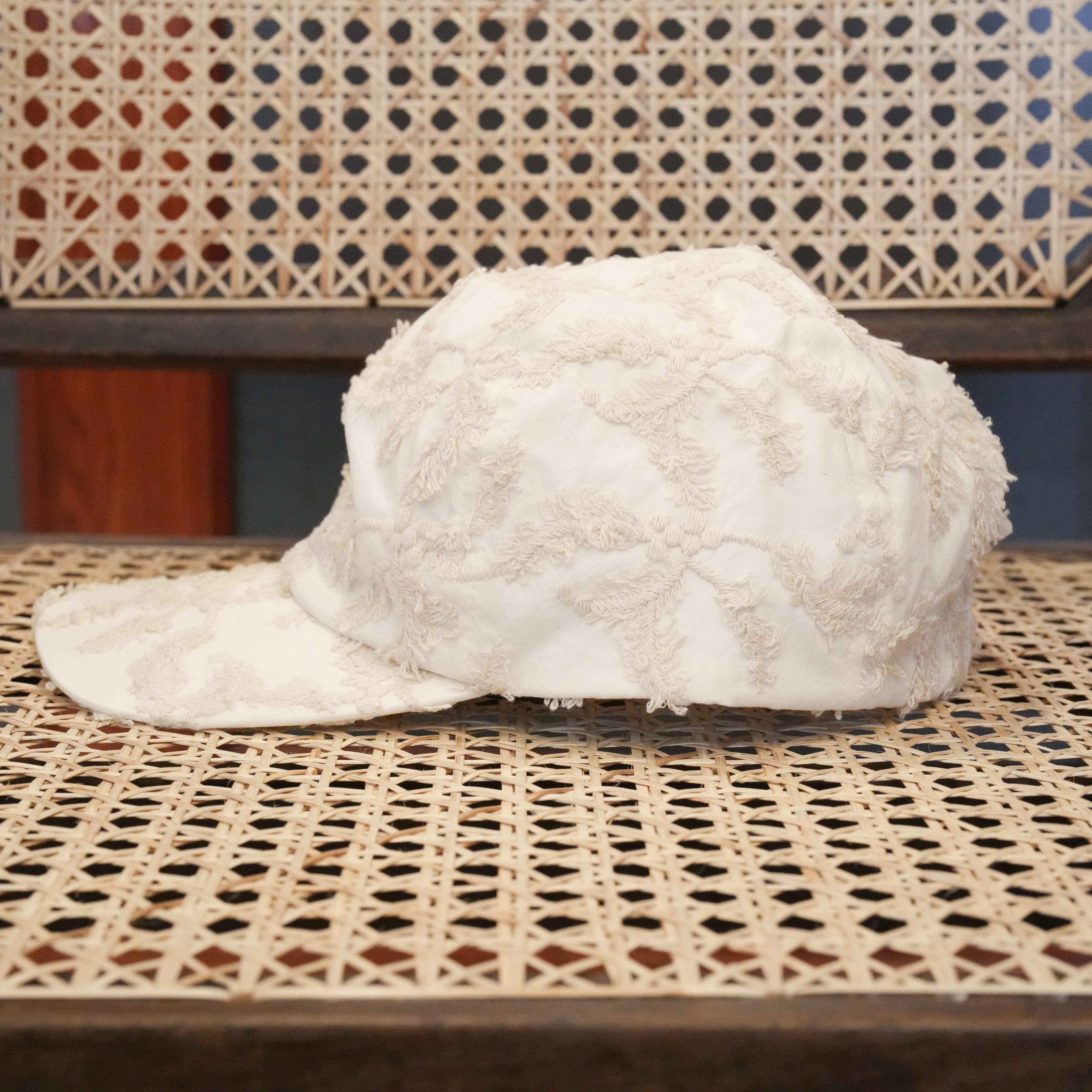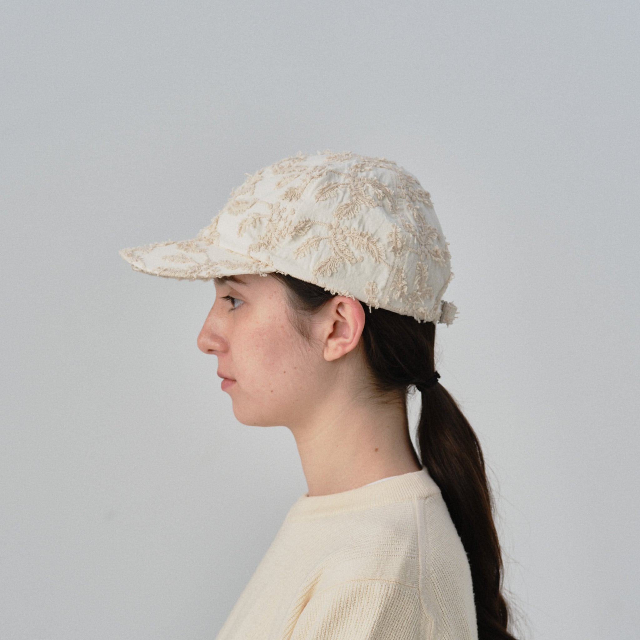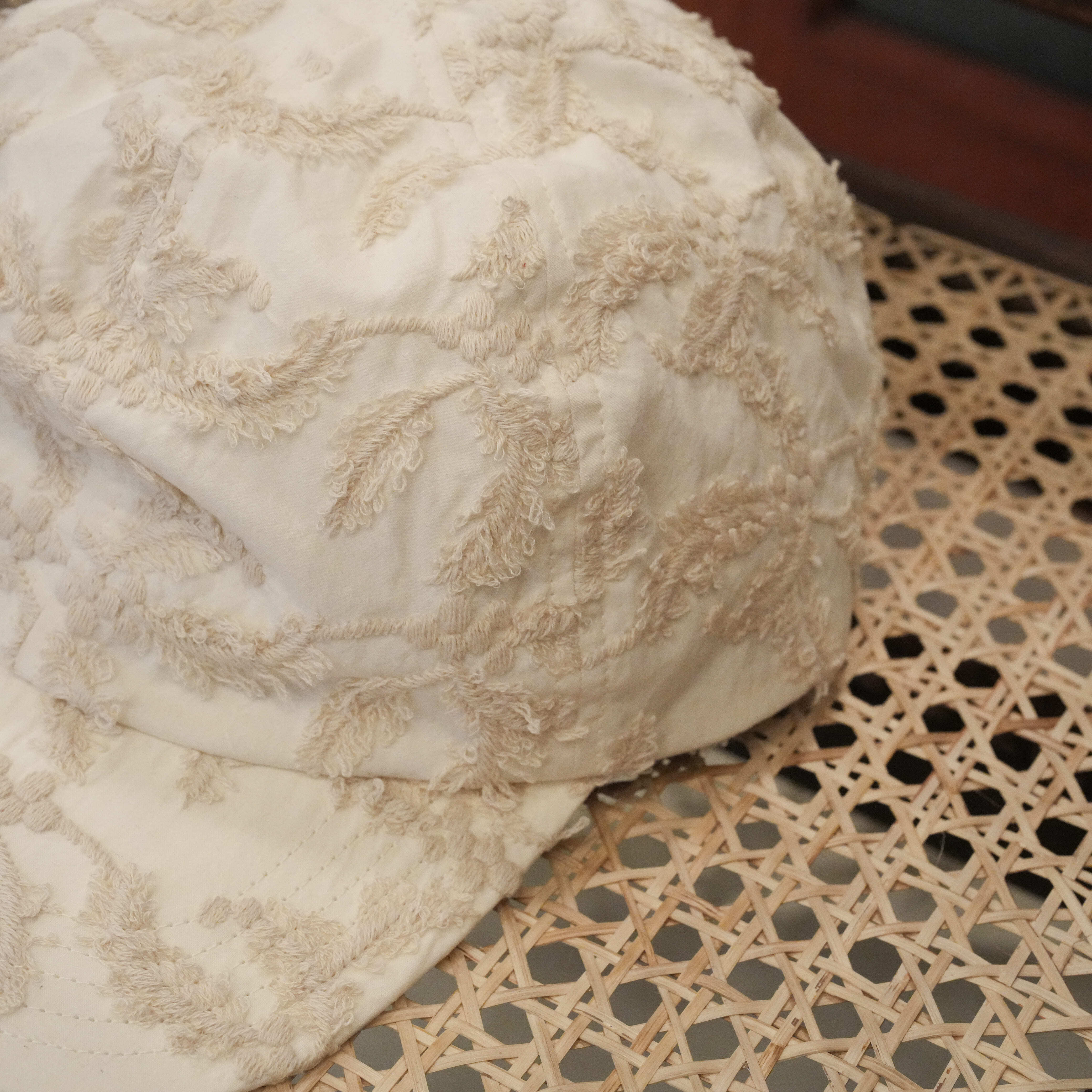 ボタニカル柄の刺繍をあしらった6パネルキャップ。