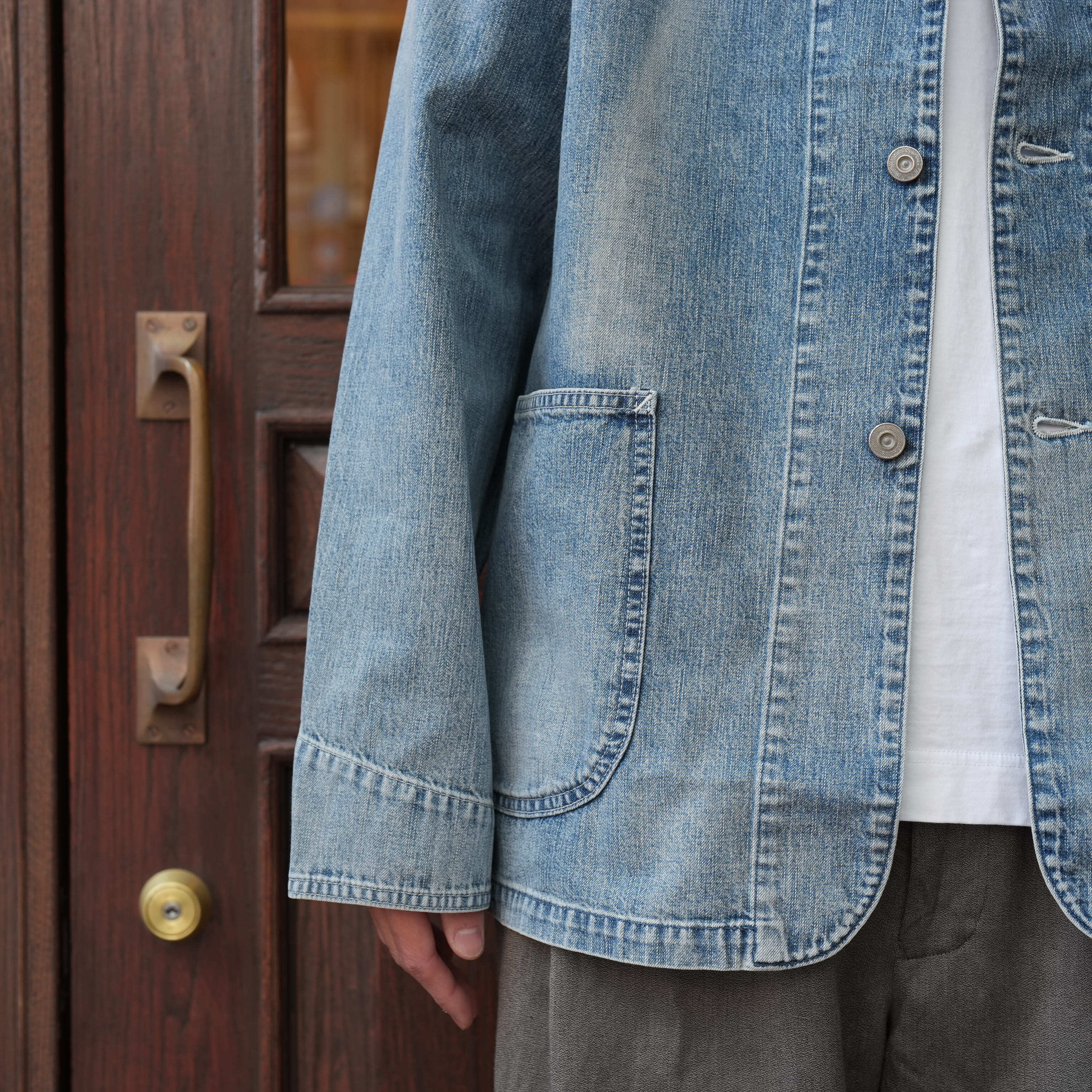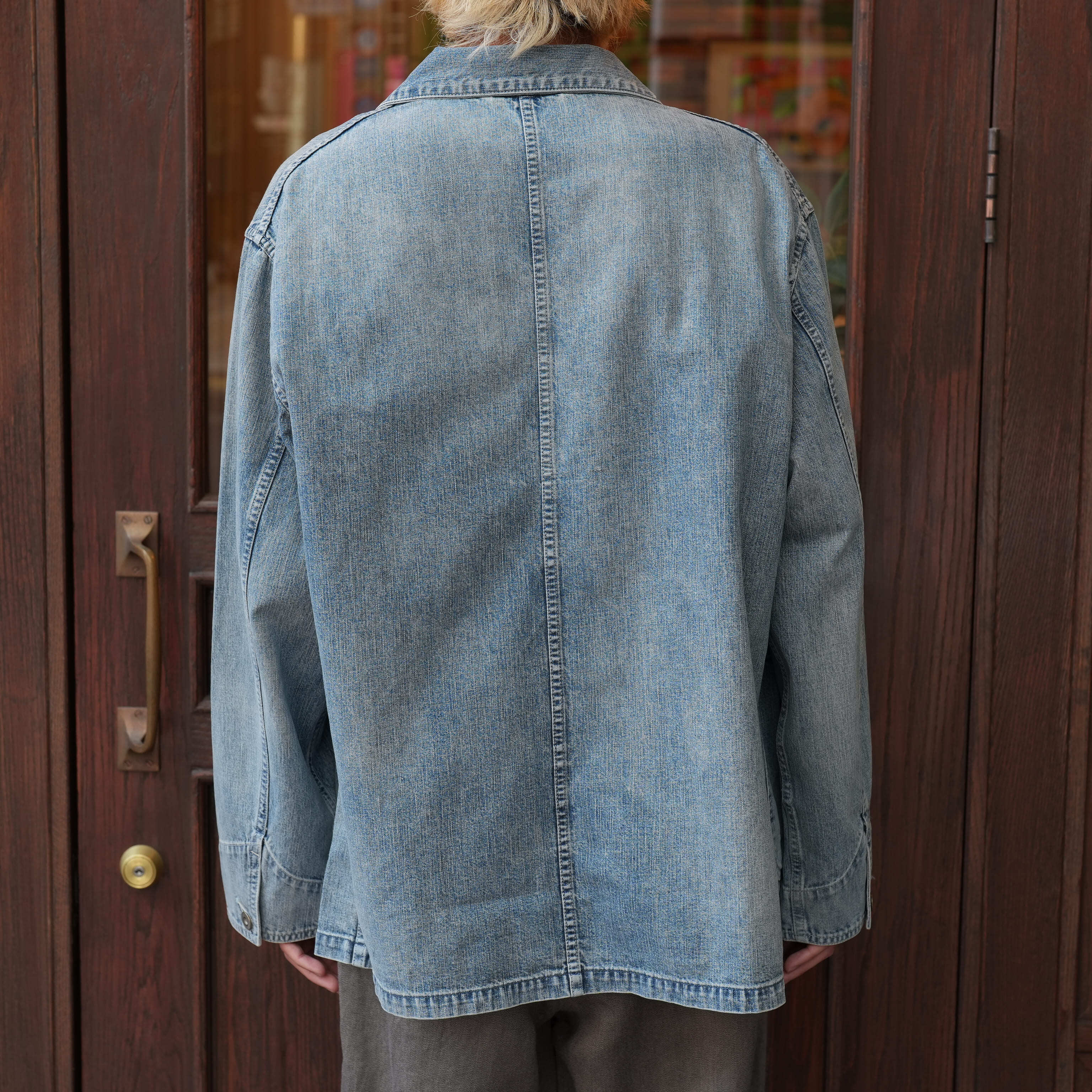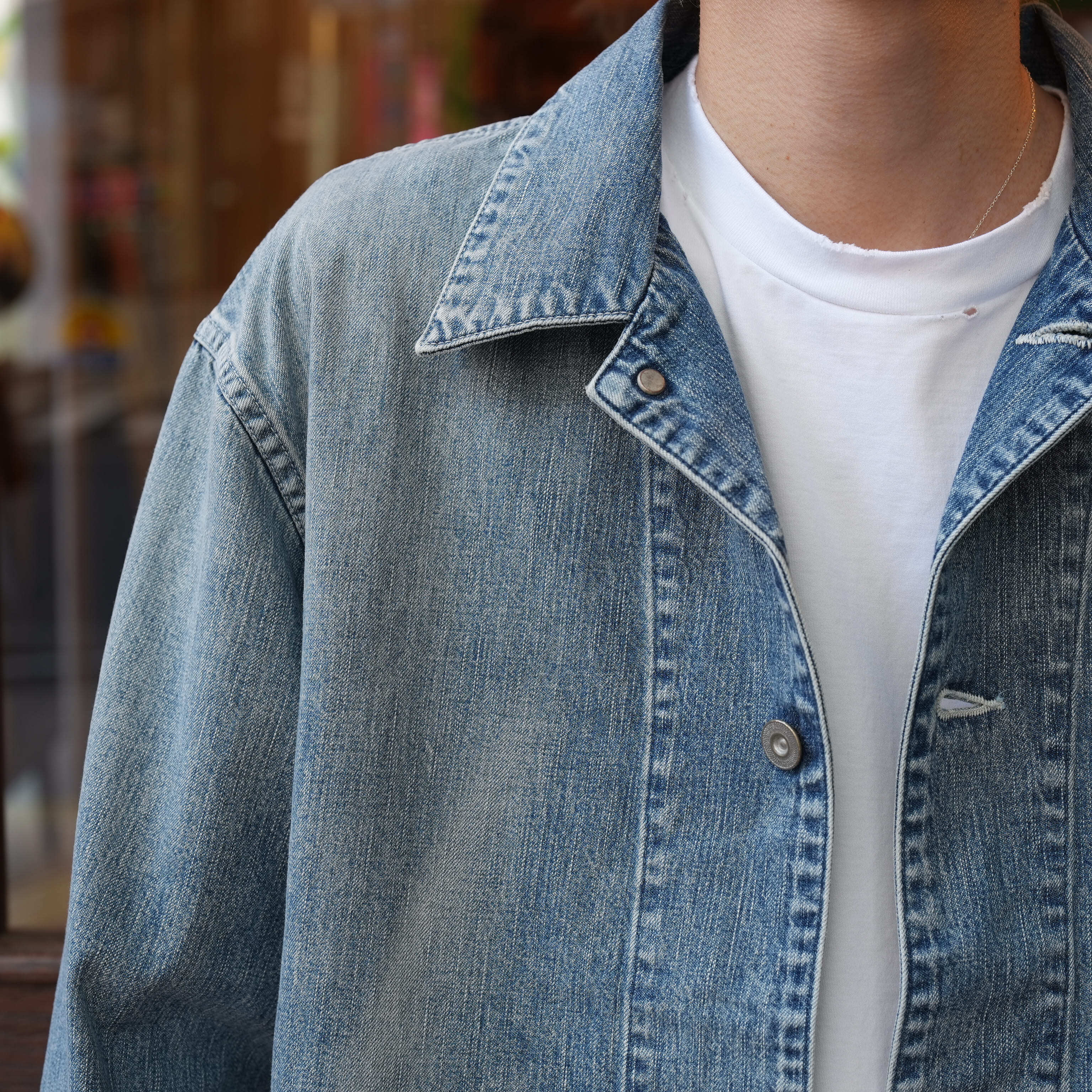 大戦期のカバーオールをベースに気負わず羽織れるパターンワークで仕上げたカバーオール。所謂ビンテージの色落ちとはまた違ったムードを目指し、手作業と洗い加工をいくつも組み合わせながら、奥行きのあるフェードや色彩の濃淡を細かく調整して仕上げています。今季はさらに全体の色落ちを強くし、アタリ感やフェード感を強く反映させてアップデートしています。