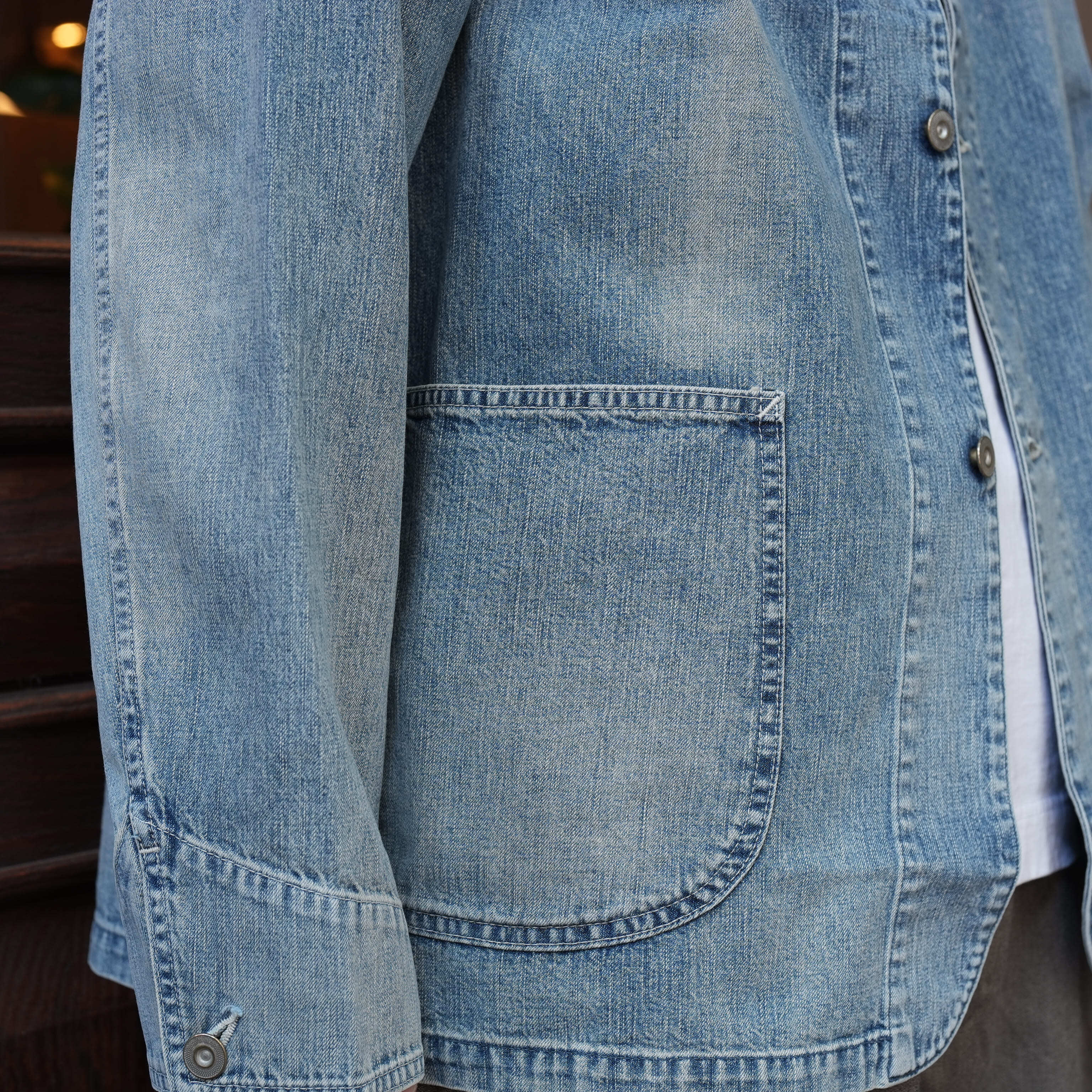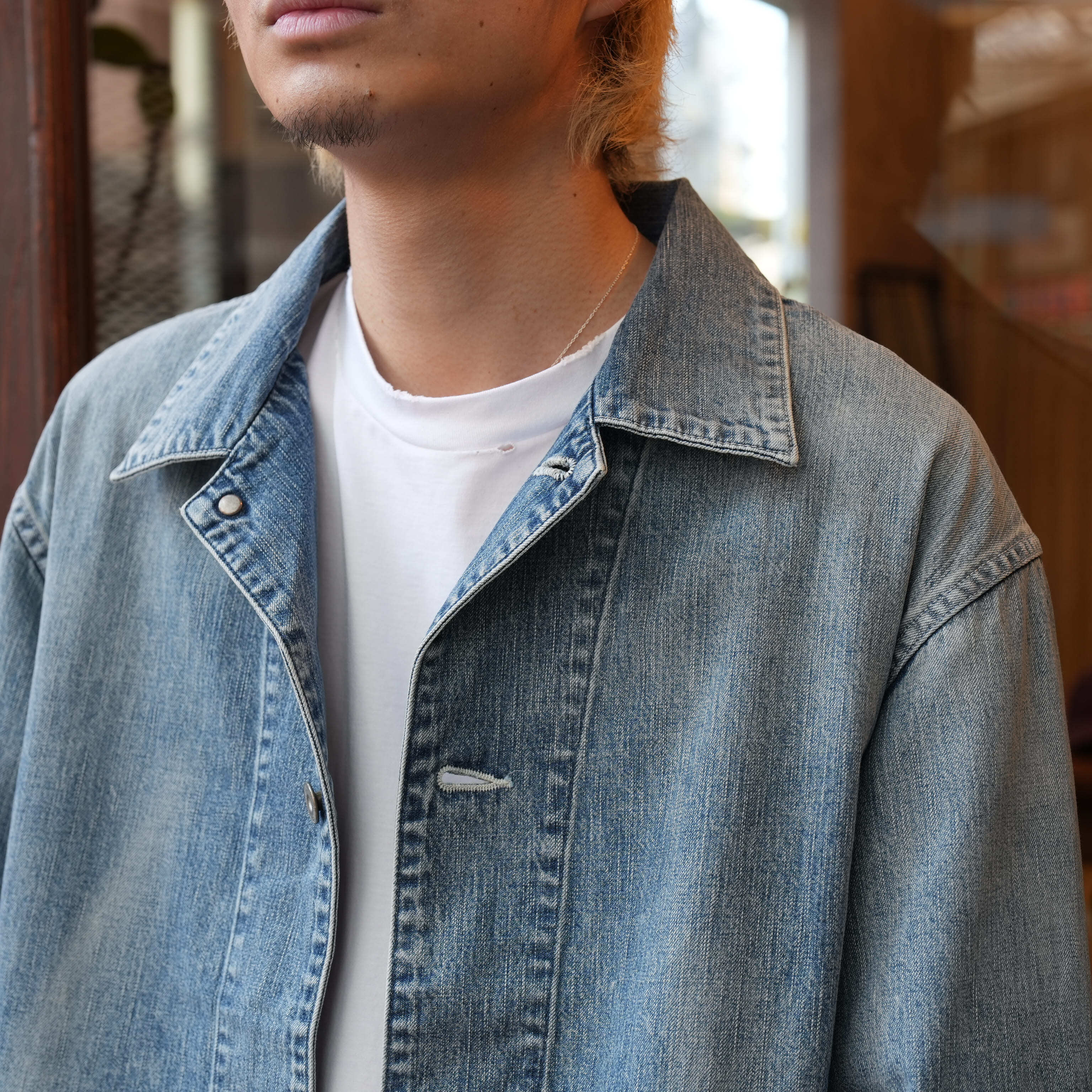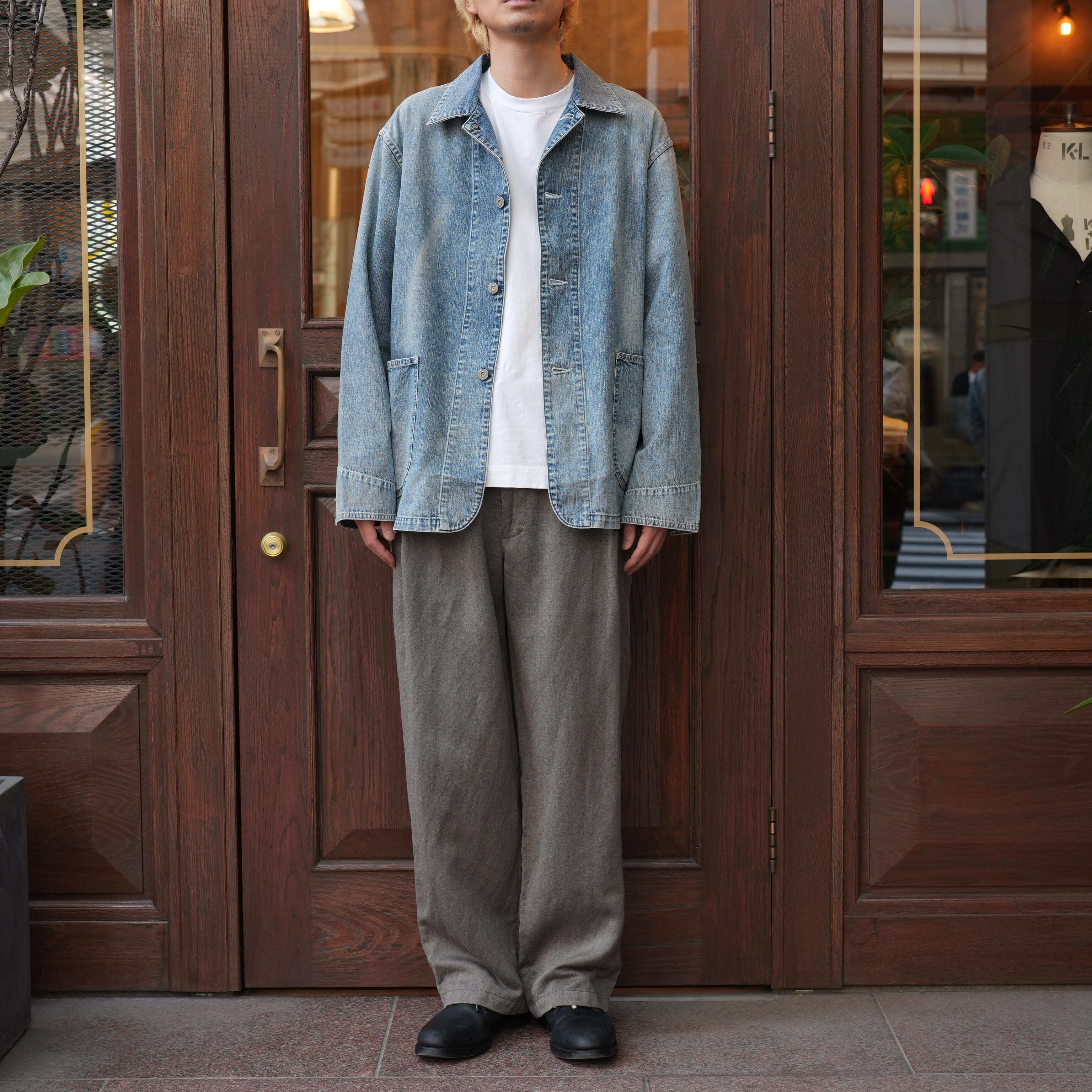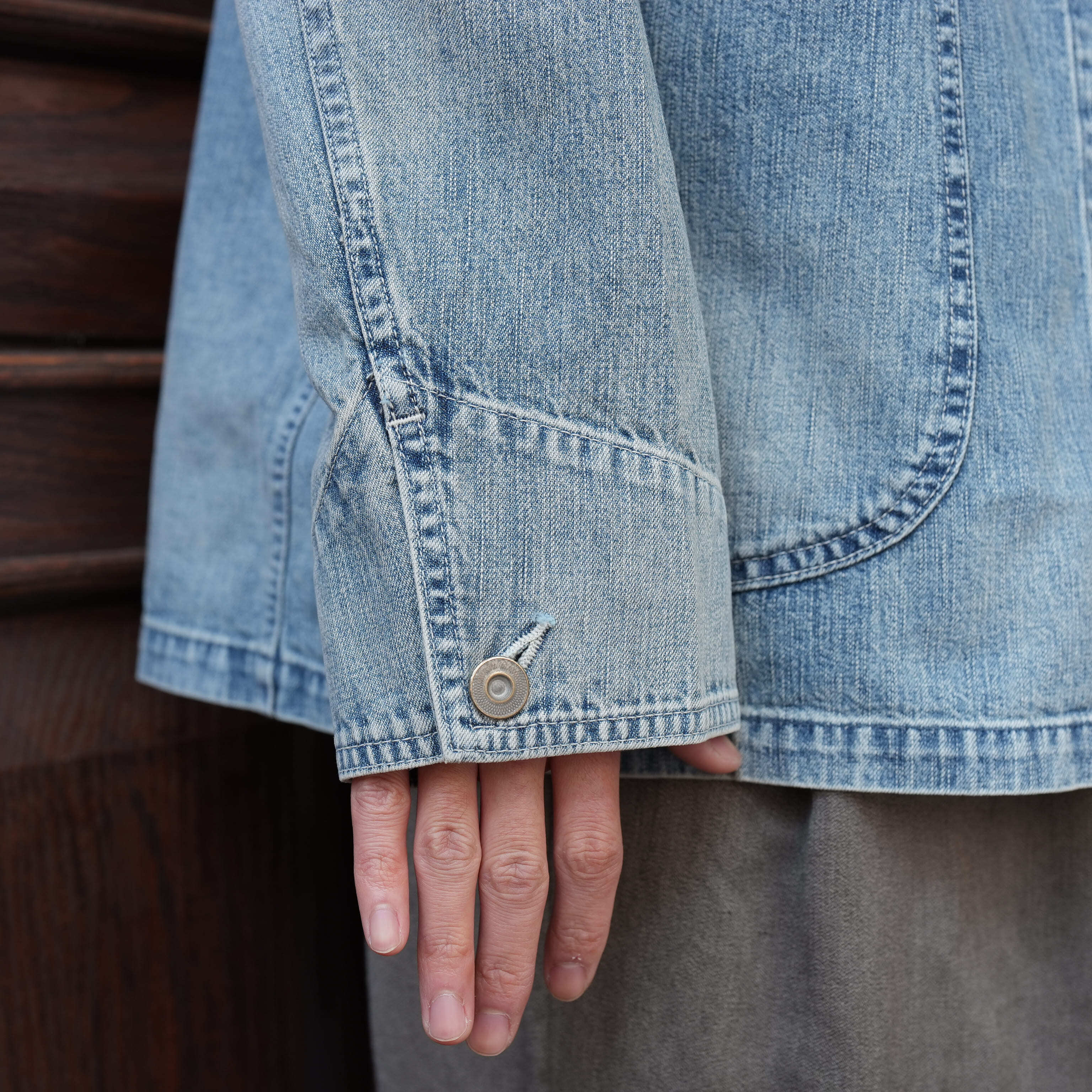 大戦期のカバーオールをベースに気負わず羽織れるパターンワークで仕上げたカバーオール。所謂ビンテージの色落ちとはまた違ったムードを目指し、手作業と洗い加工をいくつも組み合わせながら、奥行きのあるフェードや色彩の濃淡を細かく調整して仕上げています。今季はさらに全体の色落ちを強くし、アタリ感やフェード感を強く反映させてアップデートしています。
