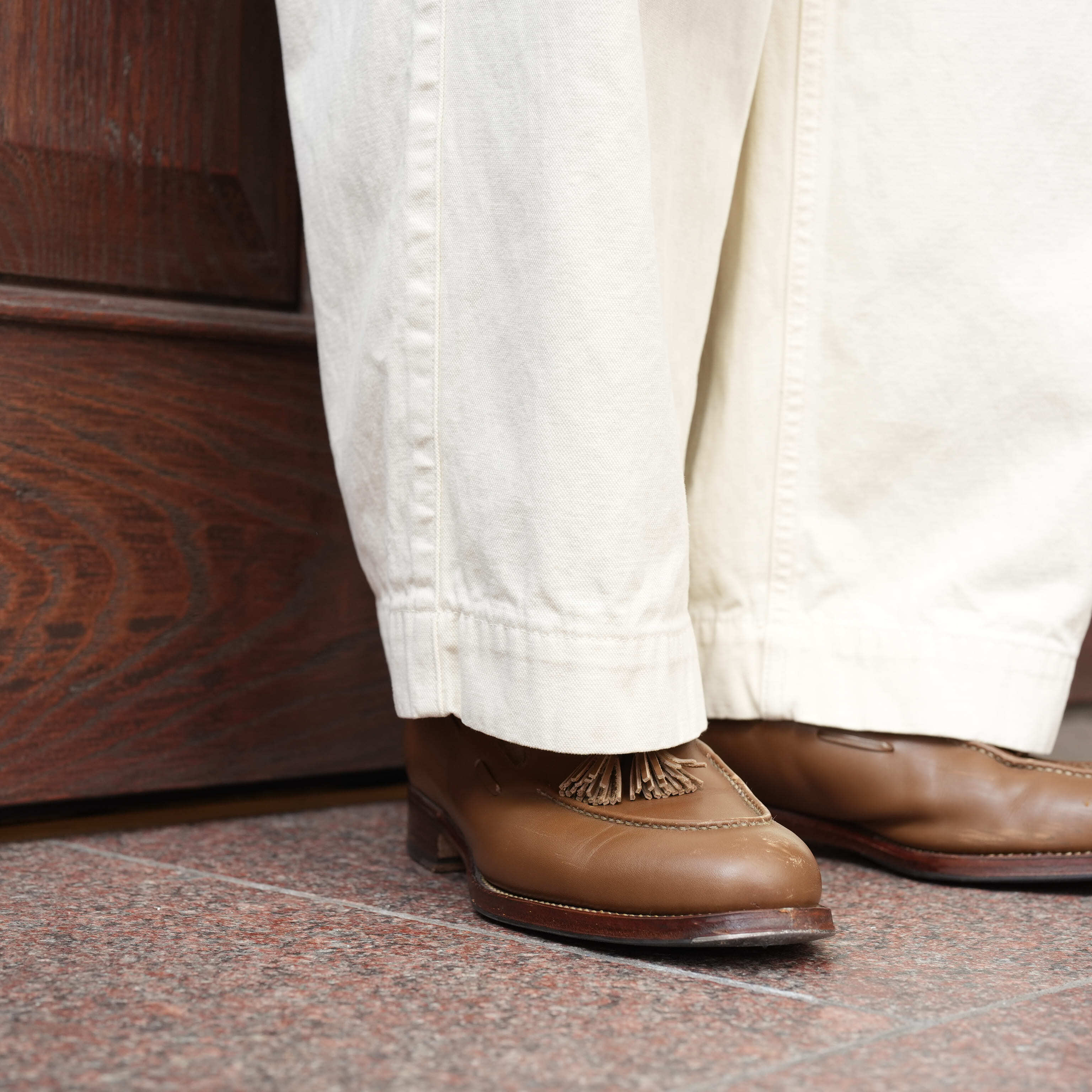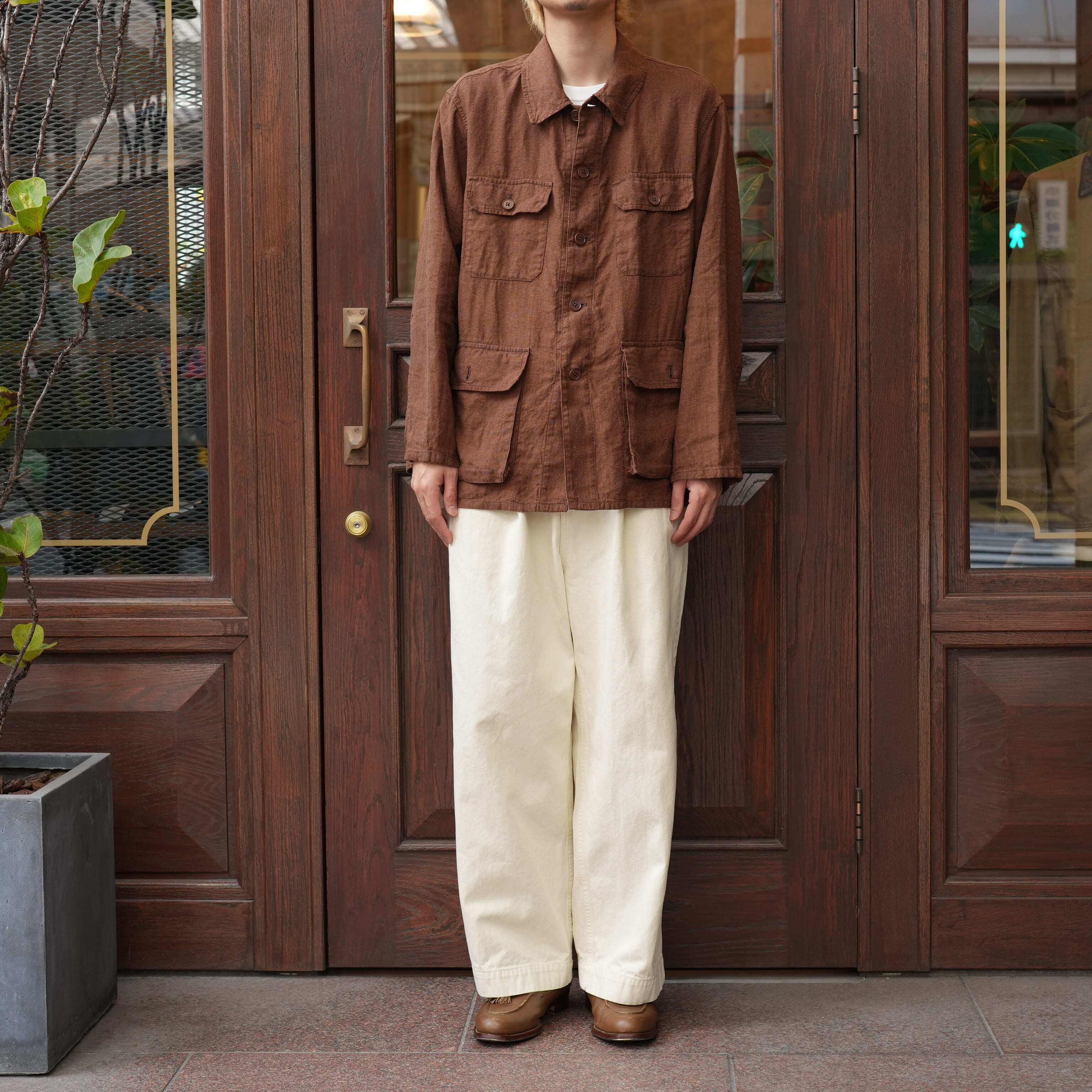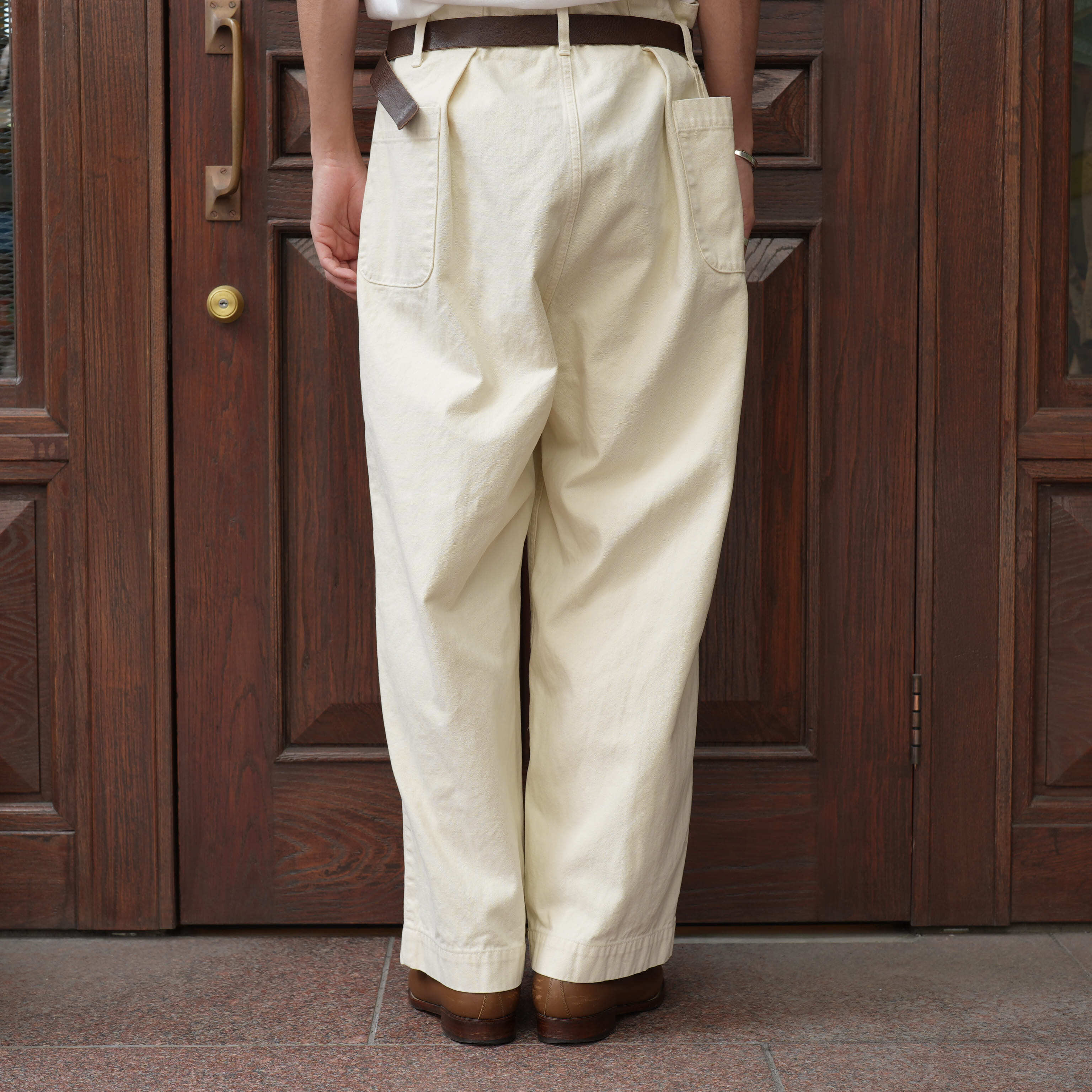 こちらはコットンヘンプで程よくハリ・コシがあり、生地の風合いが抜群に良い。アタリの出やすい雰囲気で、着用によるここからの経年変化もとにかく楽しみです。