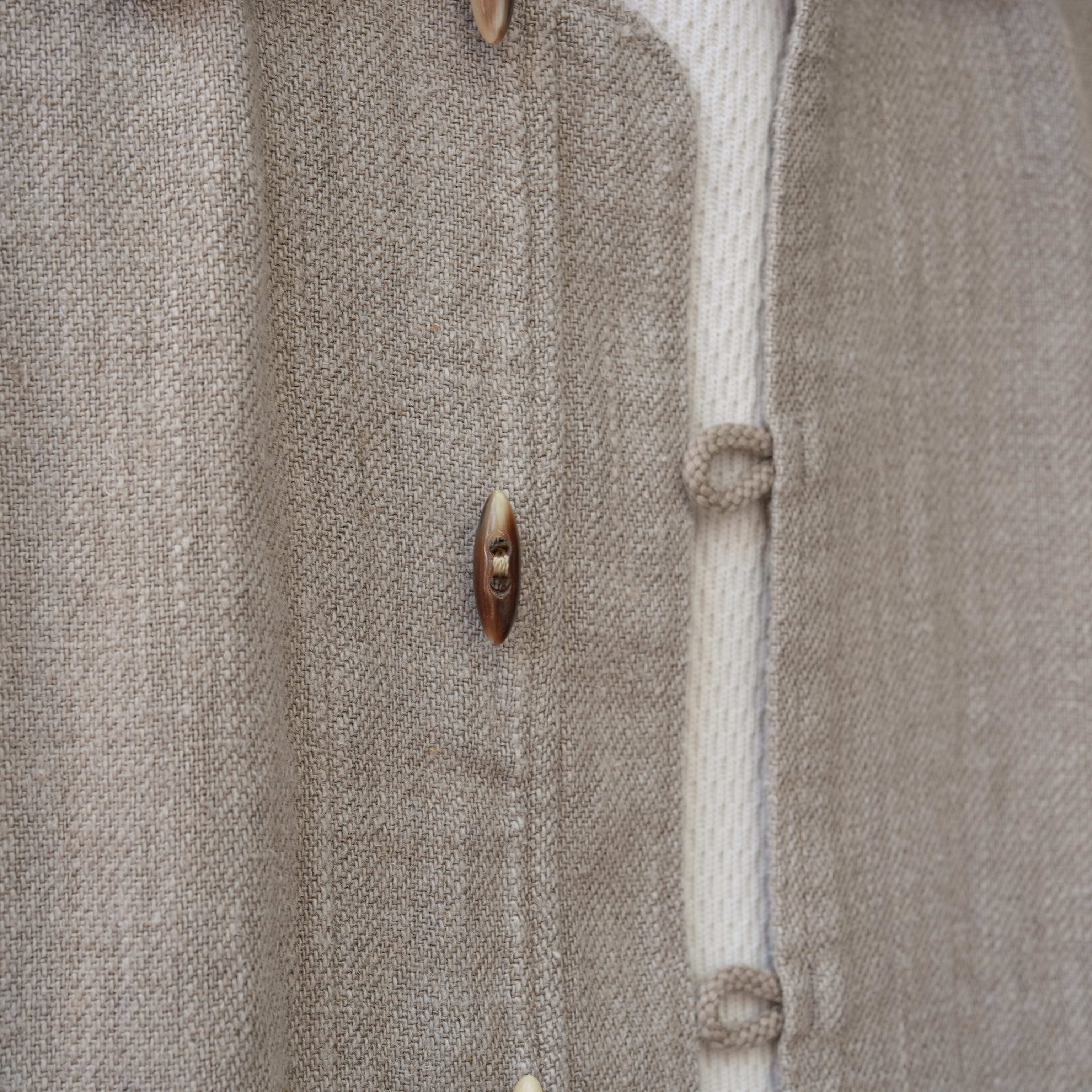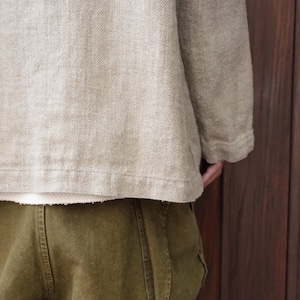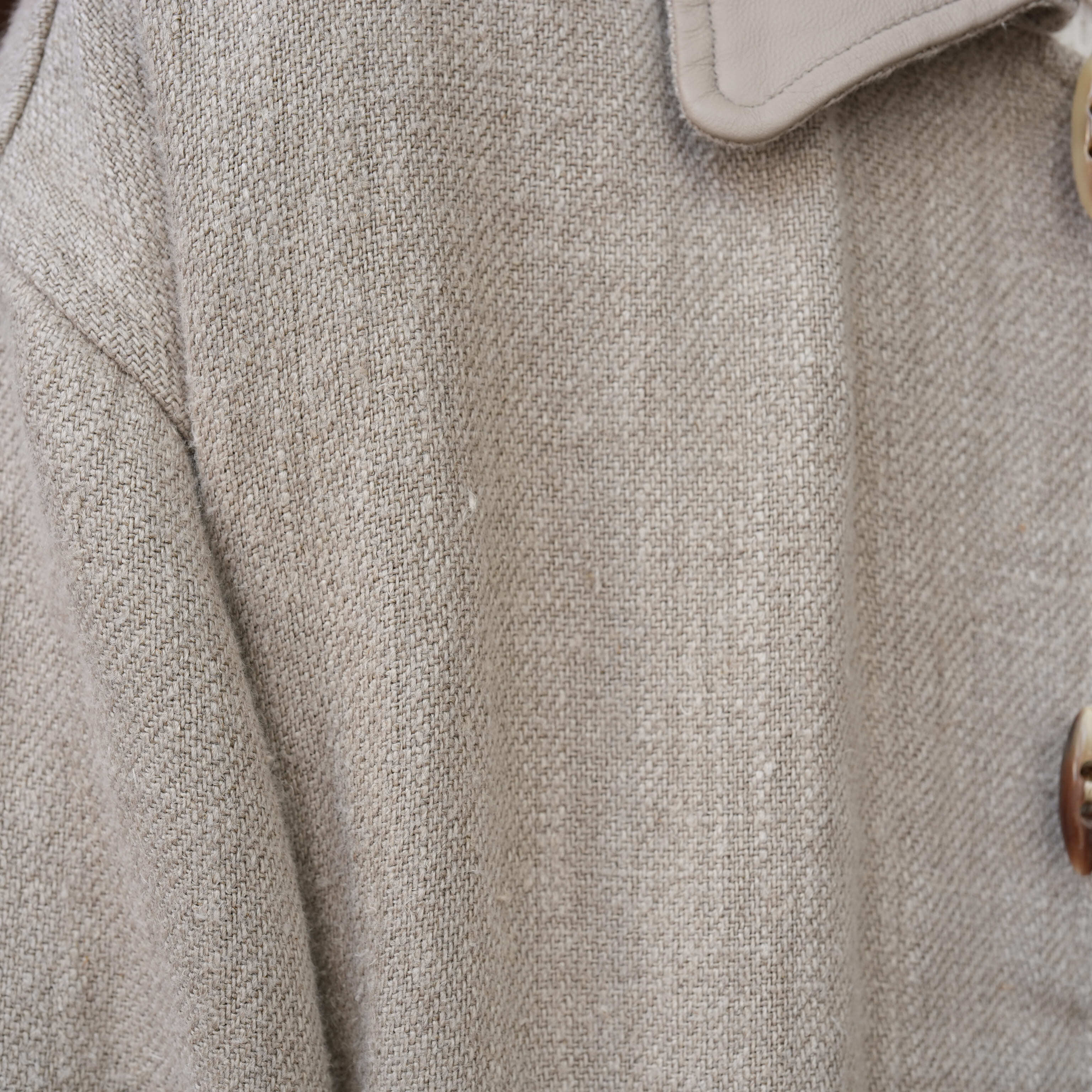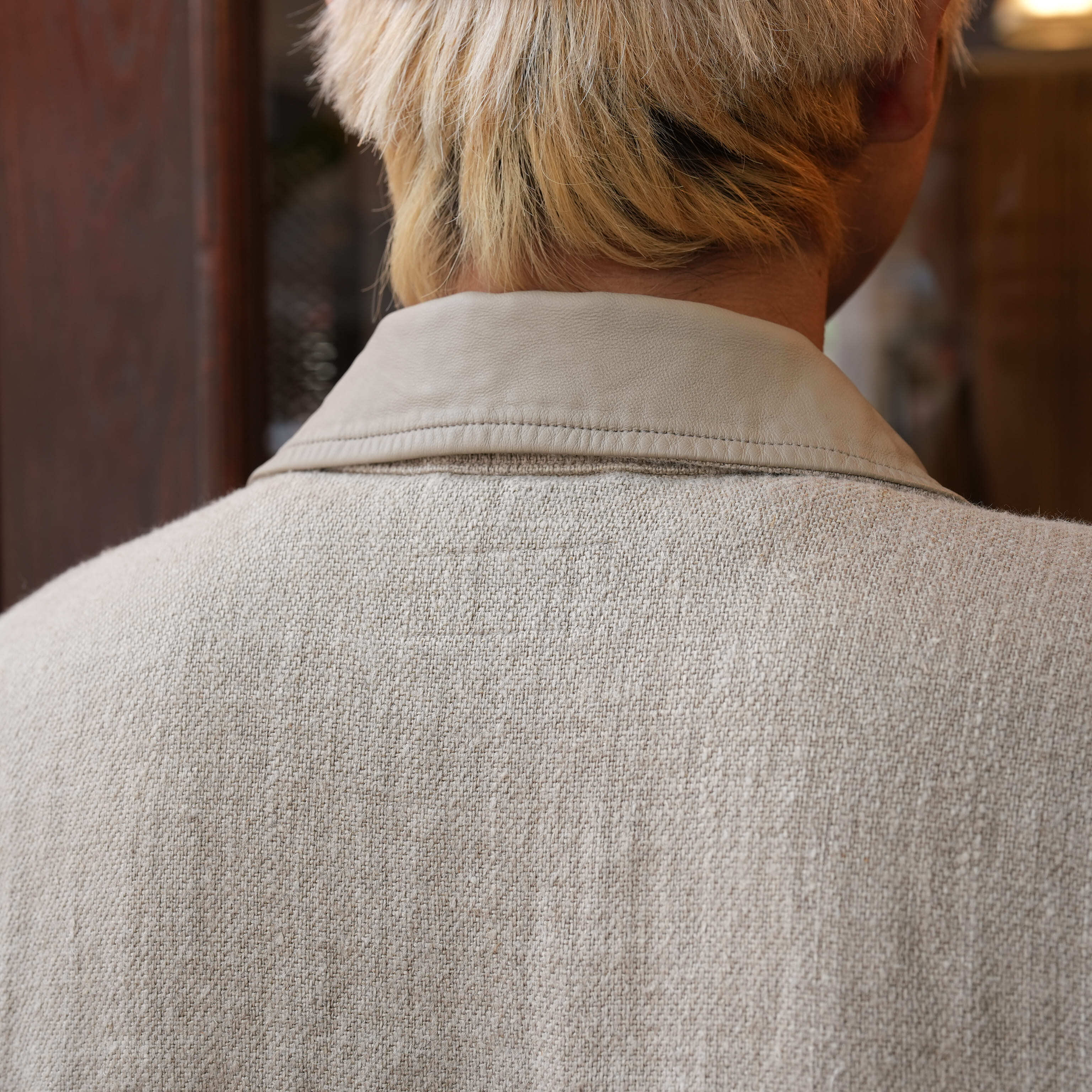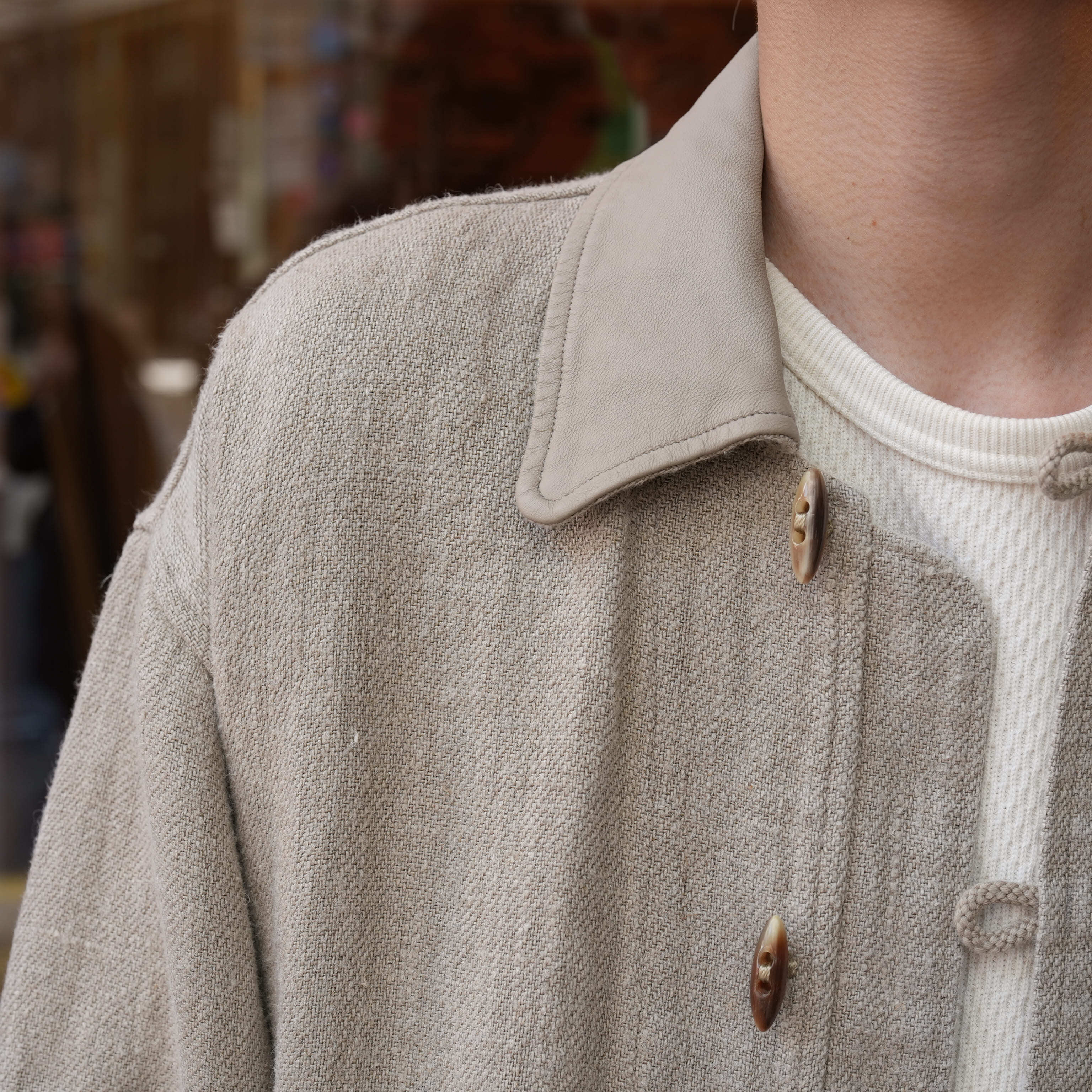 素材はリネン100で起毛感があり、程よく肉感があって非常に雰囲気があり、襟のレザーとの相性も抜群に良いです。
