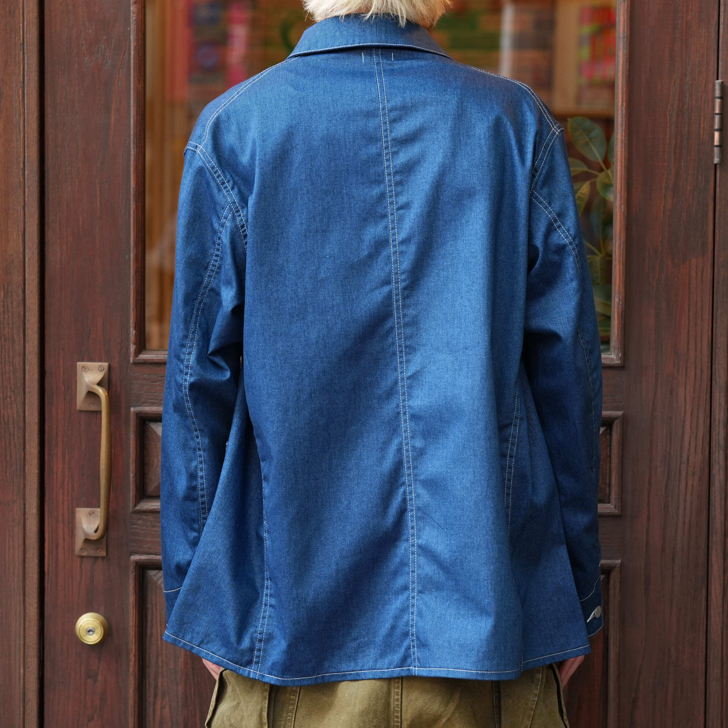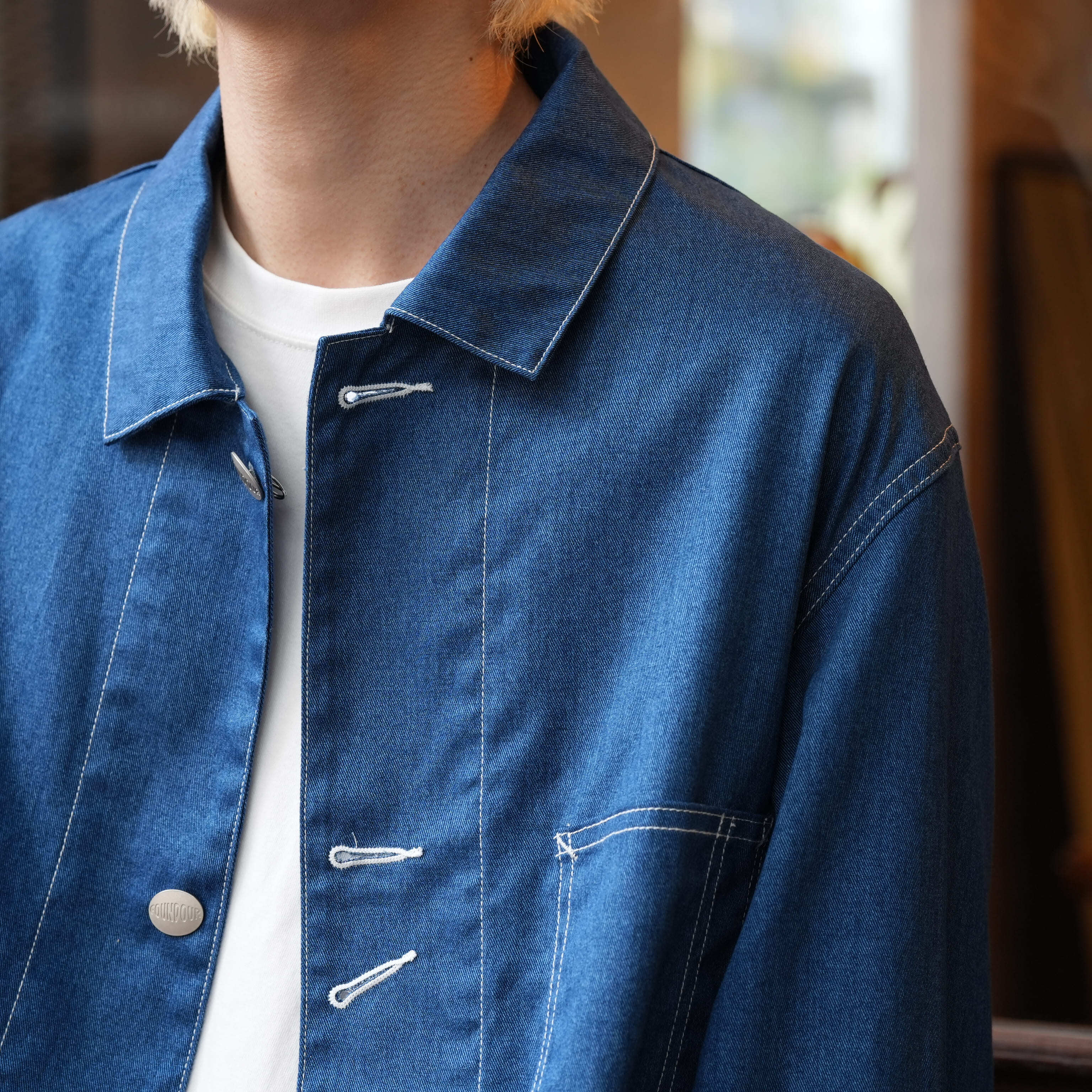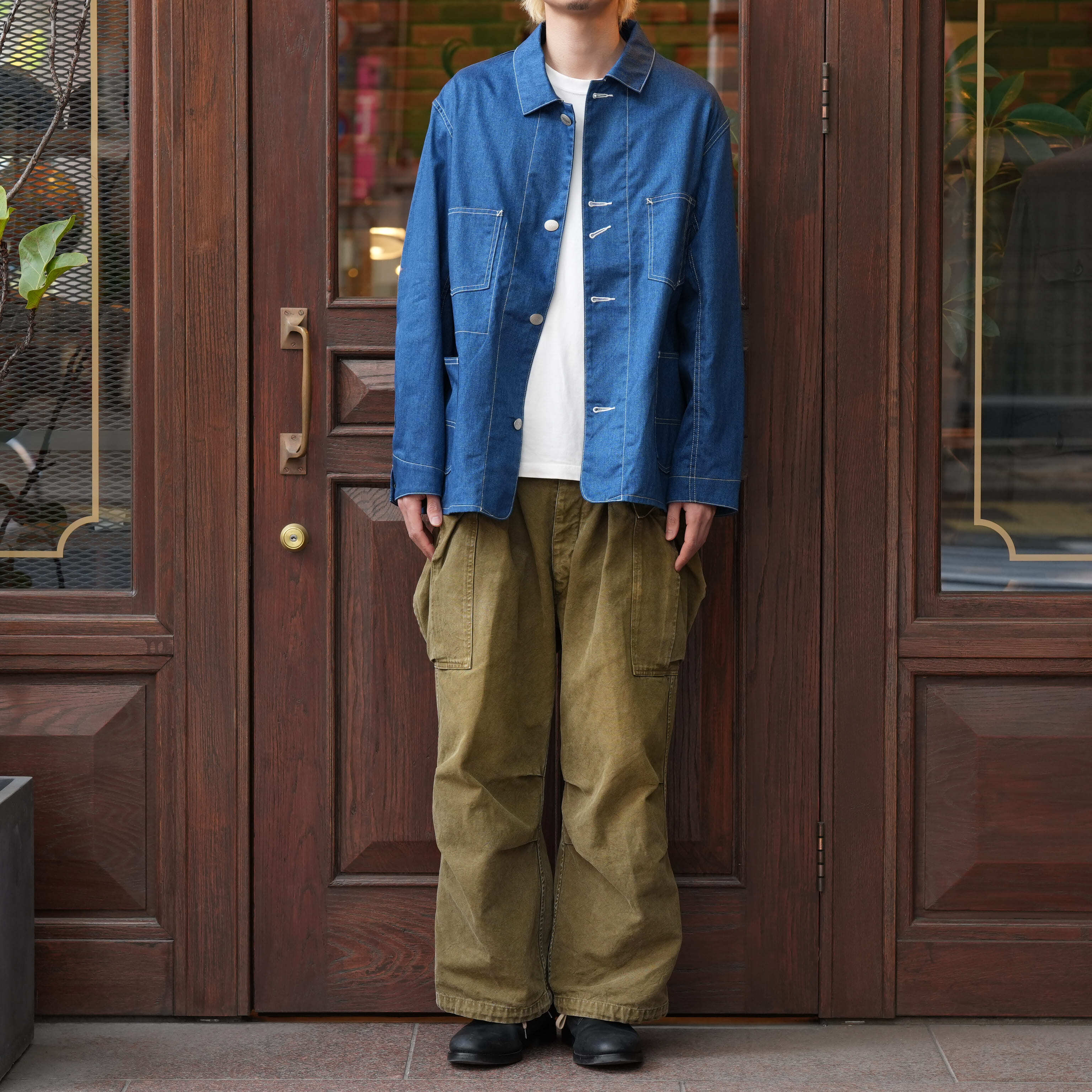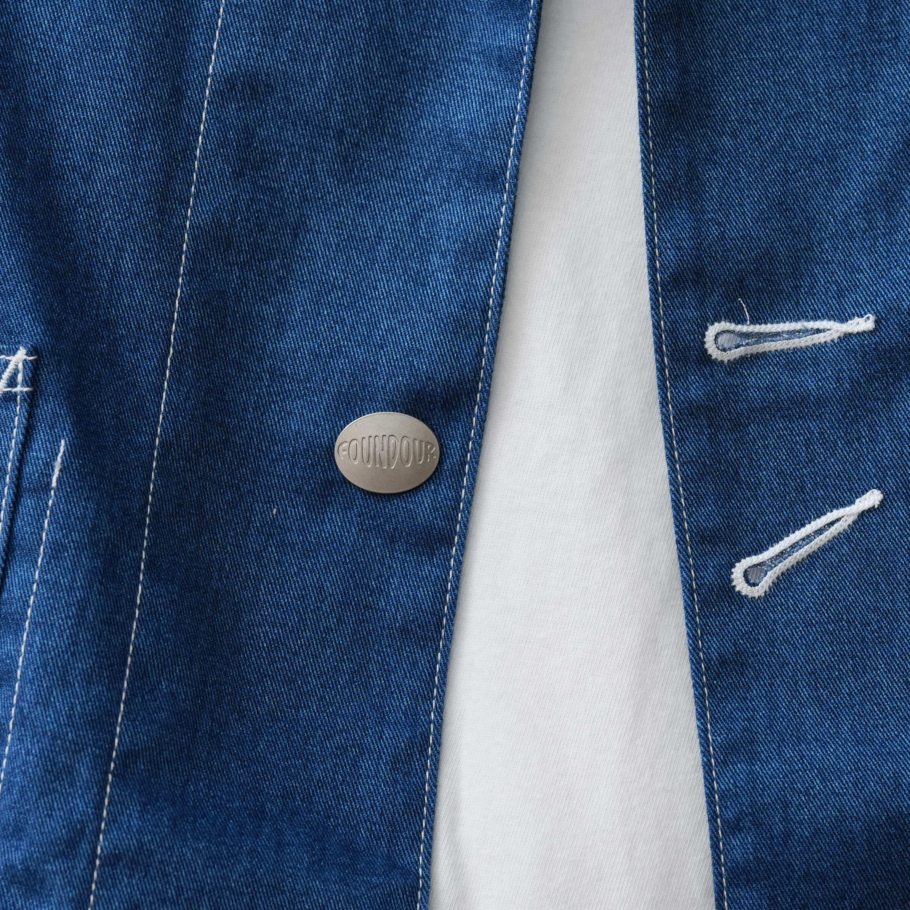 誰もが知るワークウェアブランドのカバーオール。1920年代のヴィンテージは、パタンナーが「いじるところがない」というほど完璧なフォルムでつくられていました。実際に着てみると、その言葉が腑に落ちます。肩線がやや後ろに入ることによって、充分な可動域が確保され、脇線は後ろ身頃の内側に向かうことで、前の開きがきれいになっています。さらに袖は前振りに付けることによって、流麗なラインを描きます。これはテーラードと同じ手法。ワークウェアとしての動きやすさをキープしながら、きちんと美しさも感じられるシルエットに整えられている。そんなアイテムを、あえてデニム地が転写プリントされた生地で仕立てました。本物のものづくりはぼくらの役割ではなく、どれだけおもしろくハズせるかが腕の見せどころ。本来はハート型だったチェンジボタンも<FOUNDOUR>のオリジナルに変え、とびきり真面目でユニークな服にアレンジしています。