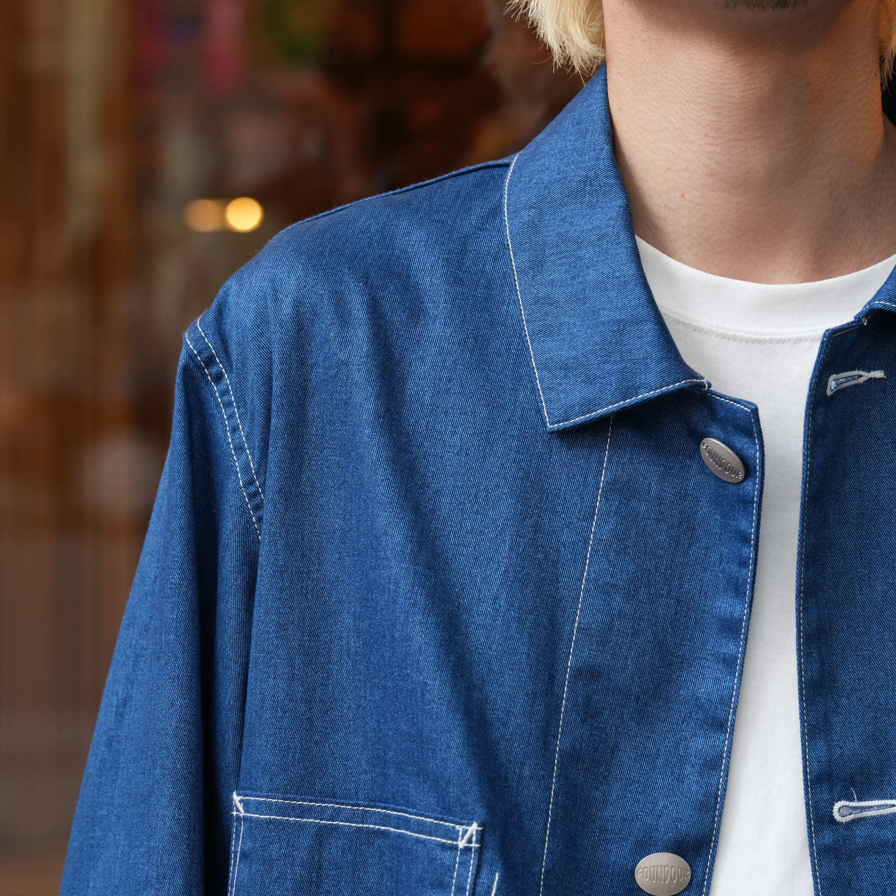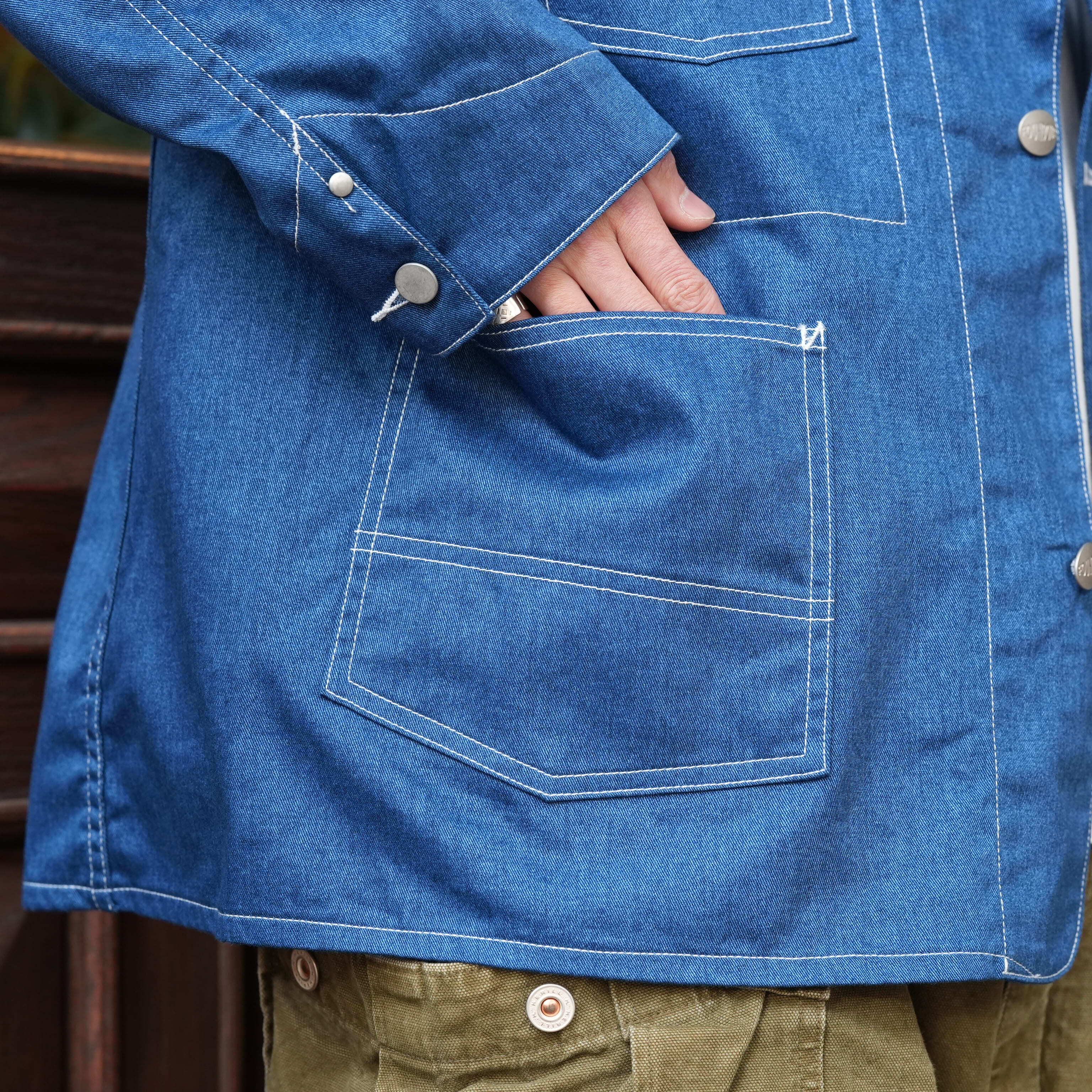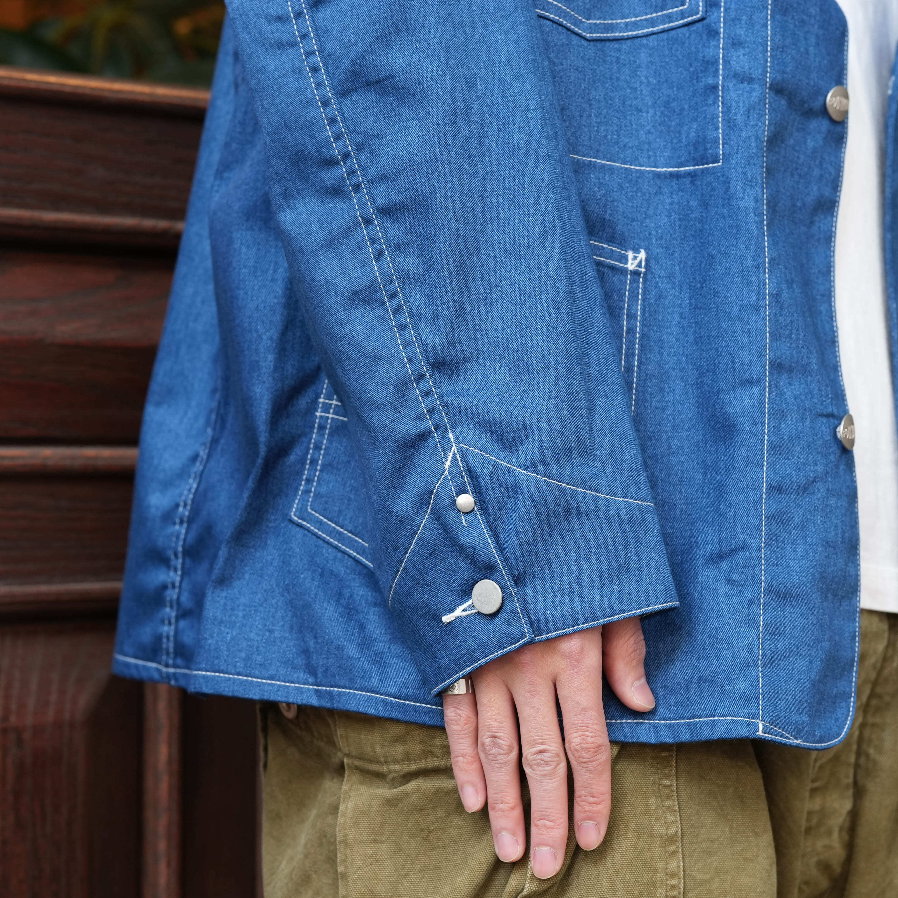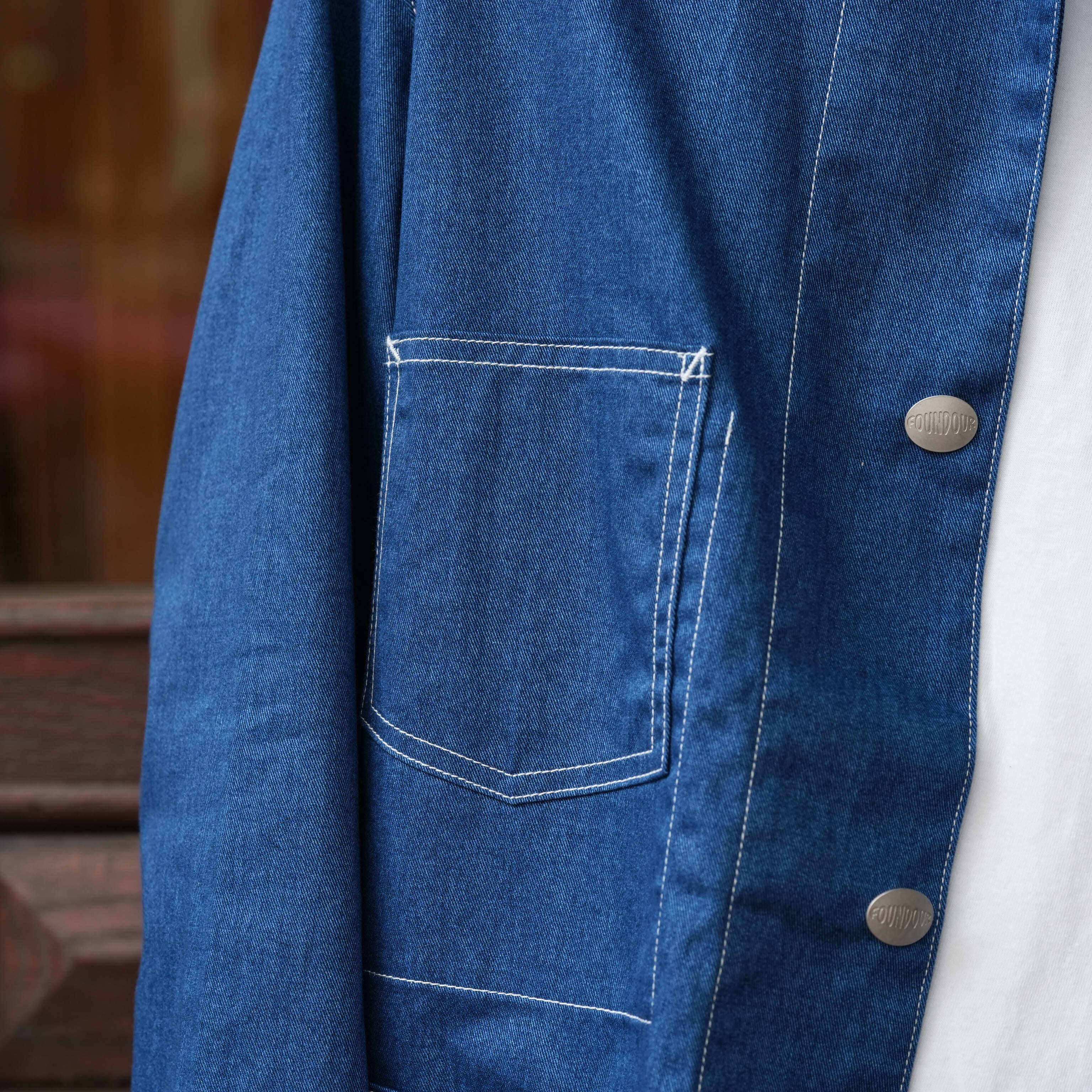 誰もが知るワークウェアブランドのカバーオール。1920年代のヴィンテージは、パタンナーが「いじるところがない」というほど完璧なフォルムでつくられていました。実際に着てみると、その言葉が腑に落ちます。肩線がやや後ろに入ることによって、充分な可動域が確保され、脇線は後ろ身頃の内側に向かうことで、前の開きがきれいになっています。さらに袖は前振りに付けることによって、流麗なラインを描きます。これはテーラードと同じ手法。ワークウェアとしての動きやすさをキープしながら、きちんと美しさも感じられるシルエットに整えられている。そんなアイテムを、あえてデニム地が転写プリントされた生地で仕立てました。本物のものづくりはぼくらの役割ではなく、どれだけおもしろくハズせるかが腕の見せどころ。本来はハート型だったチェンジボタンも<FOUNDOUR>のオリジナルに変え、とびきり真面目でユニークな服にアレンジしています。