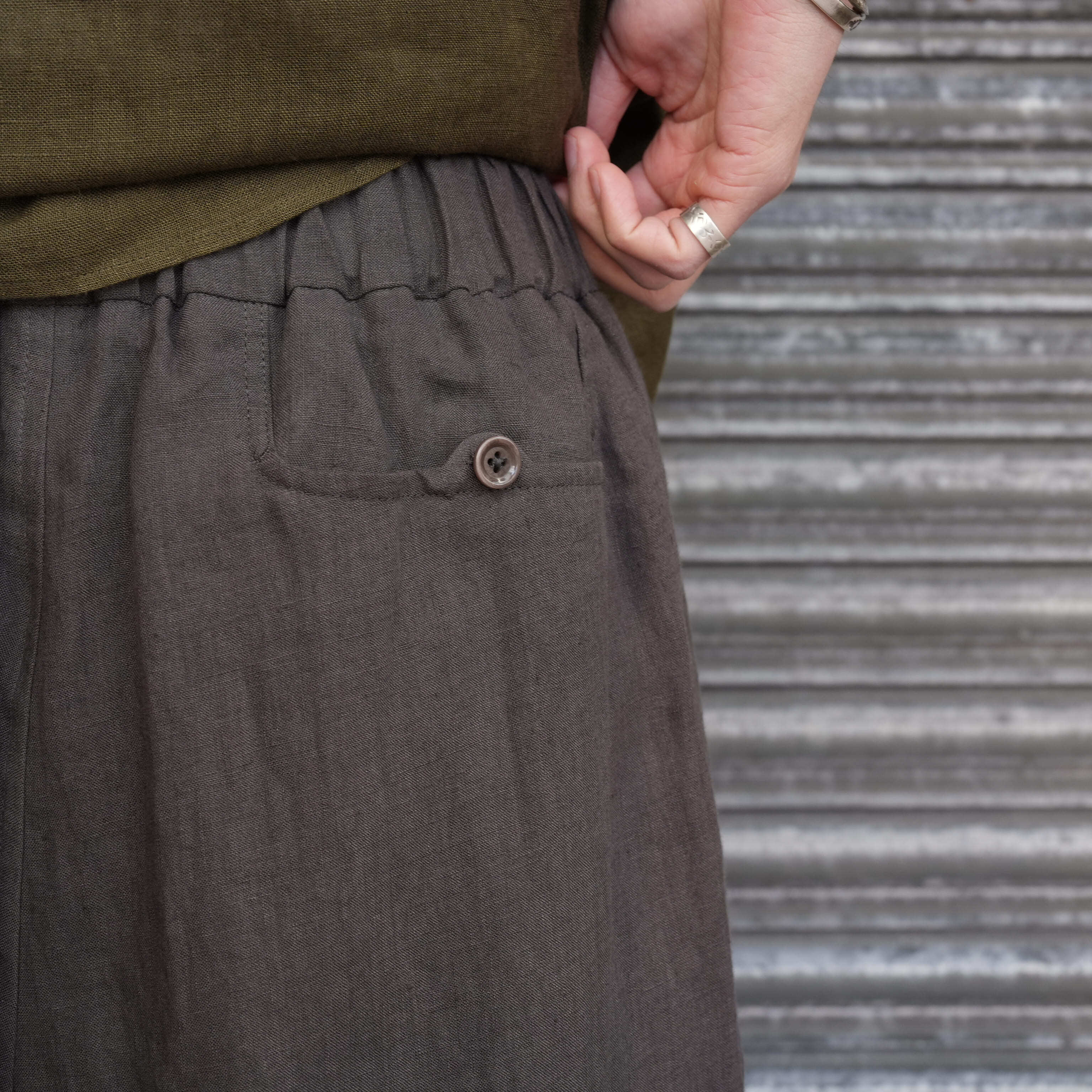 ヨーロッパ原産のリネンを使用しておられた生地。生地を少ない数量で長時間揉み練り、染め下晒が作られます。この下晒加工によって糸が解撚され、生地が最もリラックスすることで、自然の表面効果と膨らみ感が出ます。染色も1回の染ロットを少量にして長時間かけて行われます。染色後生地を練りながら水洗いし再度エアーで生地をもみ込んで芯からほぐすことでソフト感、膨らみ感が強調され生地本来の特性を最も自然に表現している加工を施しています。