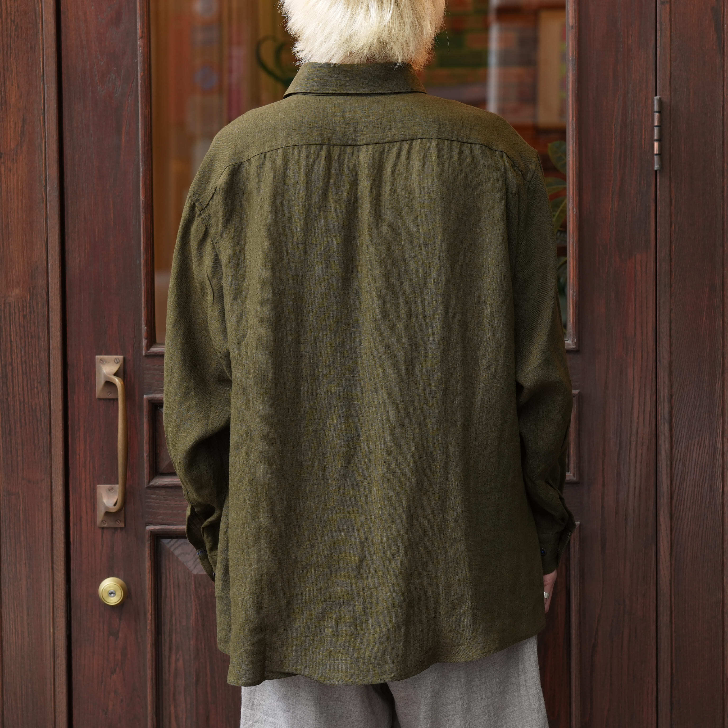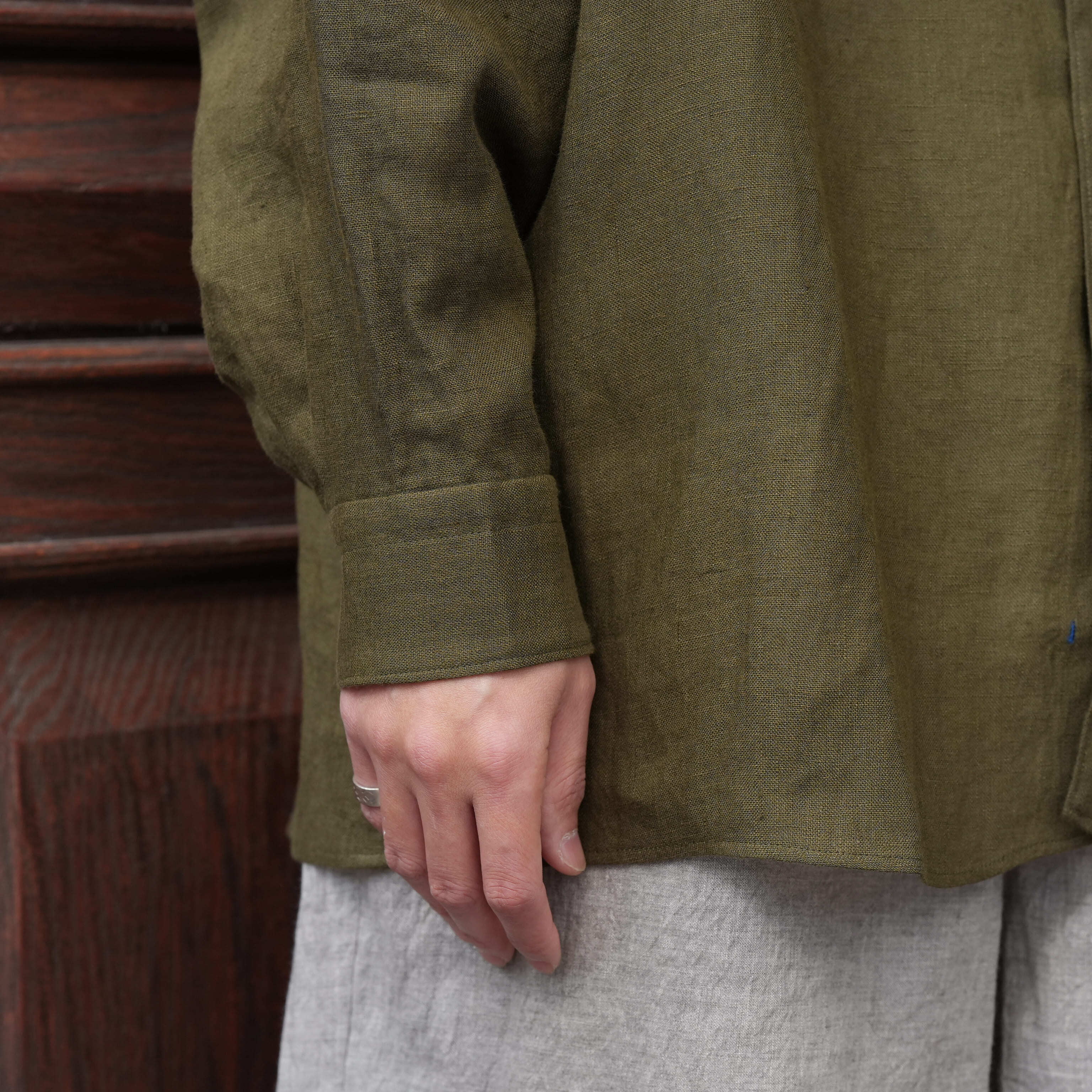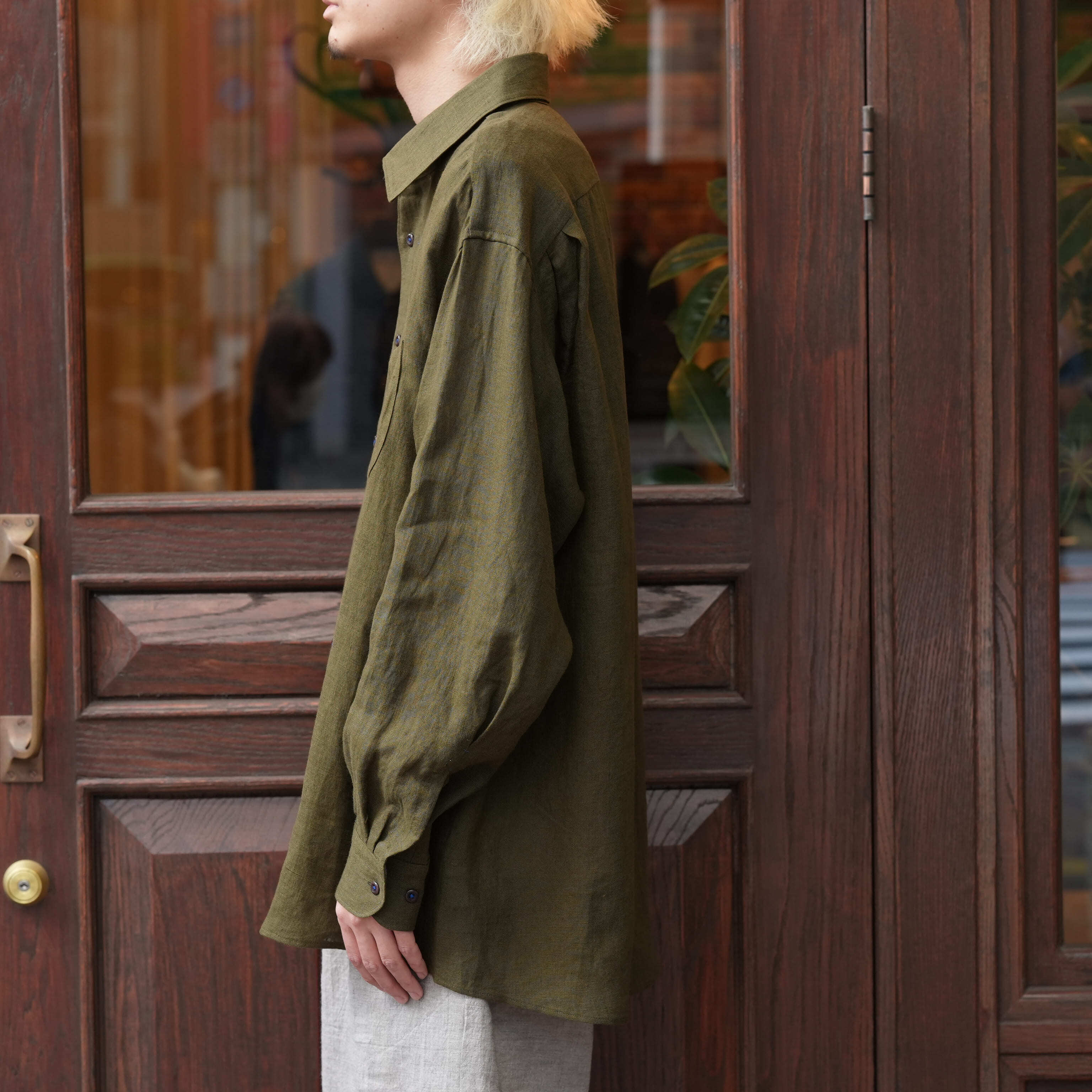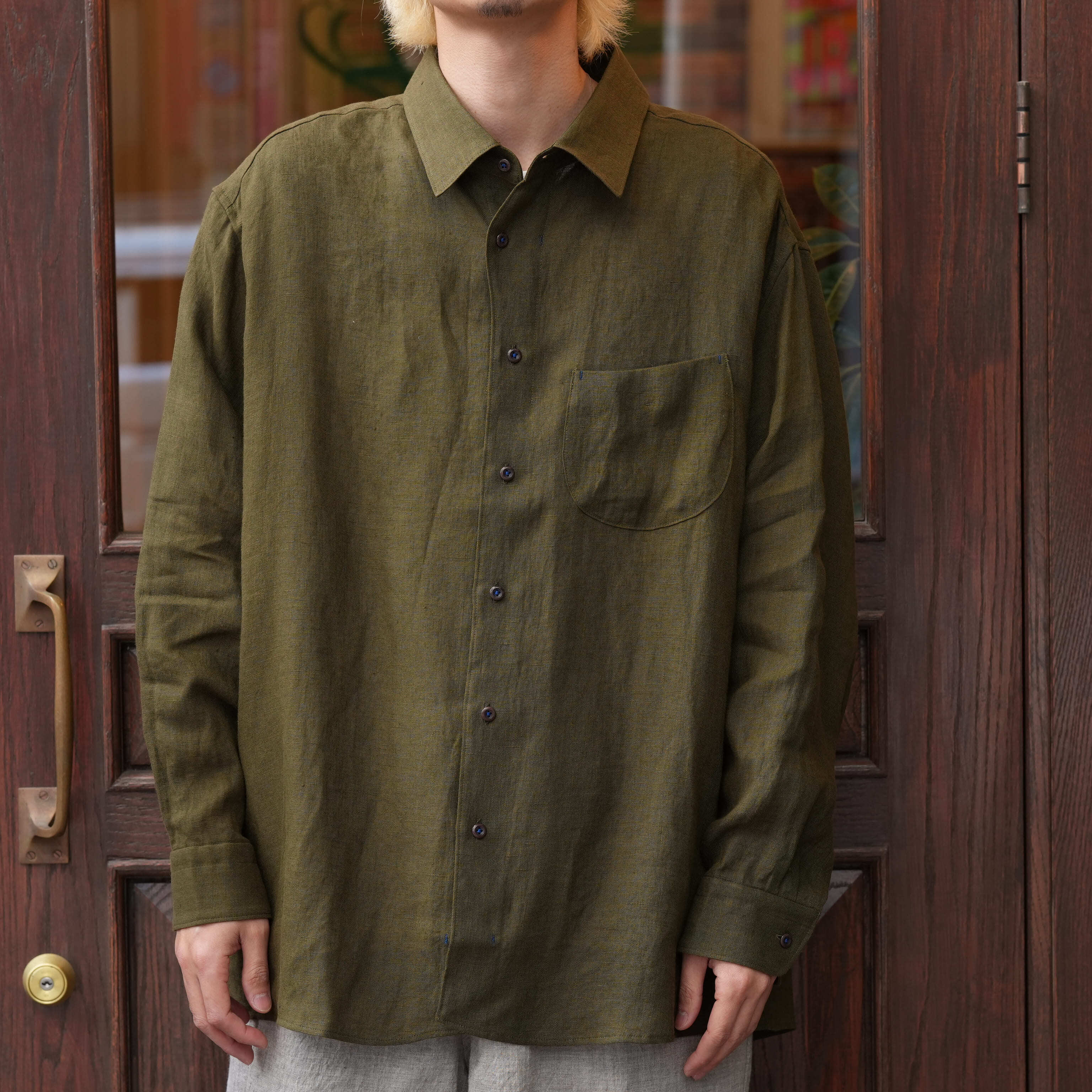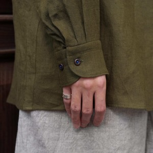 Gorsch the merry coachman(ゴーシュザメリーコーチマン) 26SS "French Linen Wide Silhouette Collar Shirt" -Khaki Green-