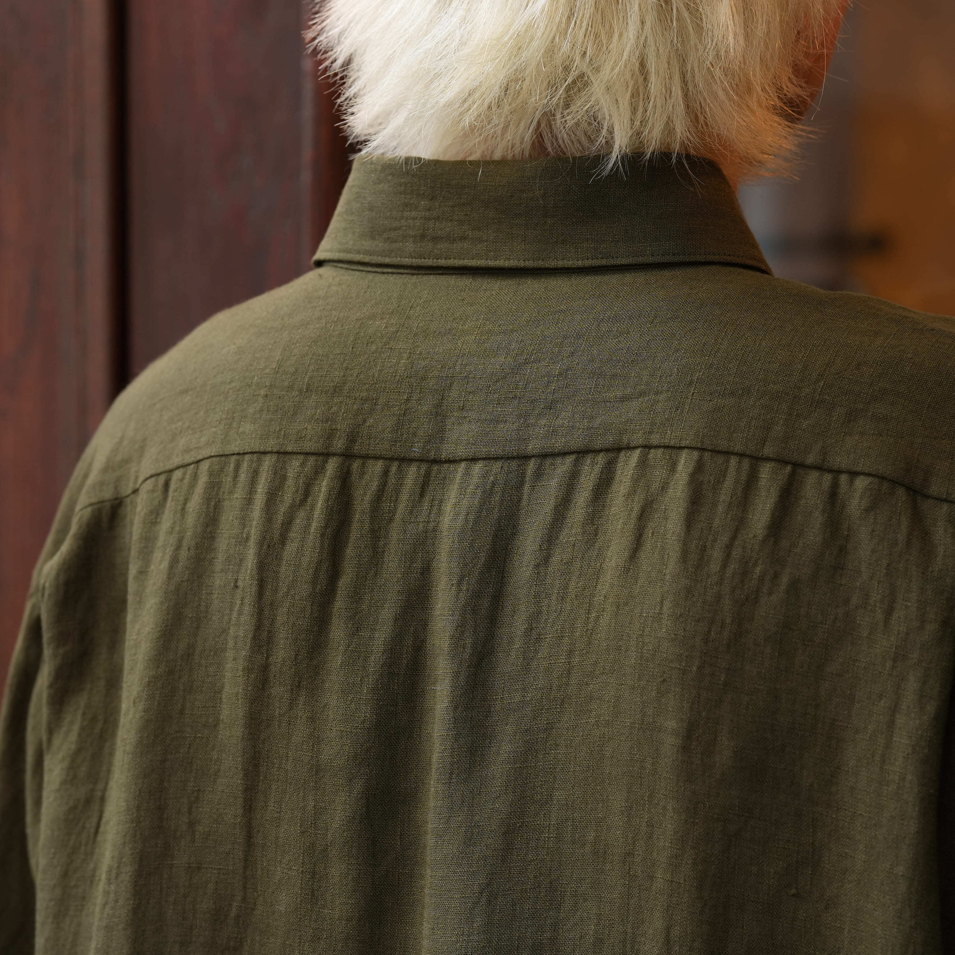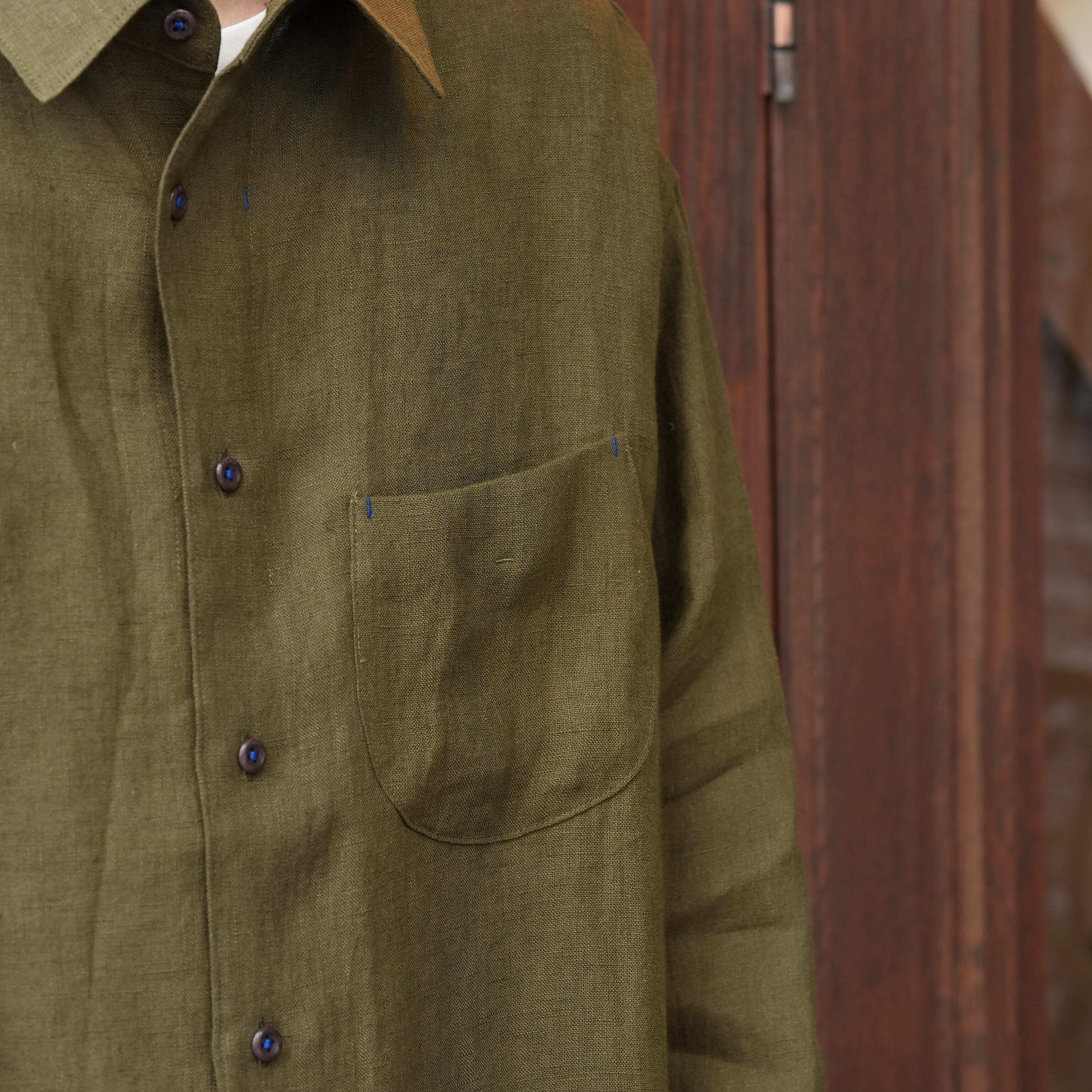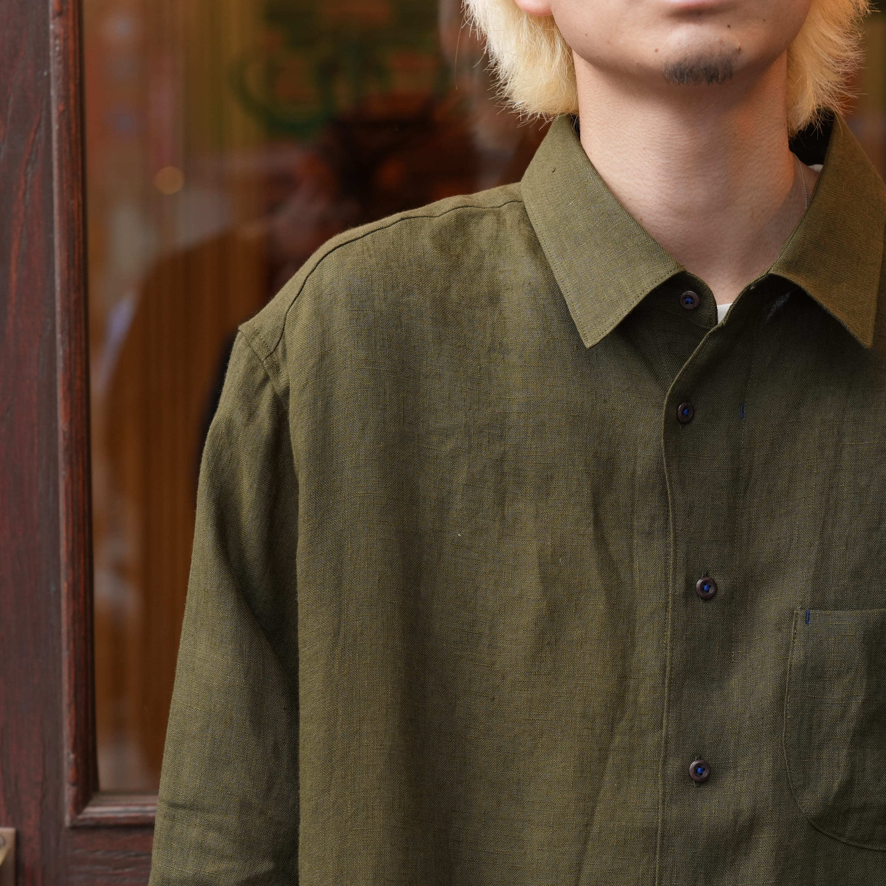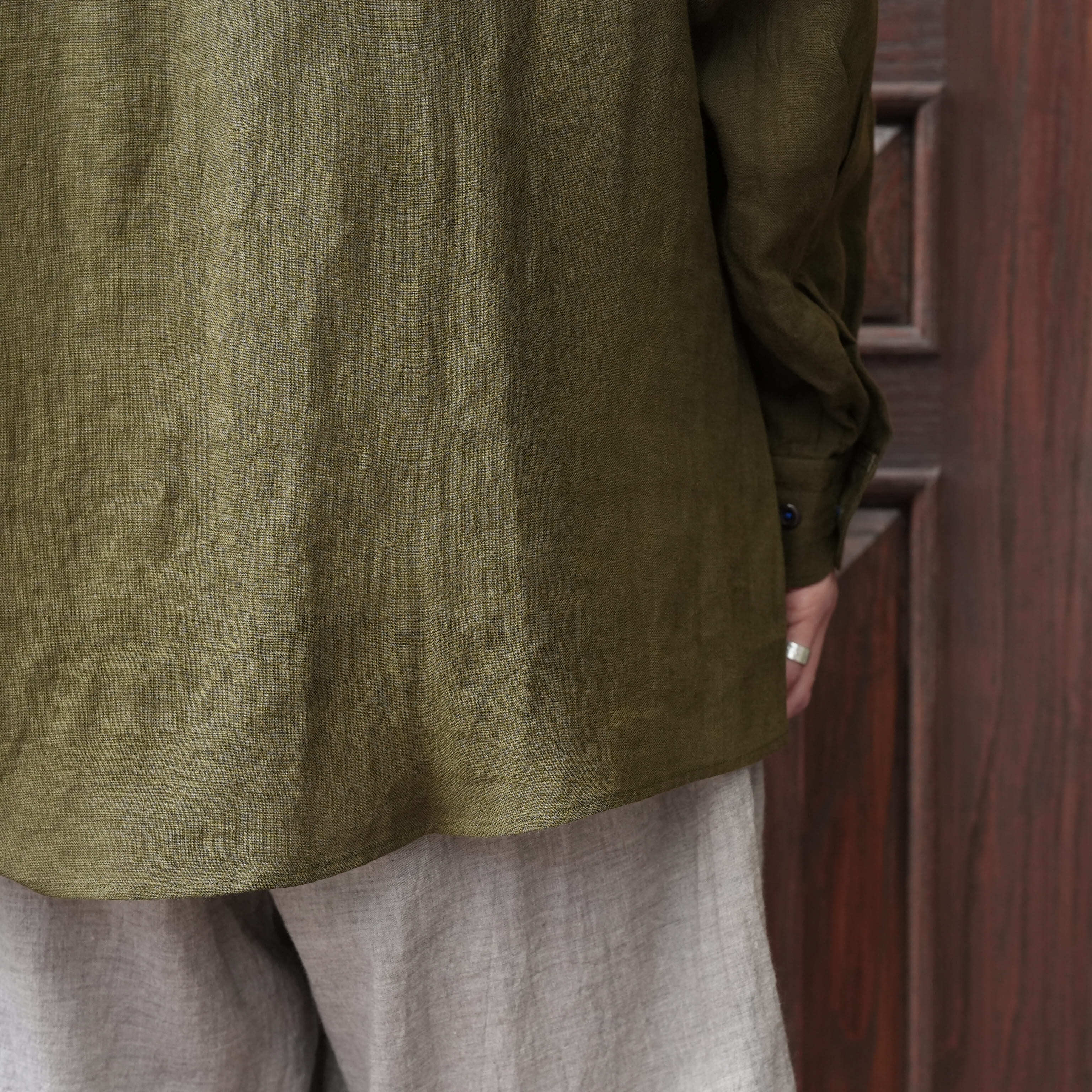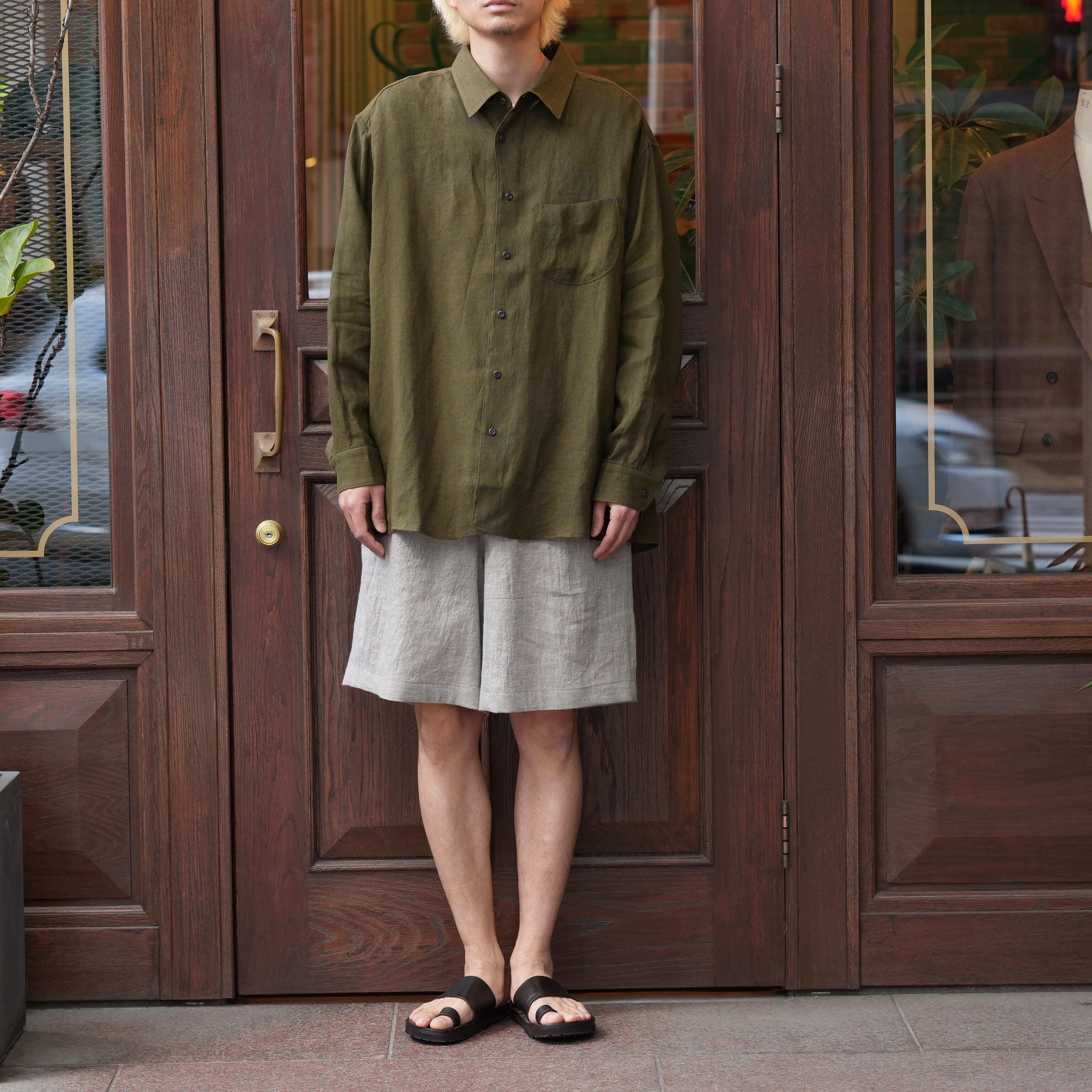 Gorsch the merry coachman(ゴーシュザメリーコーチマン) 26SS "French Linen Wide Silhouette Collar Shirt" -Khaki Green-