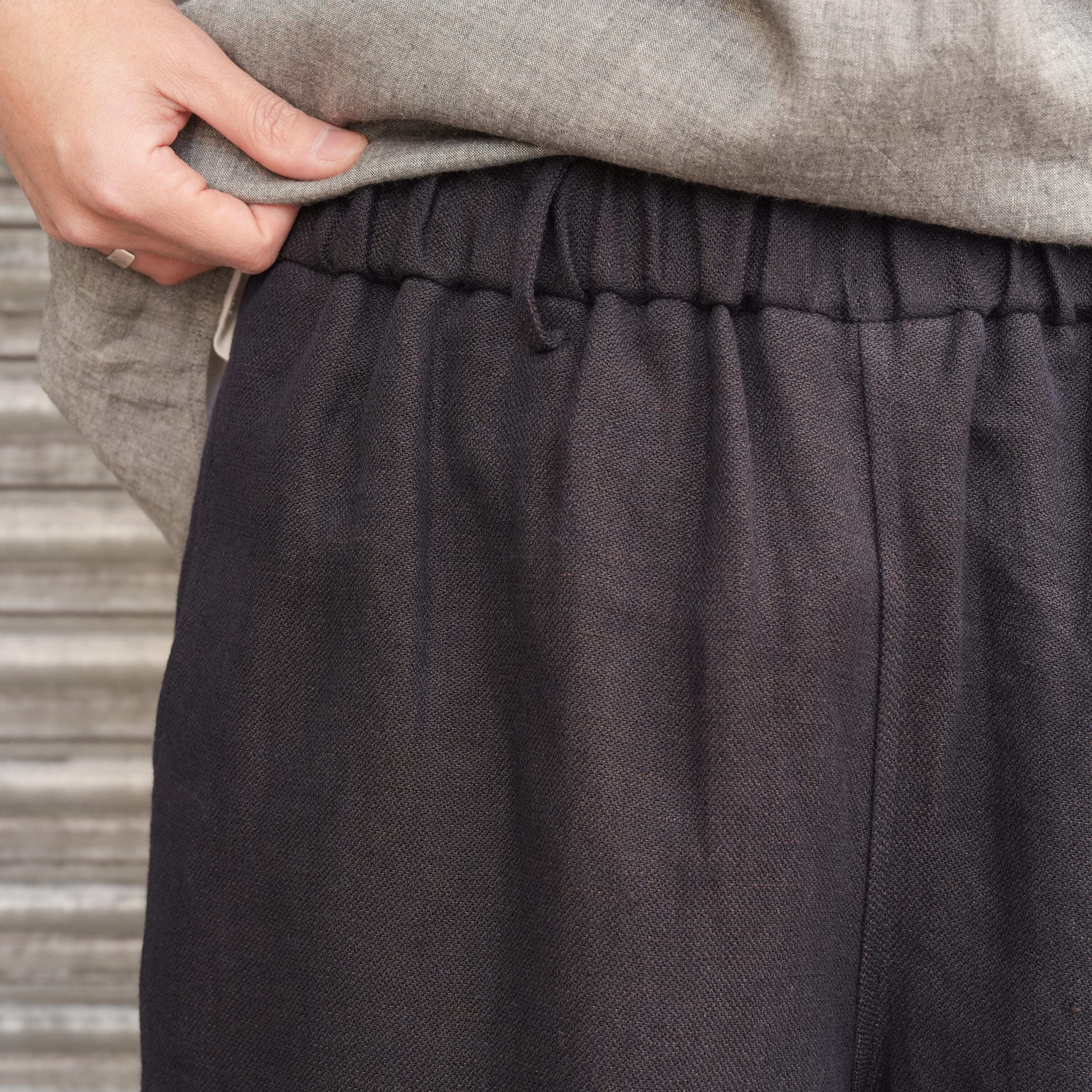 愛知県尾州地方にある近藤毛織工場で織ってもらったリネン生地です。組織はブロークンツイルです。一定の間隔で綾目の方向を切り替えられて織られます。綾目が連続しないため、なめらかでフラットな表情になりました。生地自体がねじれにくく、かつ丈夫でソフトな風合いを持ち、また、糸にかかる力が分散されるため、型崩れしにくく、長持ちします。綾目が出ないことで、肌触りが滑らかになっています。綾織のリズムが断ち切られ、2色の糸を用いることで、独特のテクスチャーが生まれました。