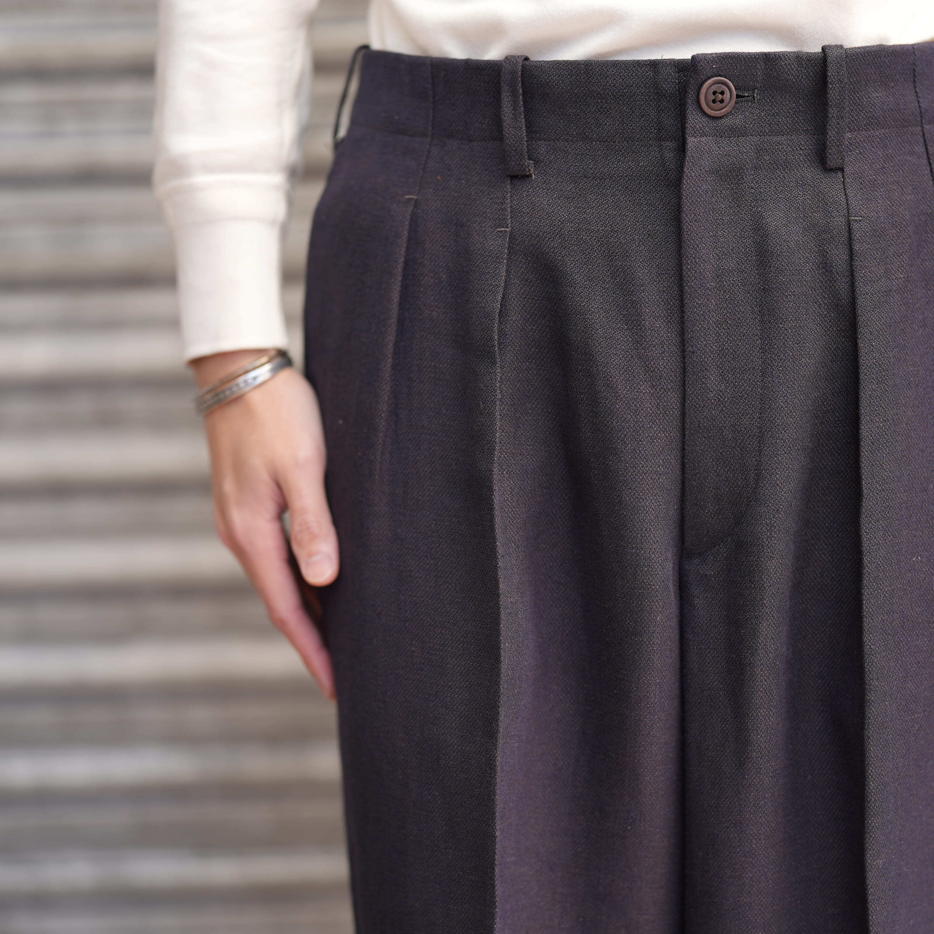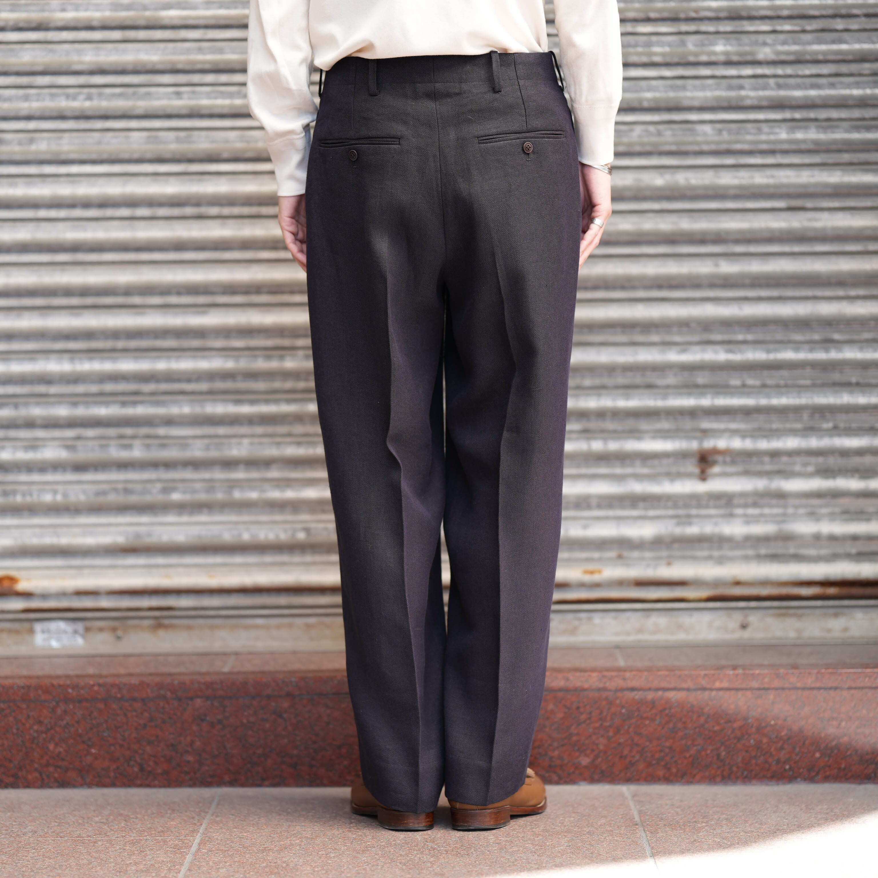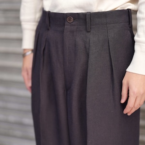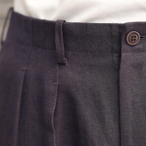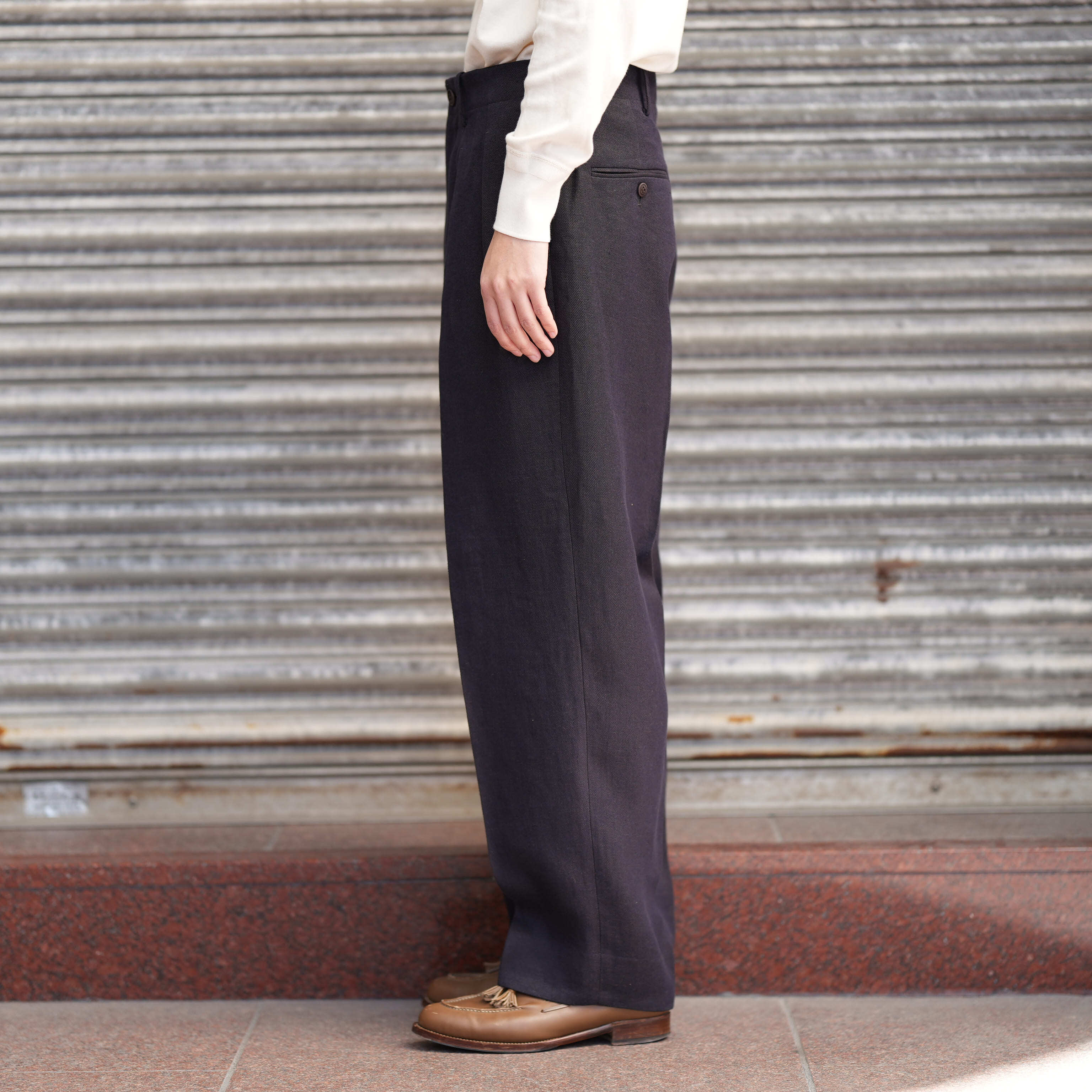 ベルリン在住時に作った形が今でも継続しています。2本のタックをとり、内側に倒すことでフォーマルな印象を持たせています。生地がしっかりと落ち、ワイドながらもすっきりとしたシルエットを形成しています。