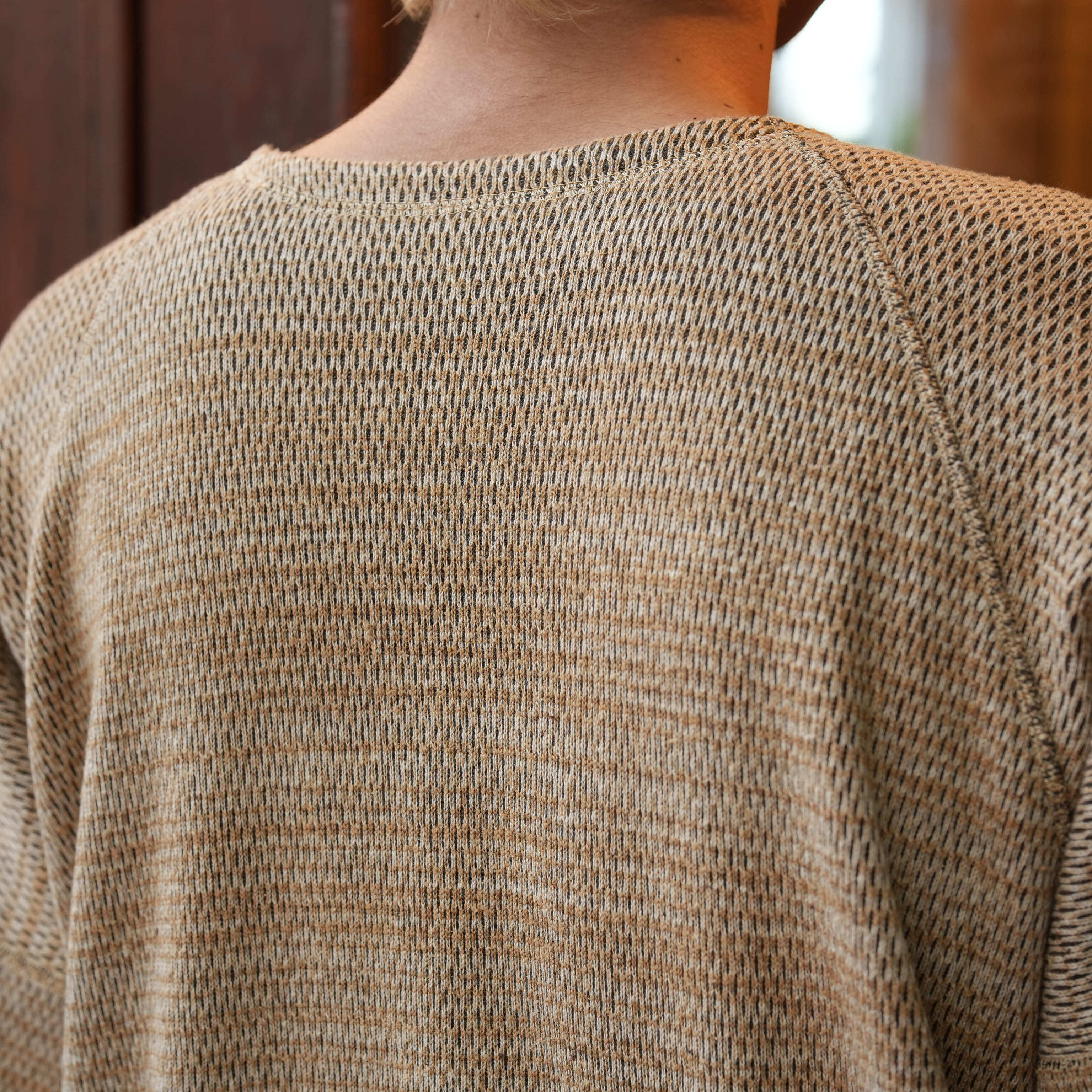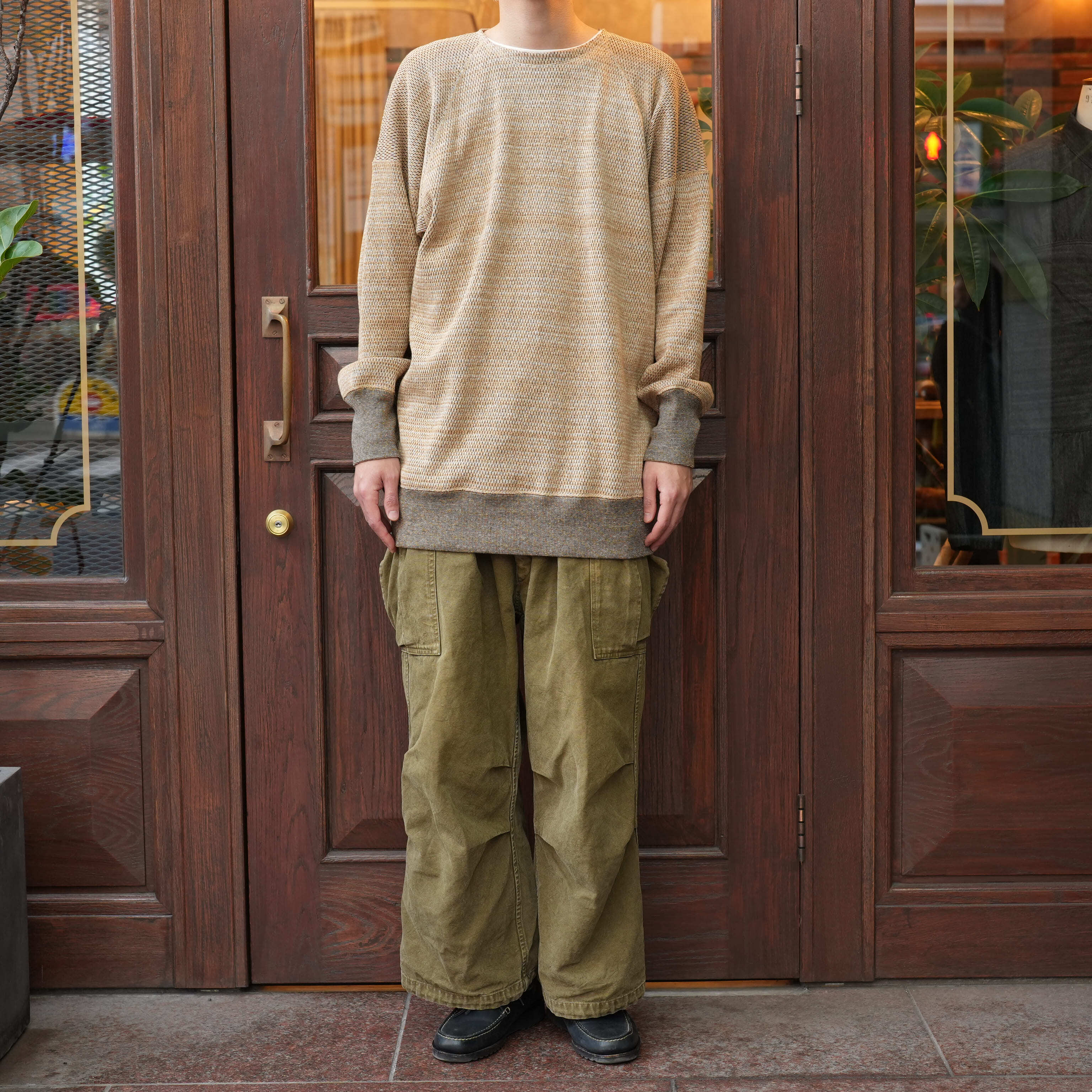 この奥行きのある色味もよく、インナーとしてチラッと見えた時も洒落ていて、それぞれ今の時期のスタイリングに必要になってくる色味かと思います。脇ガゼットや特徴的なラグランスリーブとストレスのない着心地だけでなくデザイン的にも目を惹くものがあり、サイズバランスも絶妙なので1枚で着た時の雰囲気も非常にいいです。