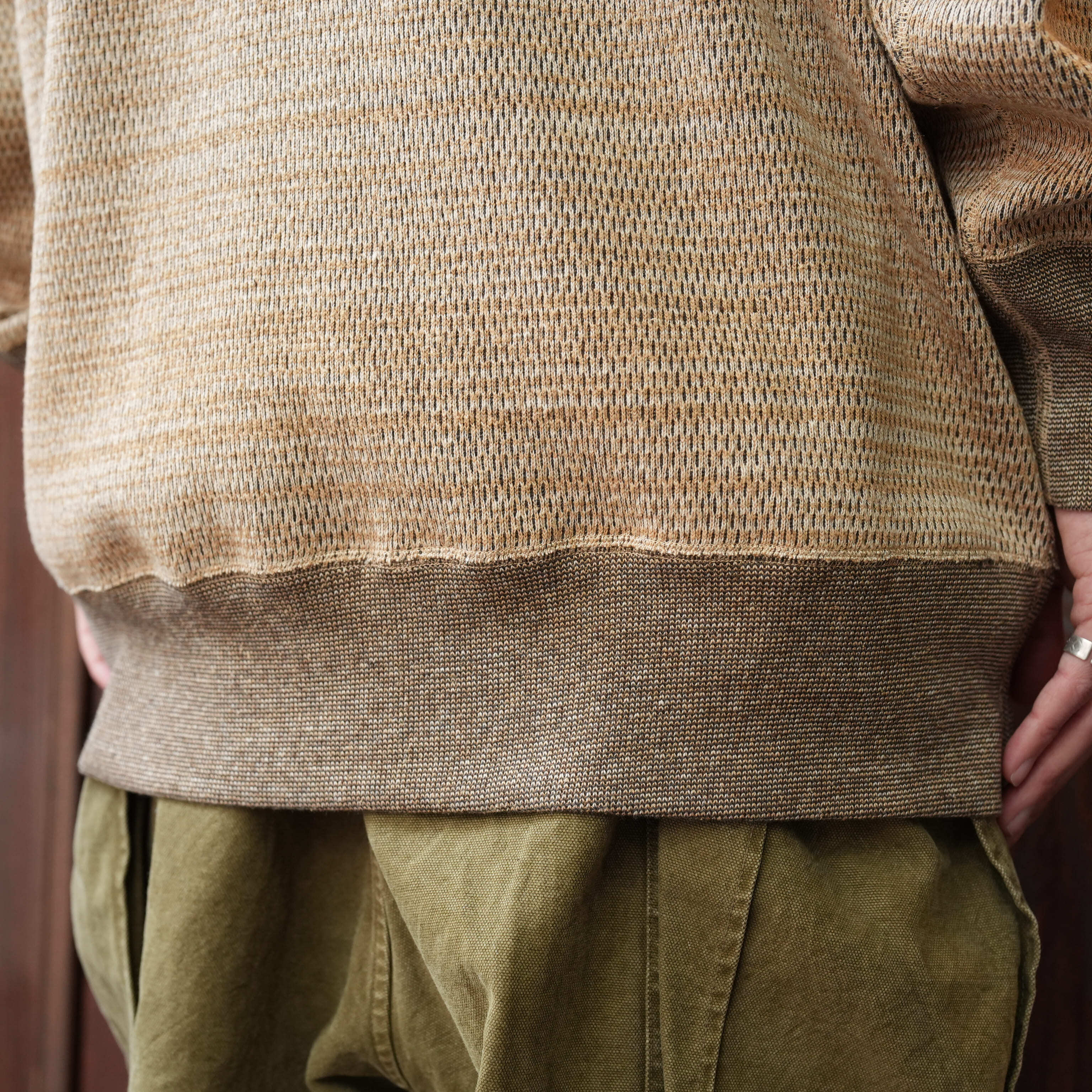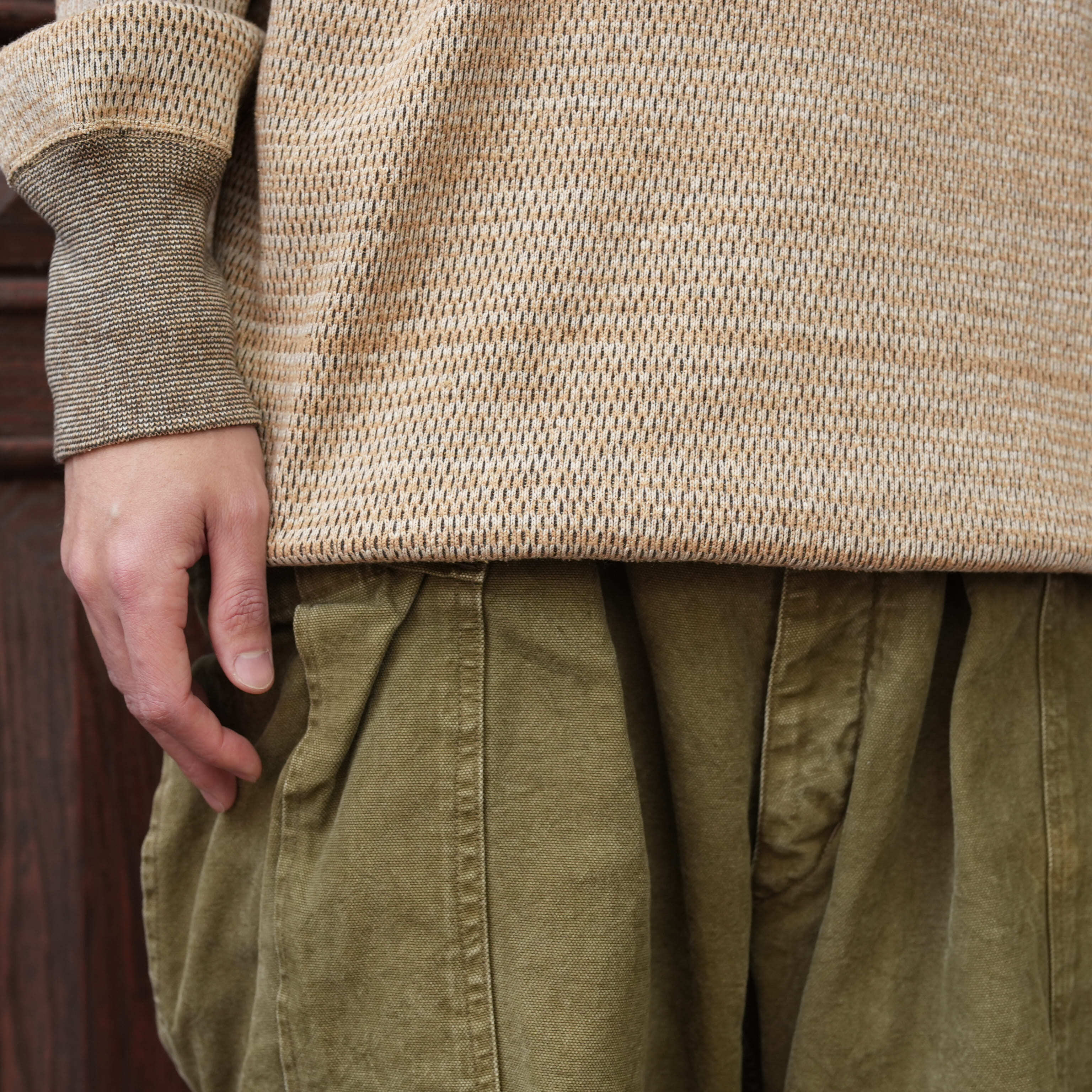 見た目としての雰囲気も充分に良いですが、着たら良い、まさに着れば分かる、そんな言葉が似合う1着です。シルクが混紡されており、柔らかくて着心地は抜群に良く、あるとついつい手に取ってしまいそうな心地良さ。勿論OLDEといえばの、そしてこの素材の掛け合わせによる、着て洗った先の変化もとにかく楽しみです。