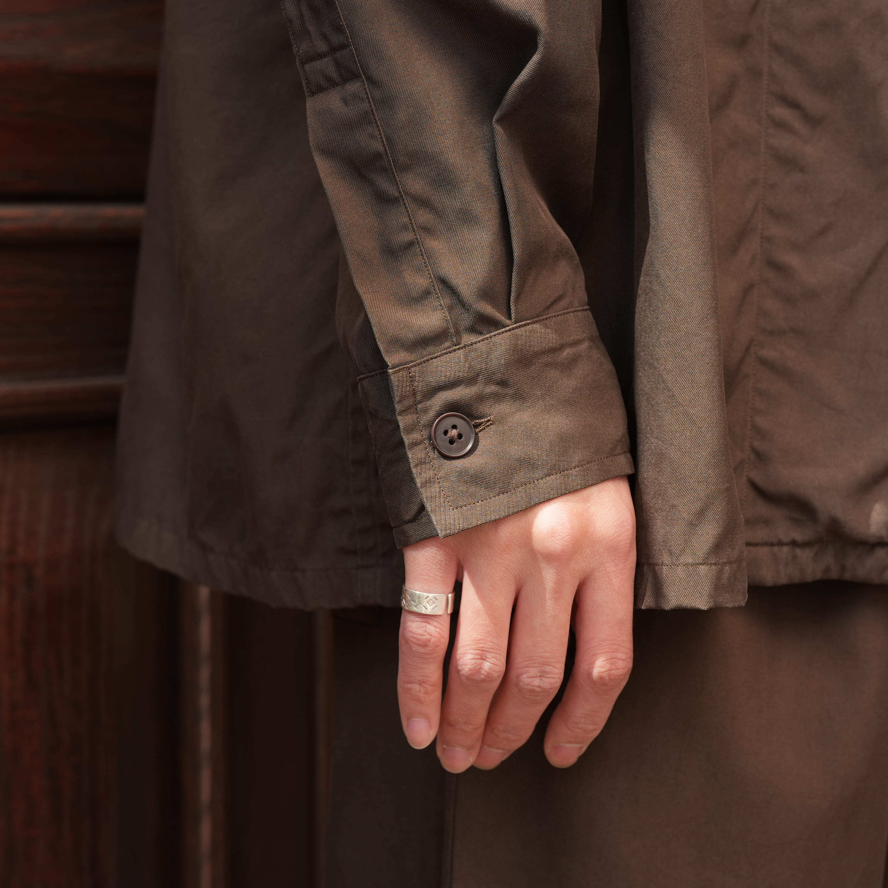 世界最高峰のBRATACシルクフィラメント糸を存分に使用し、シルクスパン糸と高密度に打ち込んだシルク100%ギャバジンで、しっかり洗い込み、微起毛加工を施してあります。