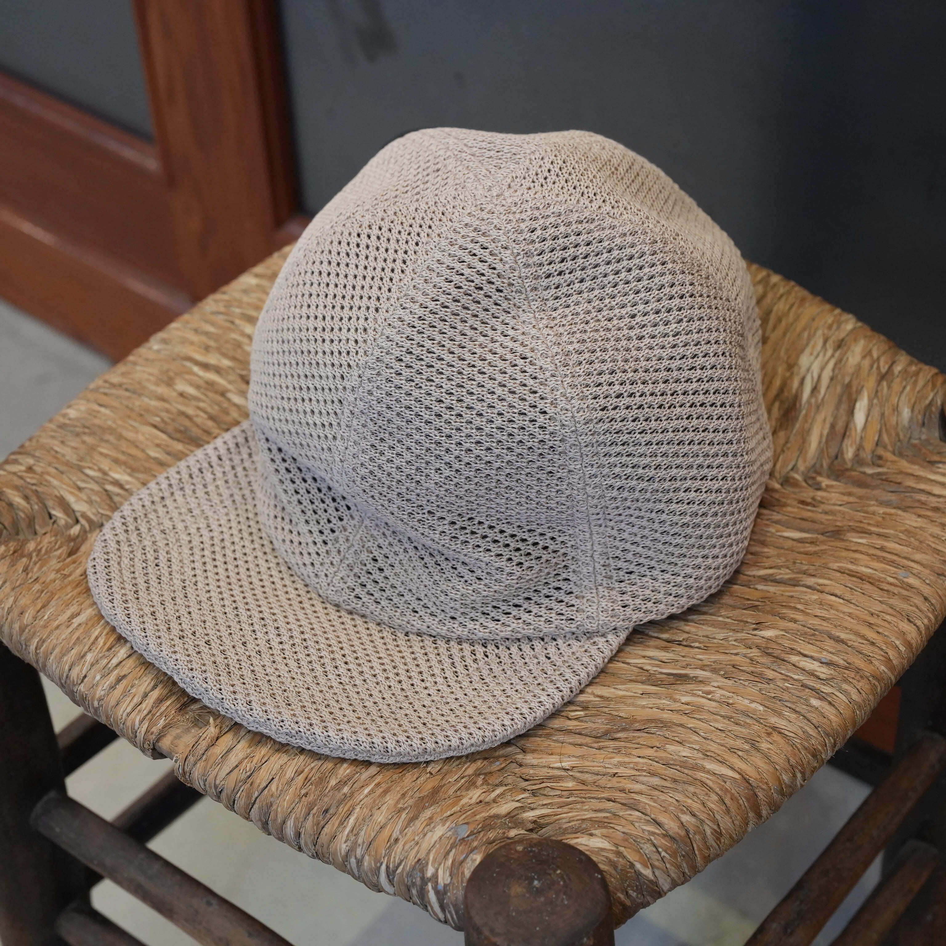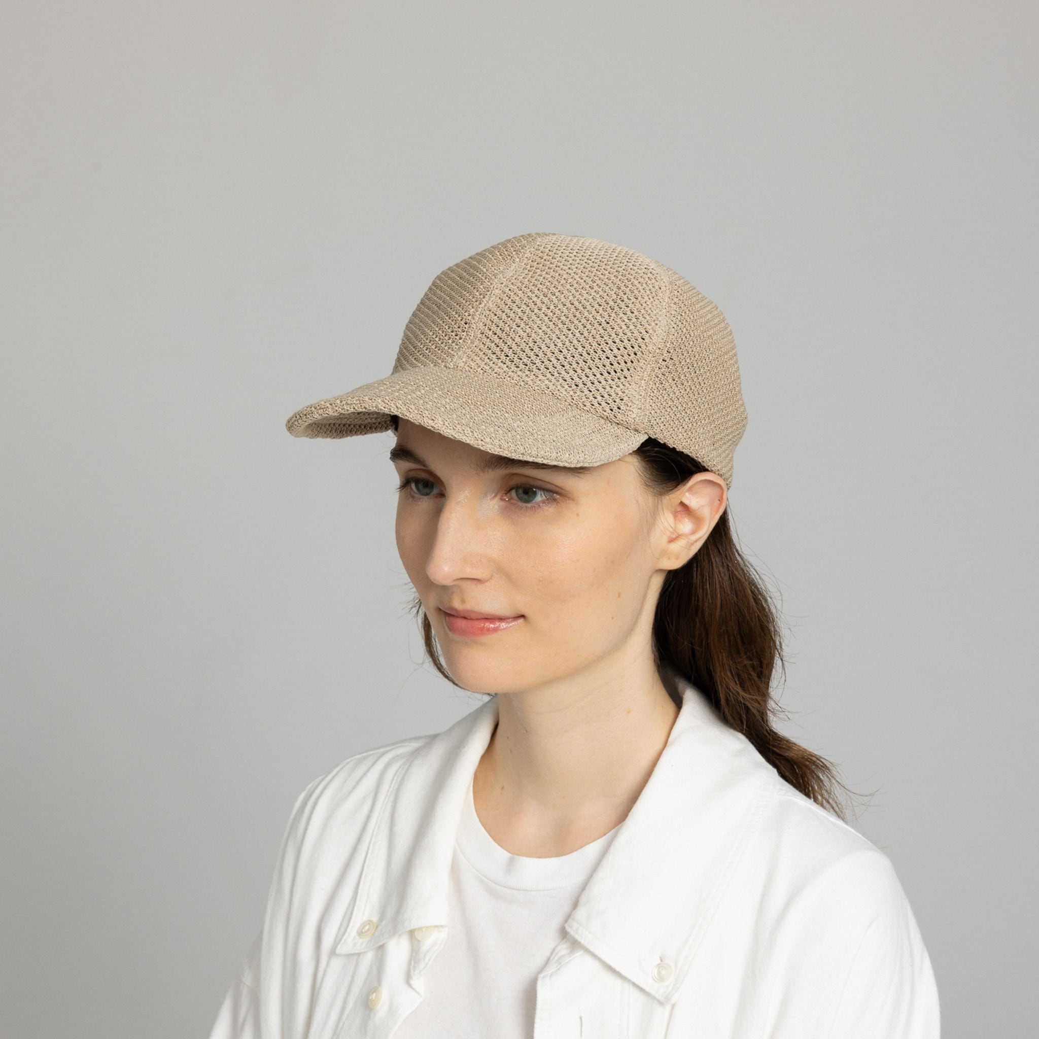 麻のような風合いと程よい透け感で、涼しげな印象に仕上げたキャップ。軽やかさを感じる柔らかな素材感とツバの長さが、性別を問わず被りやすいバランスをつくっています。裏地にはオーガンジーを合わせ、さらに清涼感をプラス。レザーベルトは使うほどになじみ、自然な風合いが深まります。