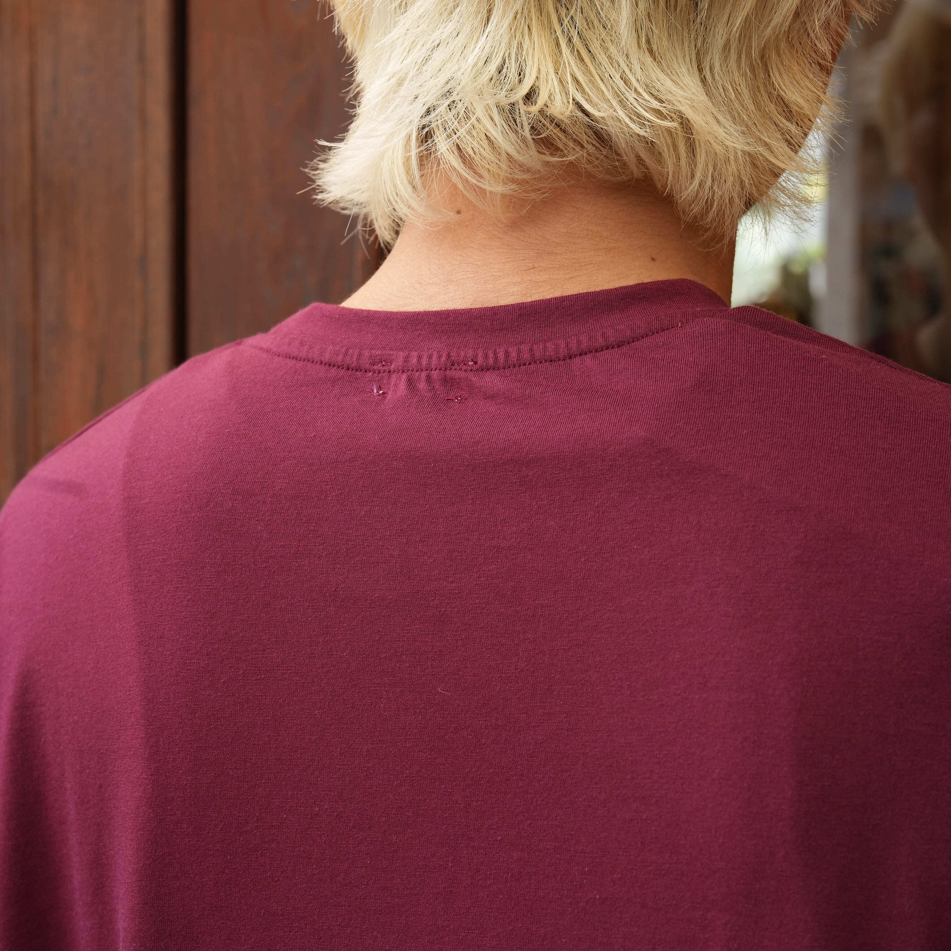 <FOUNDOUR>の定番のポケットTeeは、1980年代に見られたTC素材のアイテムをリファレンスにしています。ネックは前回までコットンのリブを使用していましたが、今回はボディと同じ天竺素材を用いて統一感のある仕上がりにしています。簡単そうに見えますが、実は工場のアイロンワークが秀でてないと、ここまで美しくなりません。他にも、肩や脇下はロックミシンで細かくステッチを打っているため、着たときのシルエットが柔らかくなり、肌当たりが優しいのも特徴です。裾も技術を持った職人さんの手によって、天地縫いで仕上げてもらい、ヴィンテージの仕様を踏襲しています。極め付けはポケット。従来通り、内縫いと呼ばれる表にステッチが出ない方法で取り付けていますが、あえていびつに仕上げ、美しくなりすぎないようにオーダーしています。シンプルな1枚だけど、人の手によってつくられていることを感じてもらえたらうれしいです。