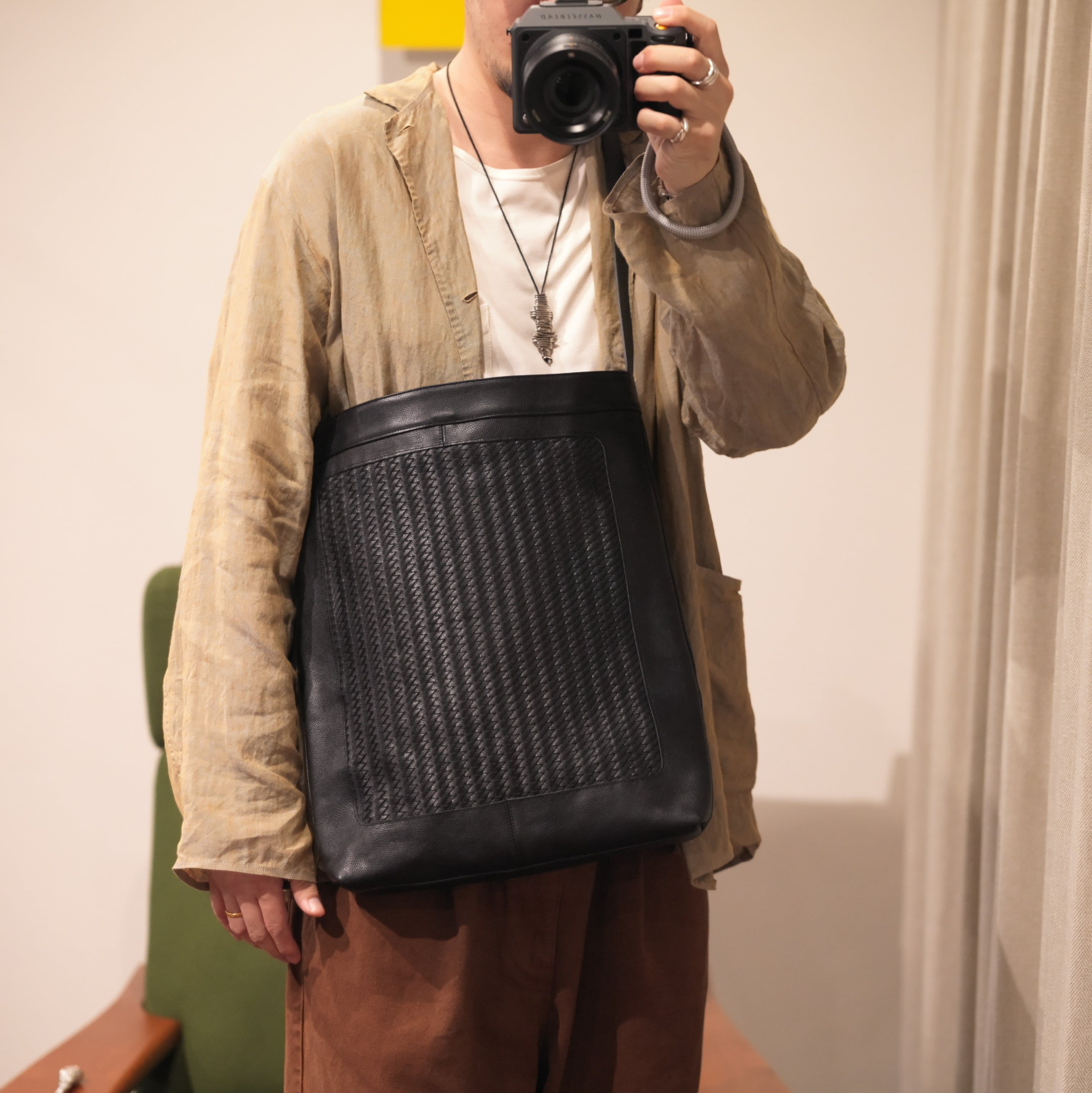 縦型トートの中央に枠(パネル)を配置したデザイン。そこに今回はハンドツイルメッシュをめ込みました。