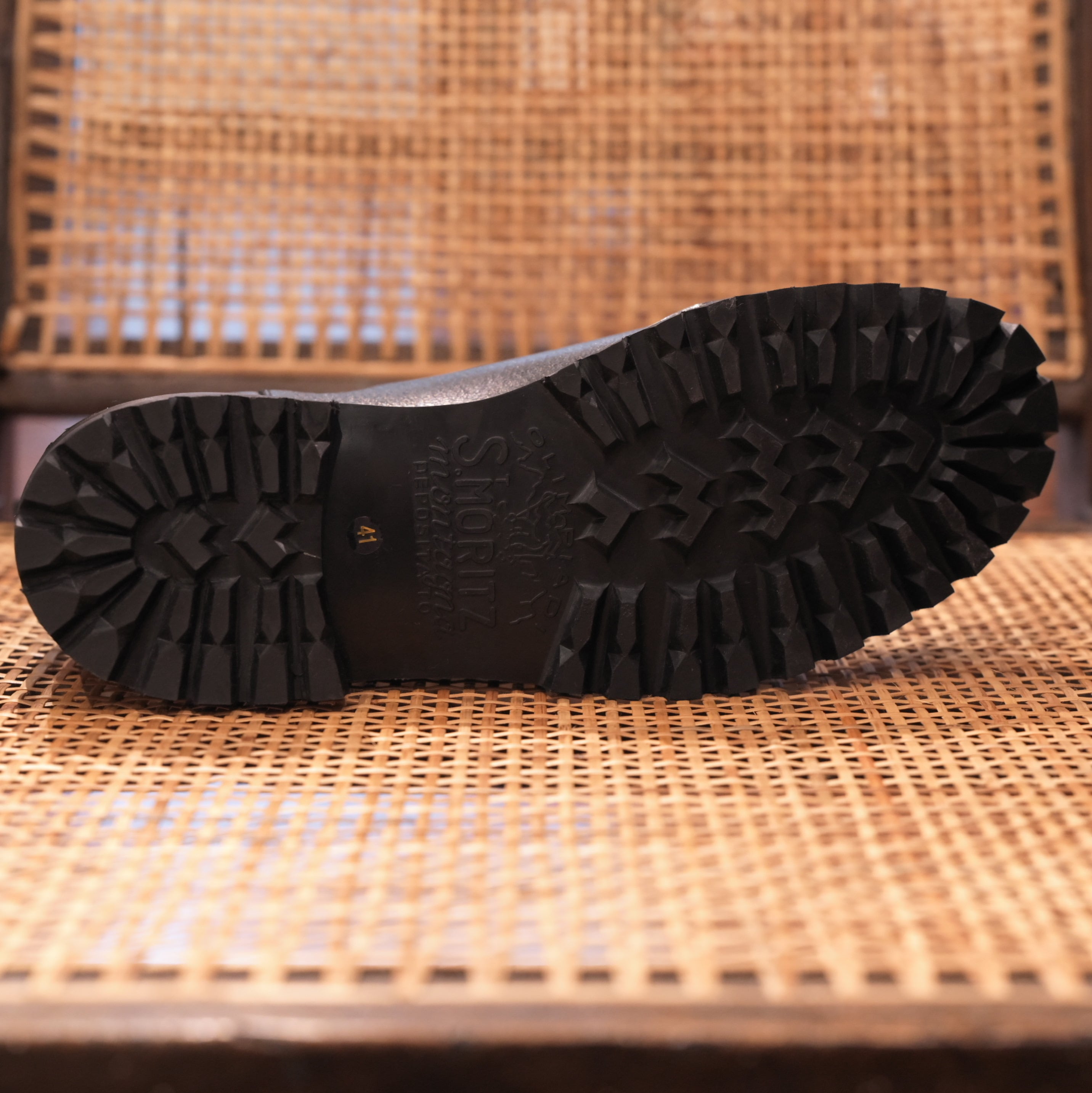 アッパーにはマロキッド(山羊革)素材を使用、細かなしわの表情と光沢感があり、メンテナンスフリーでタフにお召しいただける素材です。イタリアのソールメーカー、サンモリッツ社のラバーソールを採用、本格的なトレッキングシューズにも使われるプロ仕様の登山用ソールで、抜群のグリップ力が魅力、トゥスプリングがやや反り上がっているのがポイント。