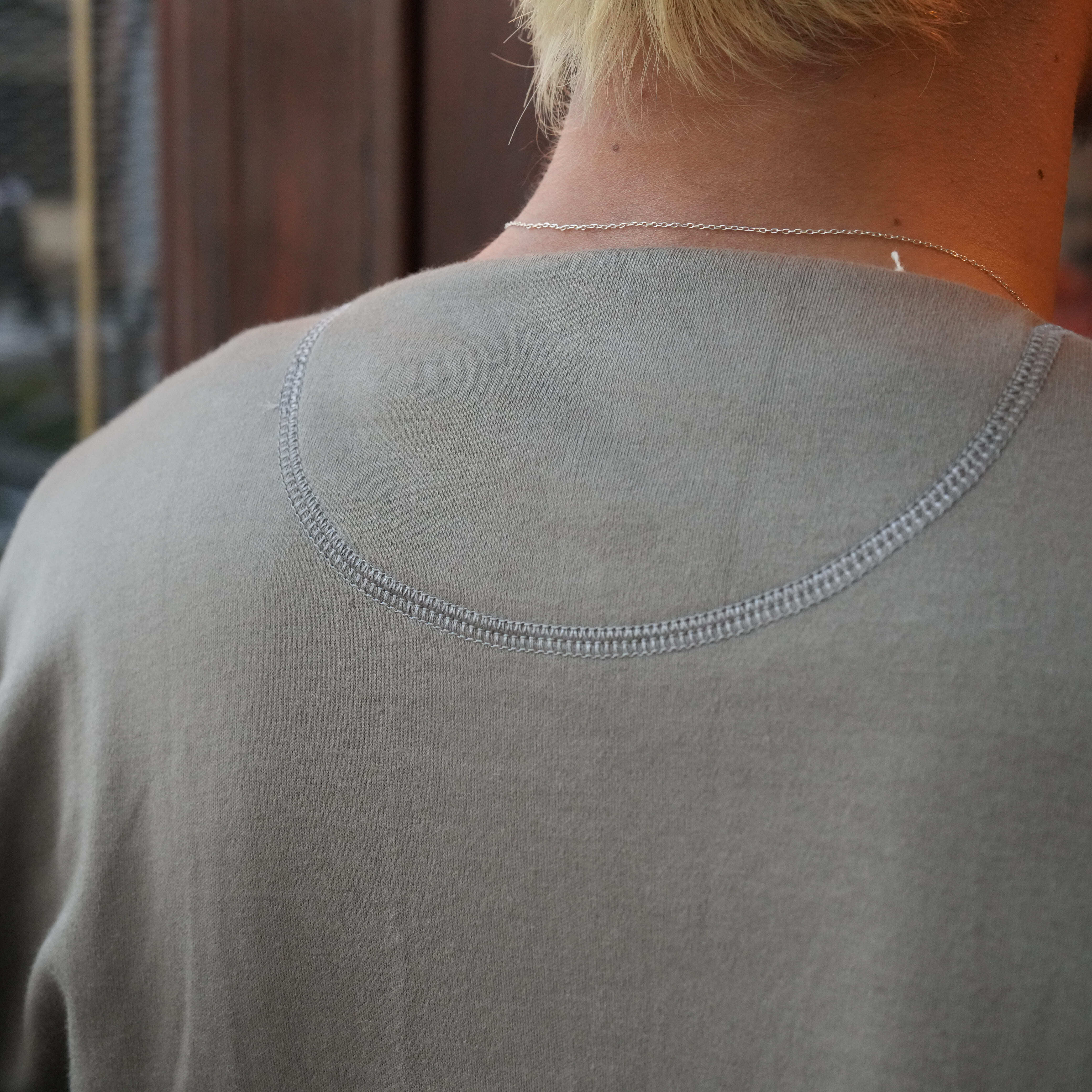 デザインはヴィンテージのアンダーウェアベース。首裏の2重構造やあぜ編みリブ、などのヴィンテージを感じるディテールに、美しいステッチが目を引きます。体のラインが出過ぎないシルエットとデザイン性で、単なるインナーというだけでなく、上質なロンTという印象も受けます。上着を脱いでも寂しくなるということはありません。