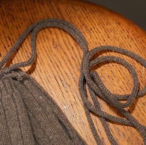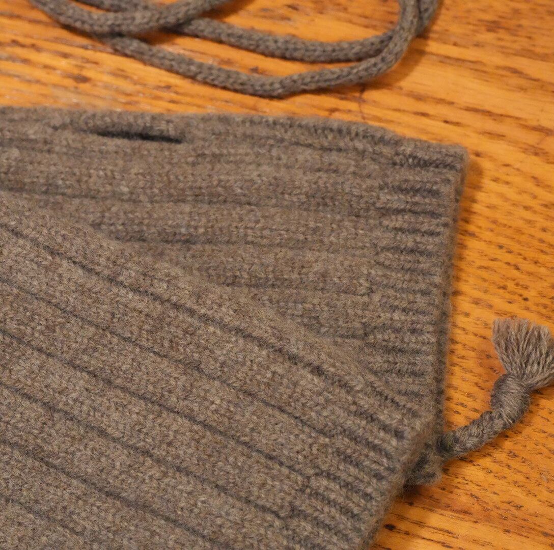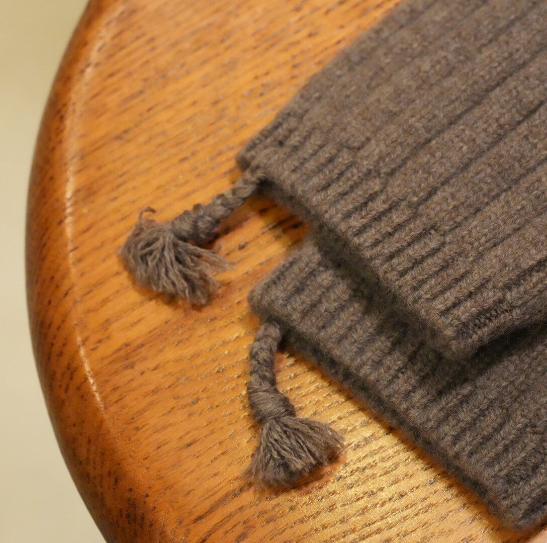 ミトンのようなレトロで可愛らしい印象のひも付きアームウォーマー。厳選したオーストラリア産メリノのエクストラファインラムズウールを用い、軽やかで優しい肌触りです。ひもは取り外し可能。ワンポイントとして小指側に三つ編みを付けました。