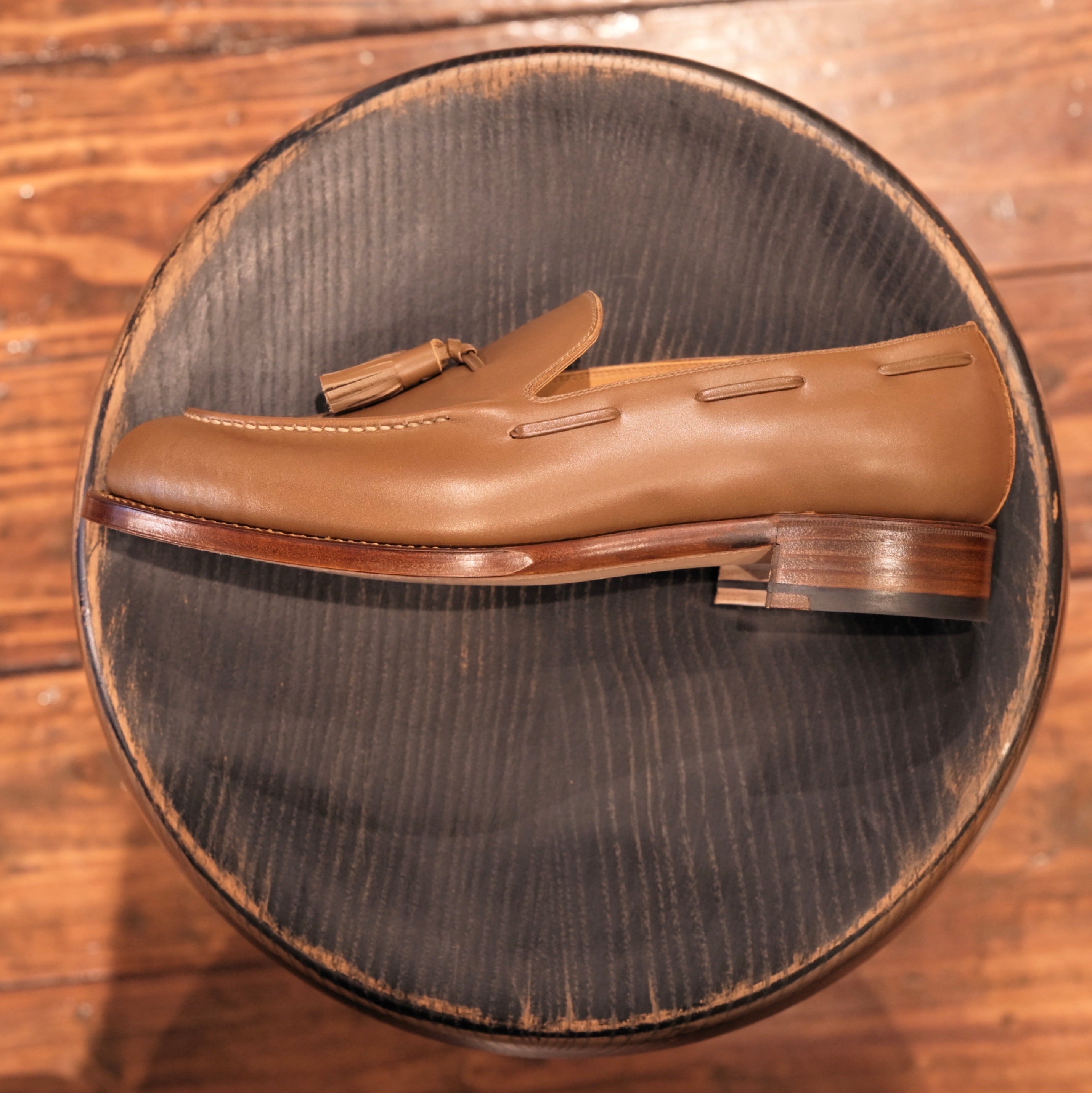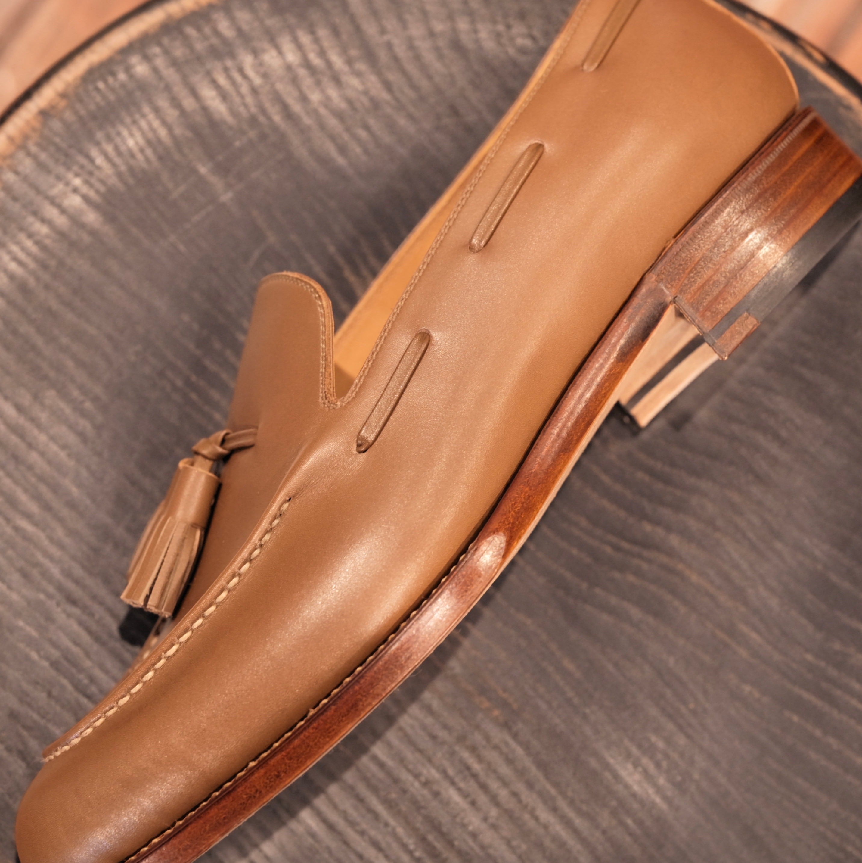 22ssに制作した118のタッセルローファーは、プレーントゥでタッセルも大きめというモデルでした。今回は定番のコインローファーのようにハンドモカを加え、タッセルも通常サイズのバランスに。作り方は同じく、細かく1本1本スリットを入れたものを巻き巻きしてタッセルにしています。