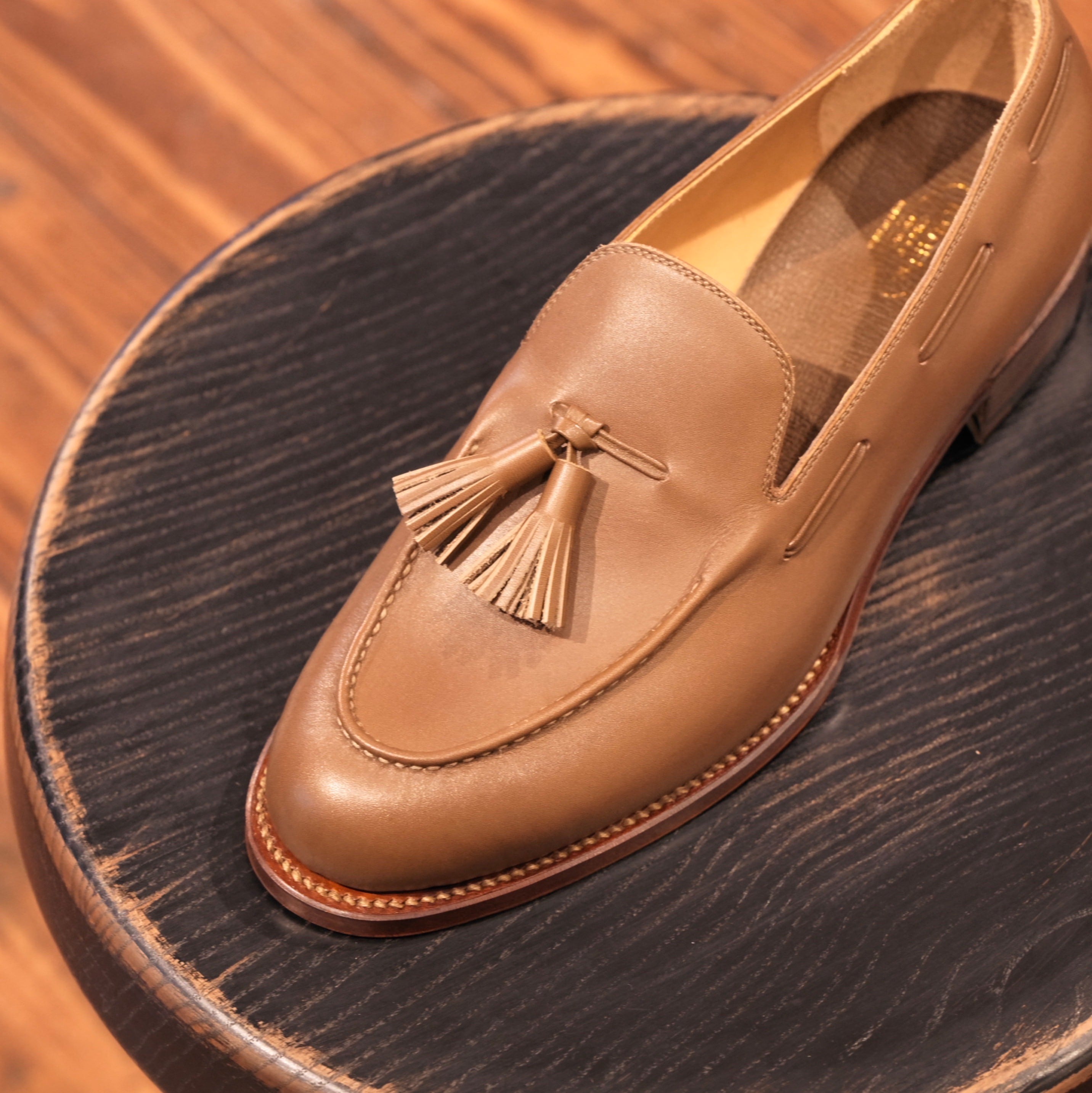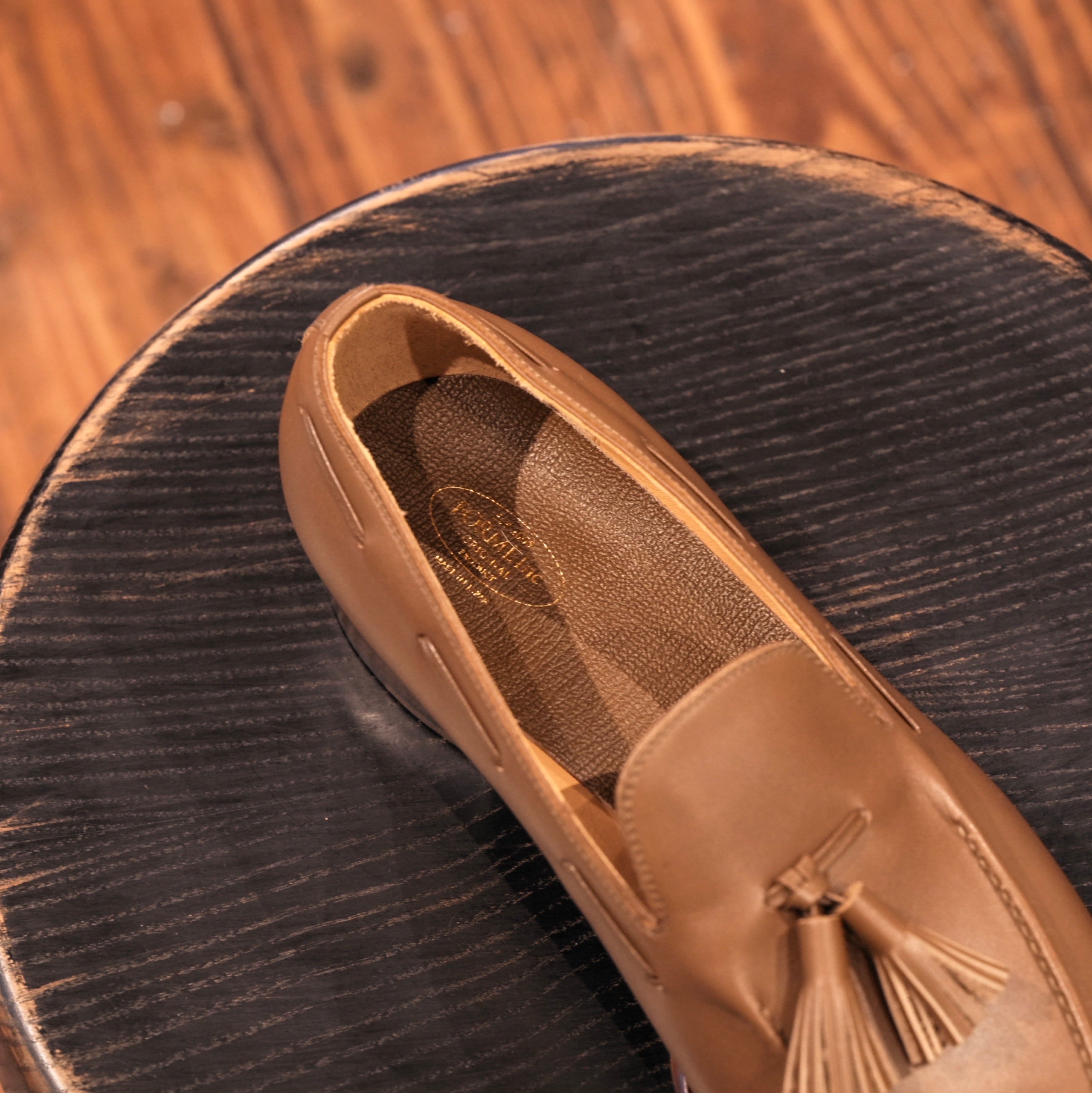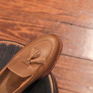 フォルメの中でもシュッとした印象のNo.12の木型を使用。スタイリッシュで美しさを感じられるフォルムは細身のスラックスやセミワイドのパンツなどと相性がいいだけでなく、当店としてはワイドなシルエットのパンツに合わせた感じもオススメで、ミリタリーパンツに合わせた無骨な感じも非常に良いです。モカ部分は職人による手作業によって仕上げられており、手間を惜しまずに作られた1足からは作りの丁寧さや美しさを感じます。程よいボリューム感があるタッセルによって立体感や動きのある表情が加えられ、スッキリとしたフォルムに対していいアクセントになっています。